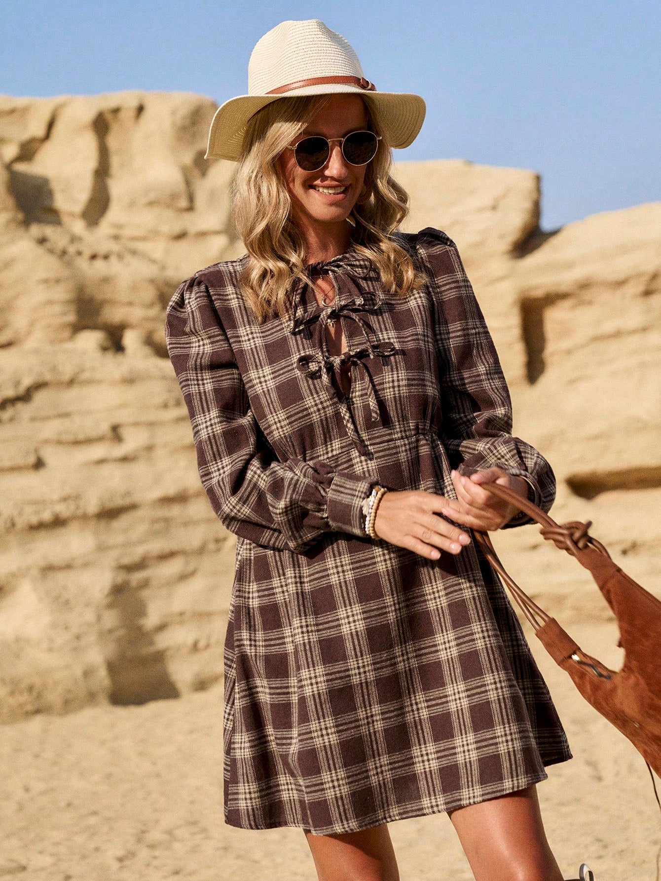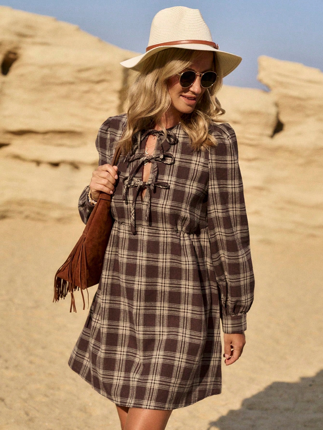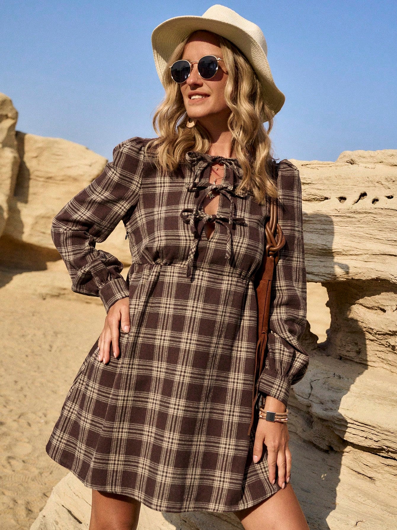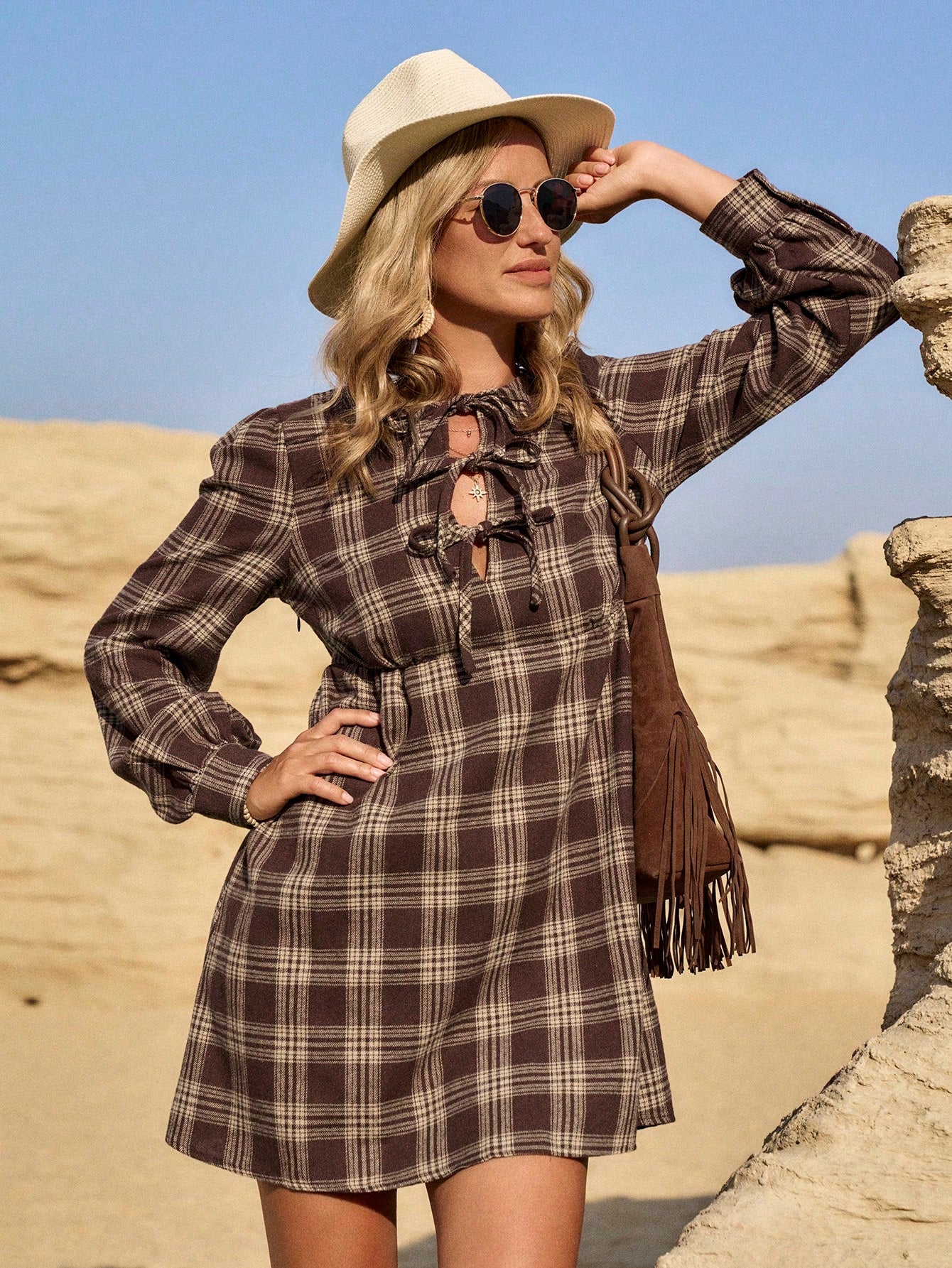 LanaWest Women's Country Music Festival Khaki Plaid Long Sleeve Dress With Unique Design Fall Cloth