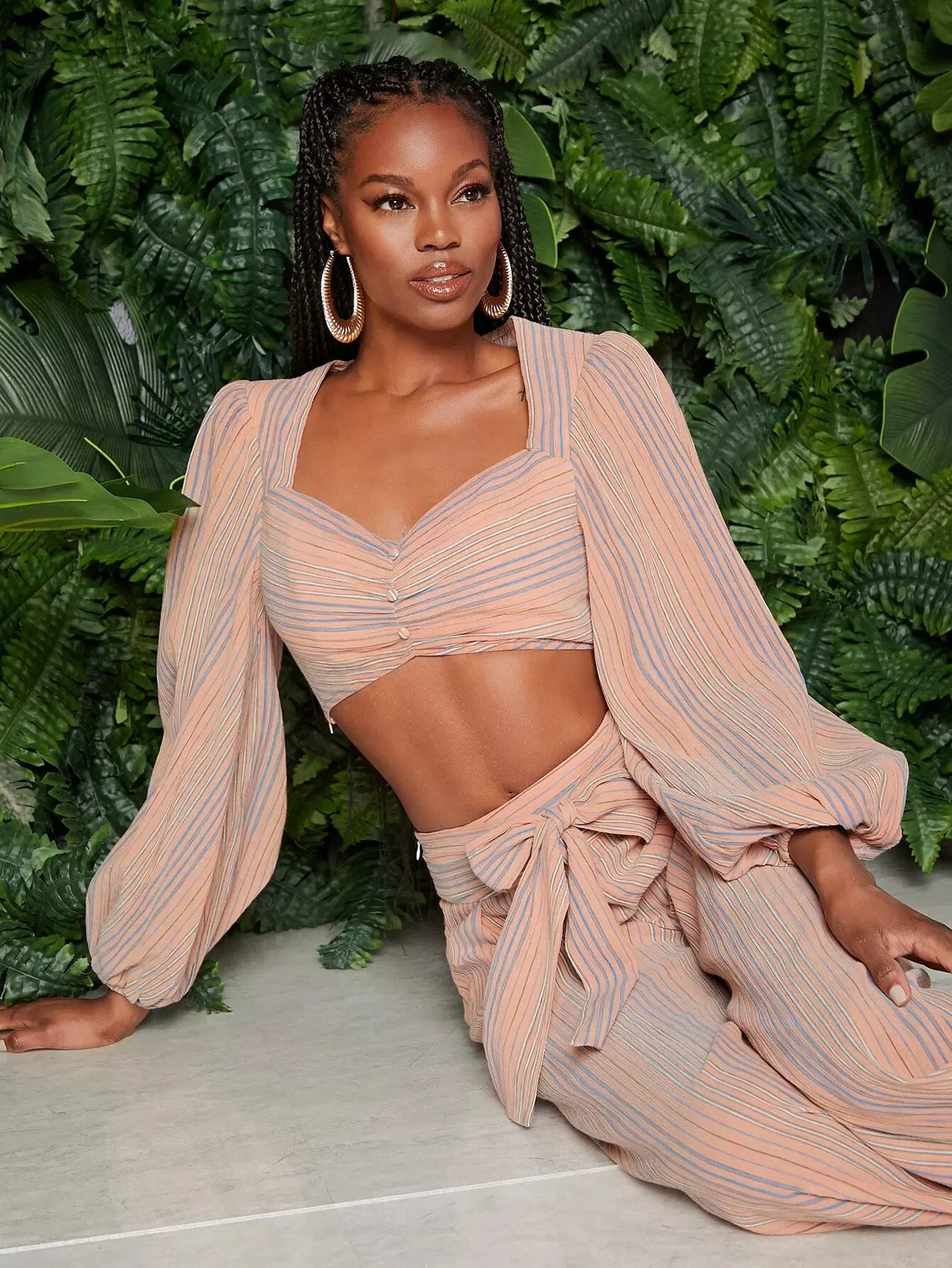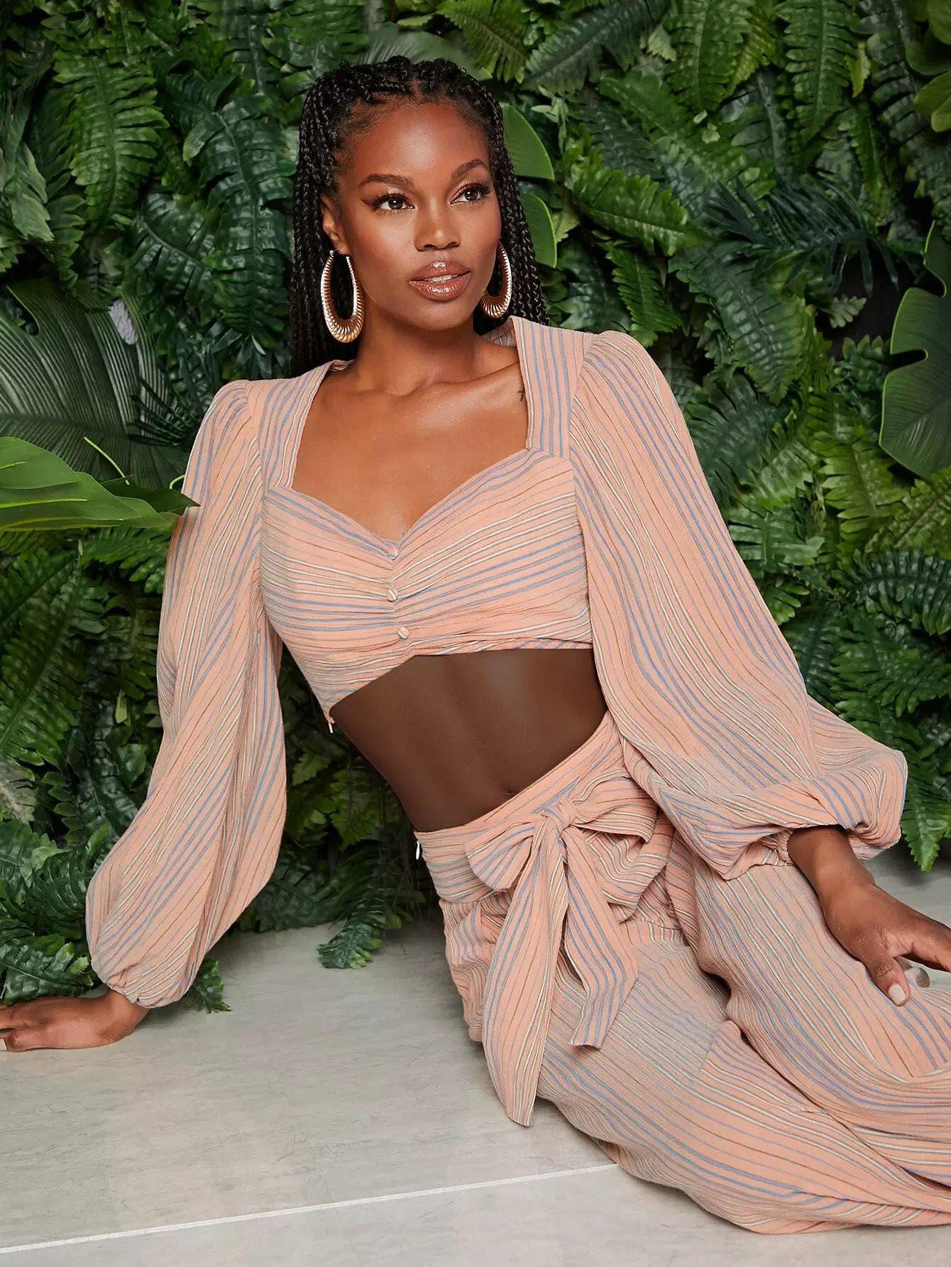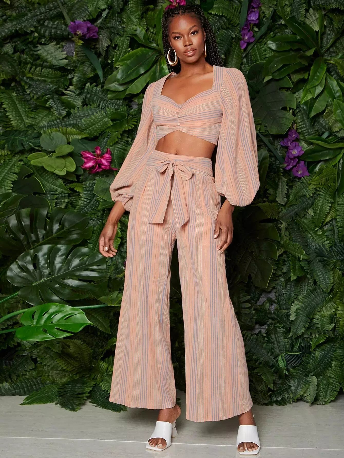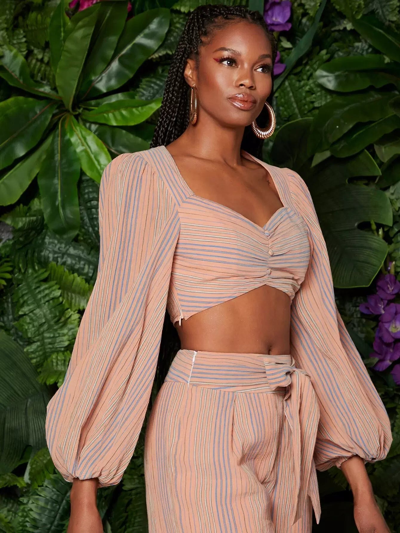 Lantern Sleeve Button Front Striped Crop Top