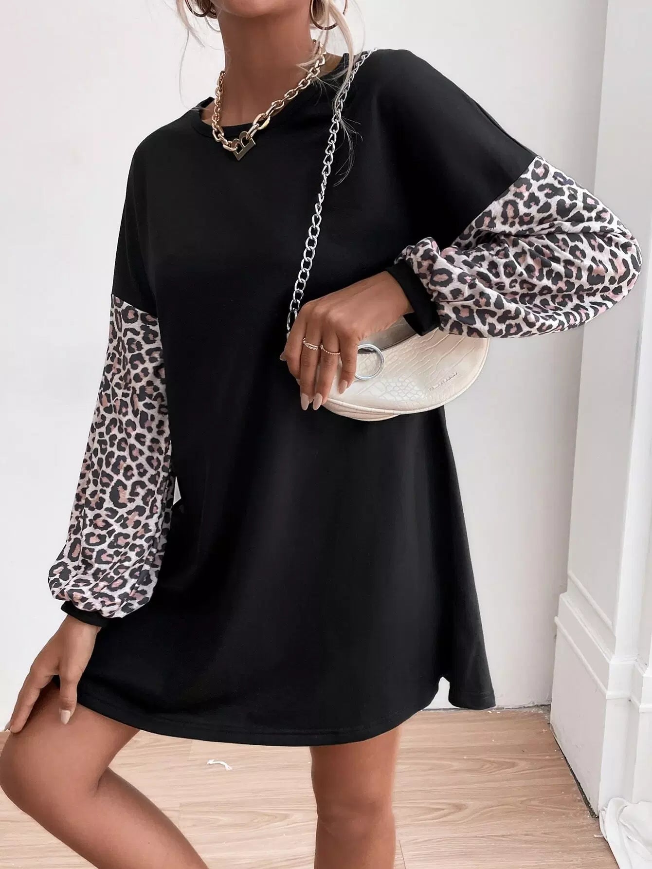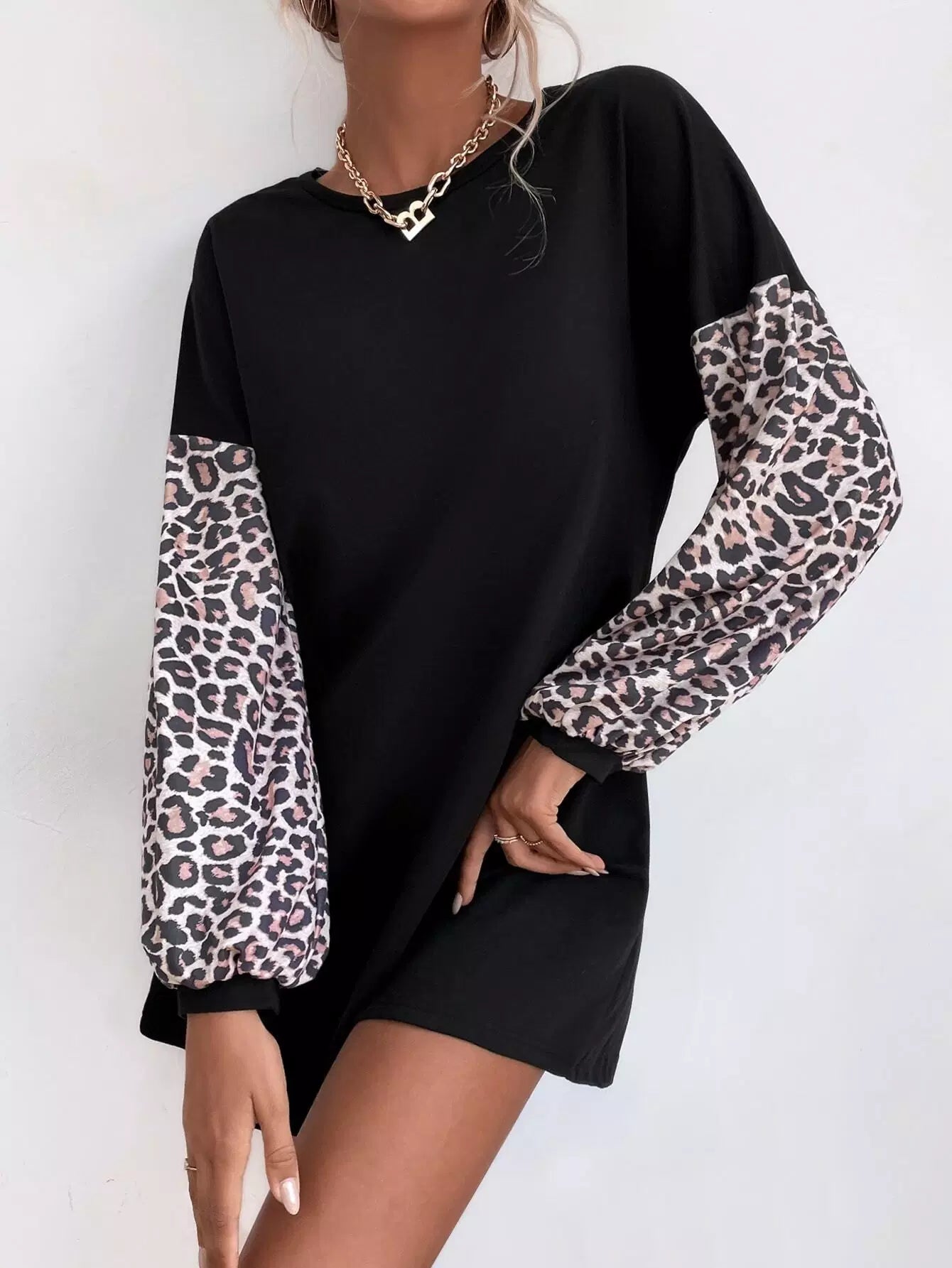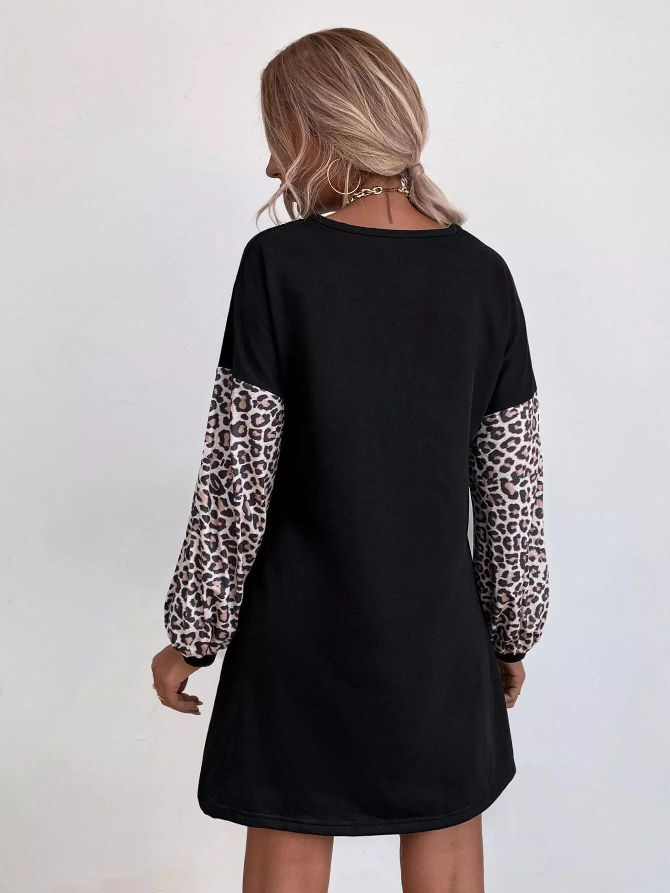 Leopard Panel Drop Shoulder Colorblock Sweatshirt Dress