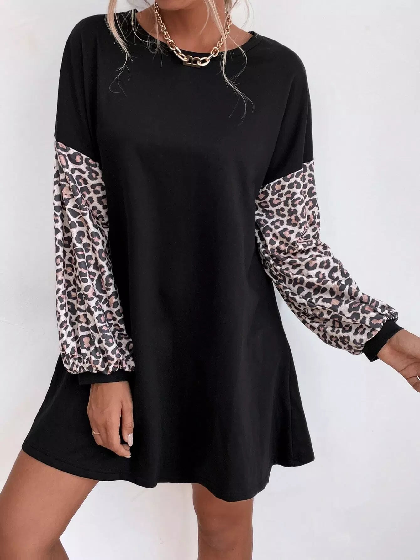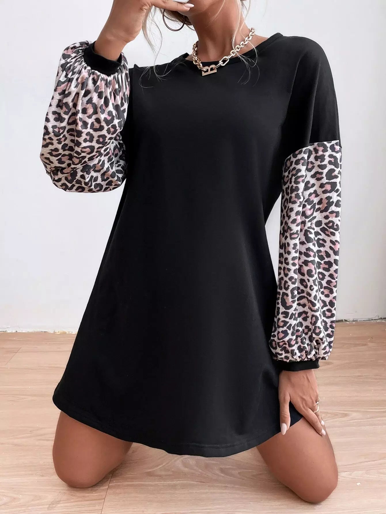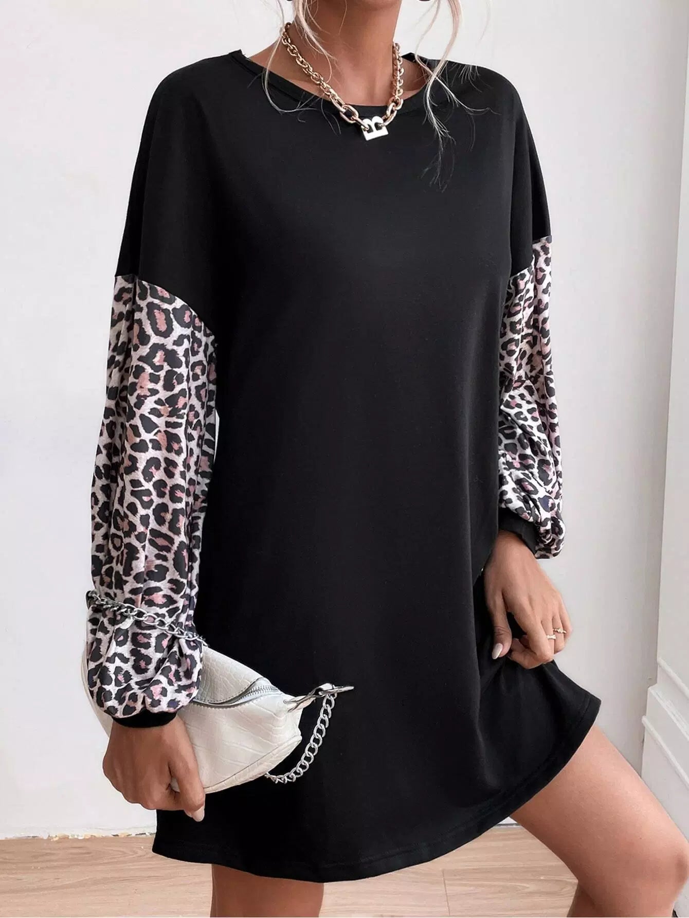 Leopard Panel Drop Shoulder Colorblock Sweatshirt Dress