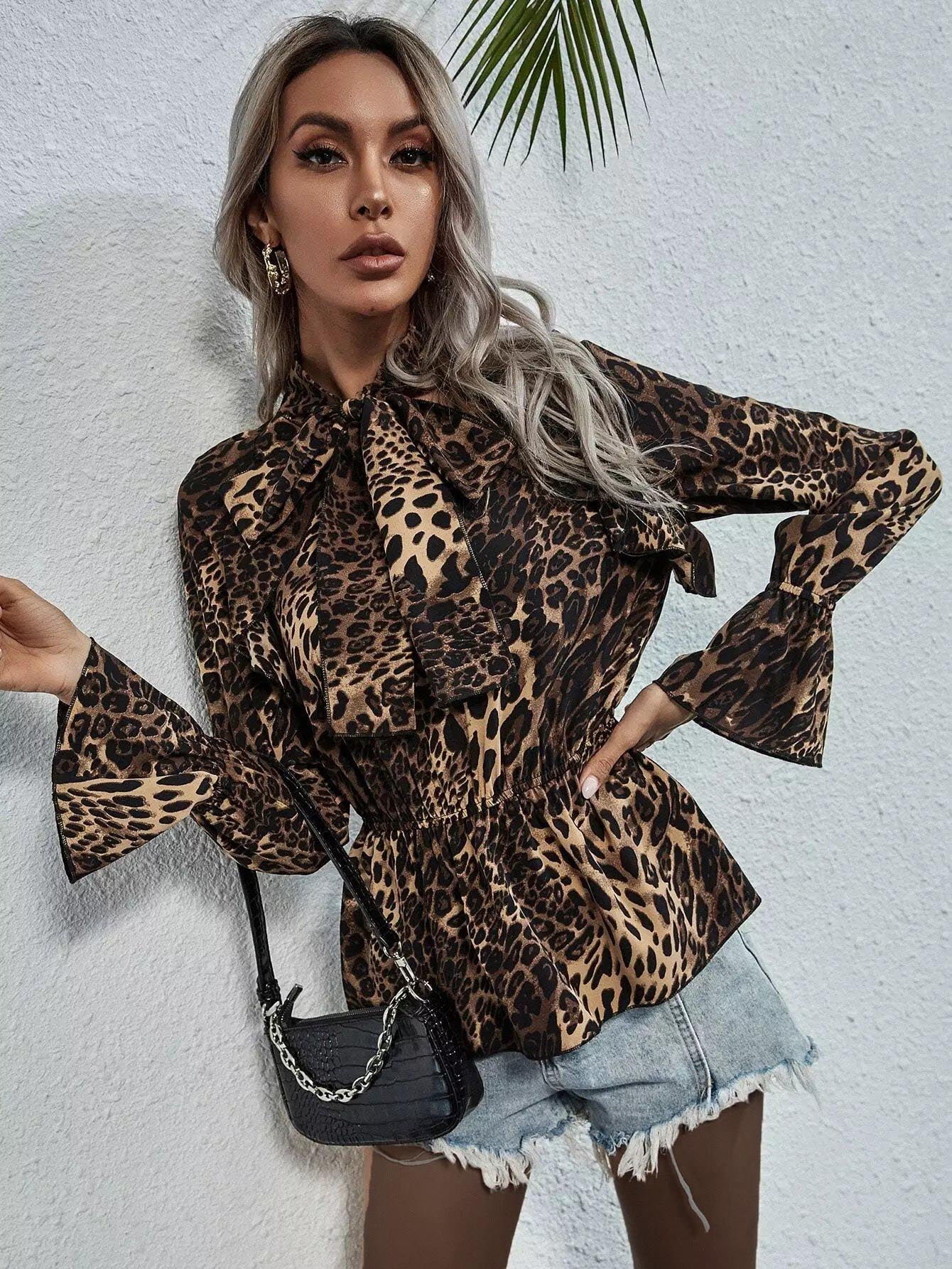 Women - Leopard Tie Neck Smock Blouse