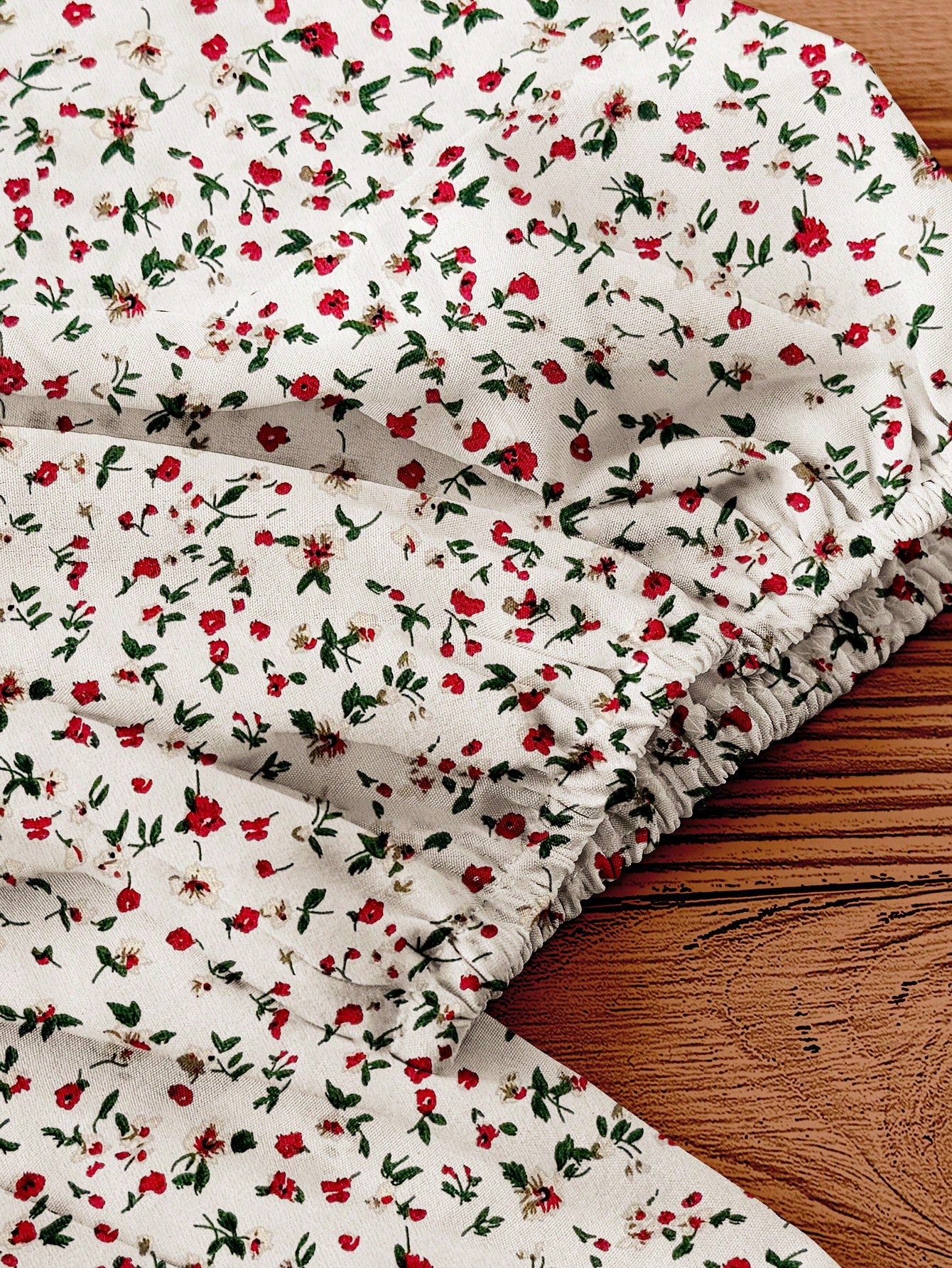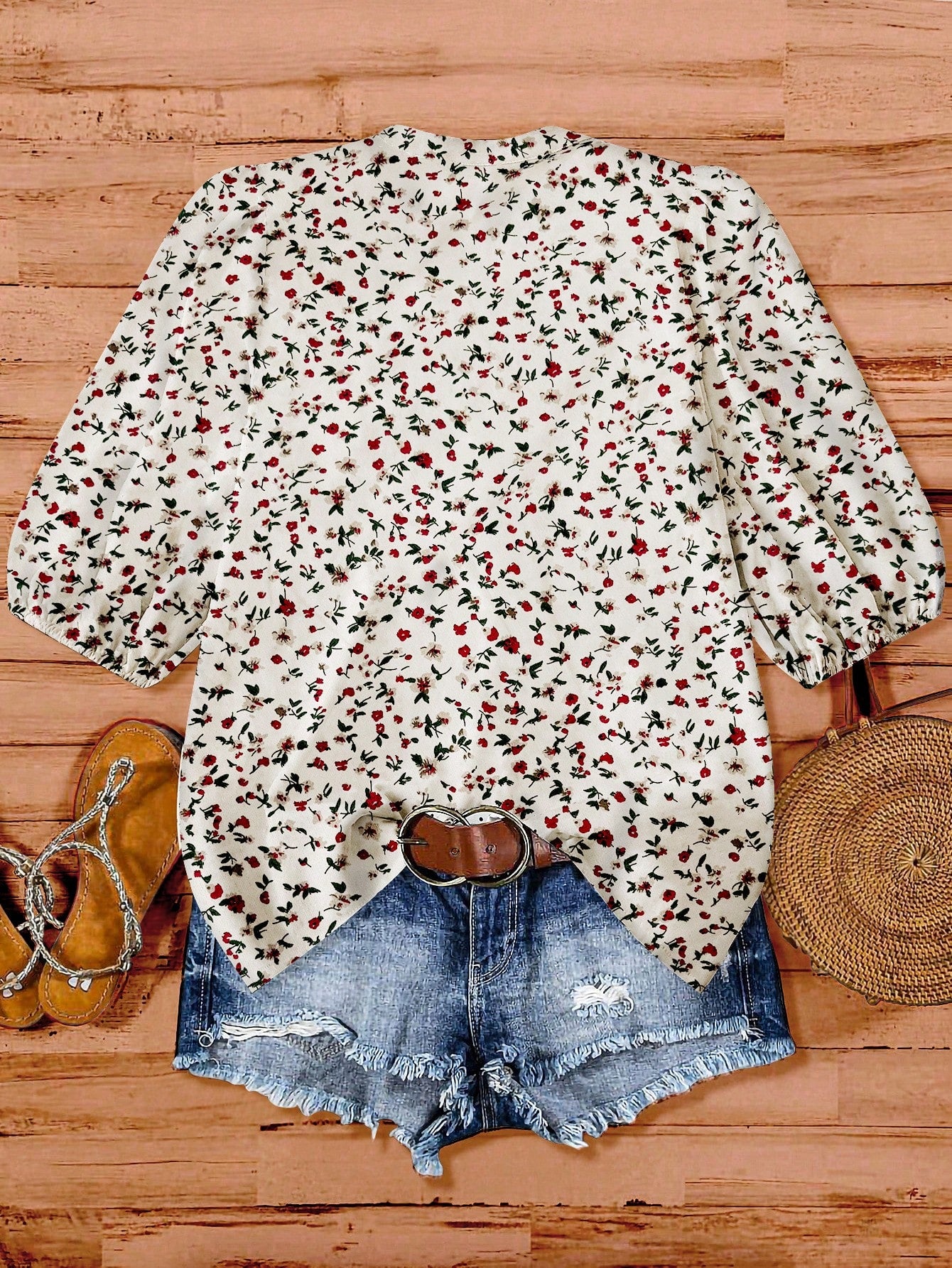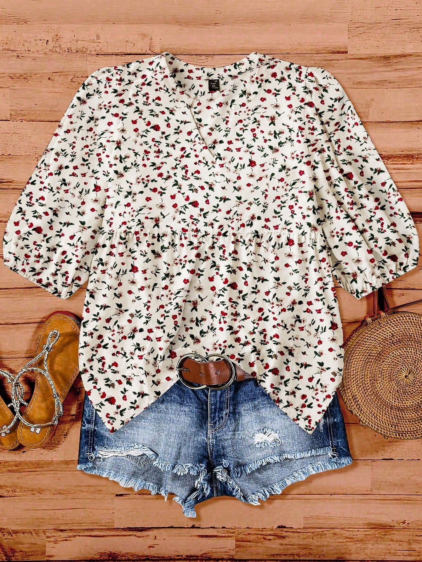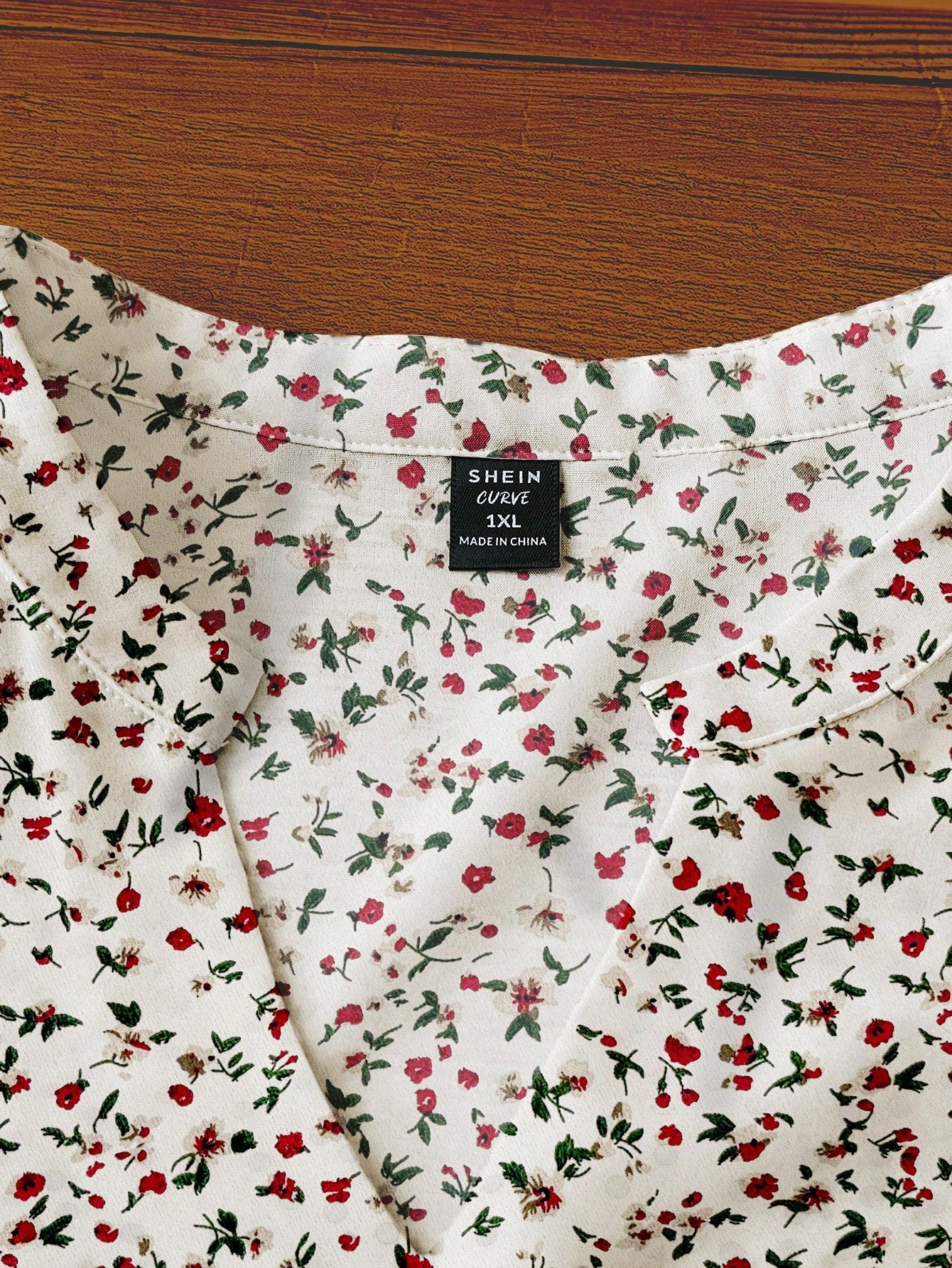 Linhara Plus Size Casual Vacation Beach Ditsy Floral Cut-Out V-Neck Lantern Sleeve Elegant Romantic
