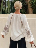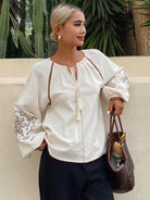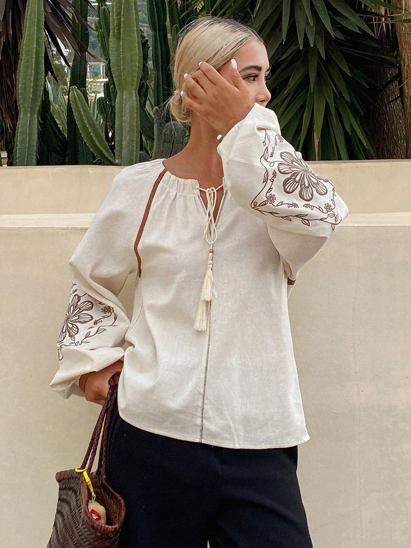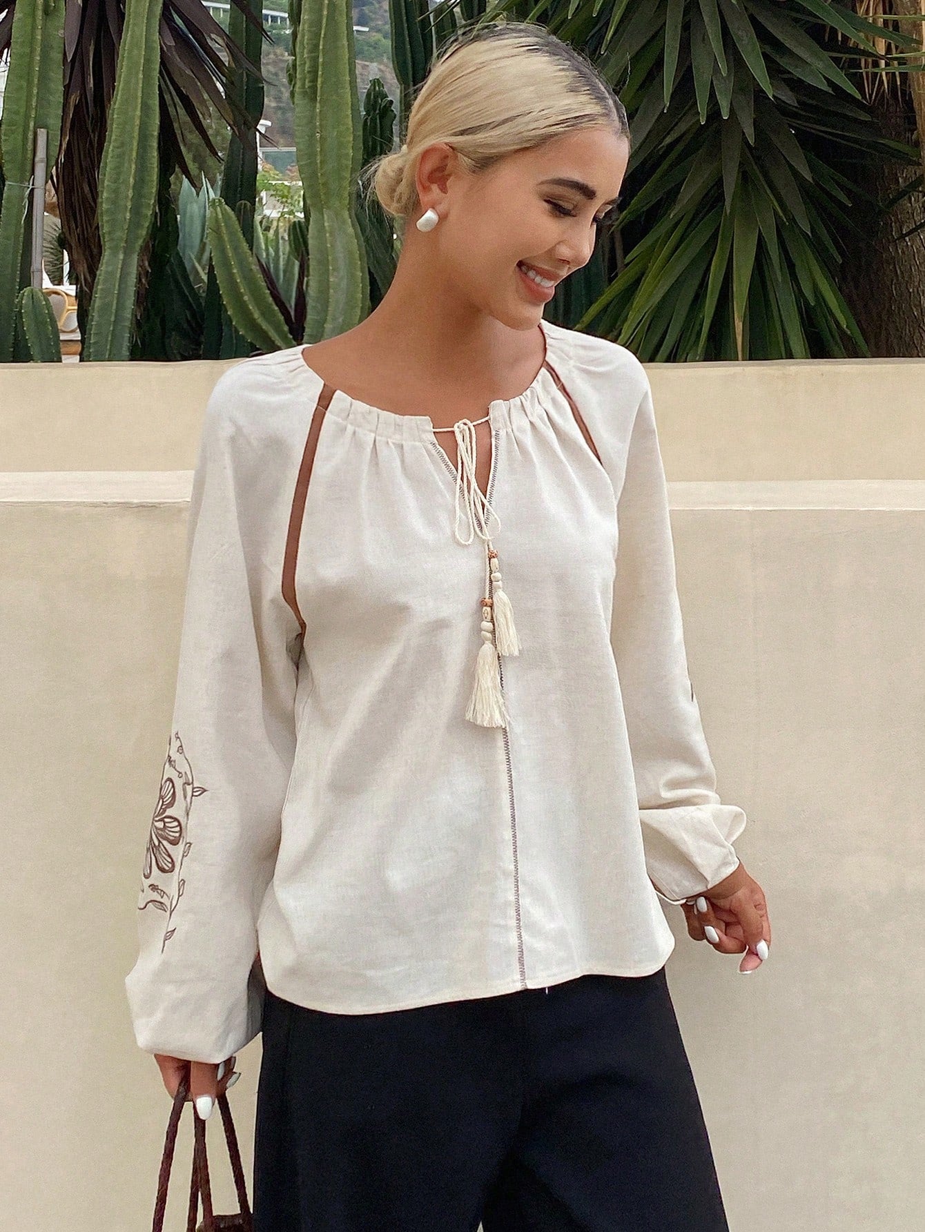 Livesso Women's Bohemian Style Embroidered Tassel Tied Cuff Blouse Linen Long Sleeve Top