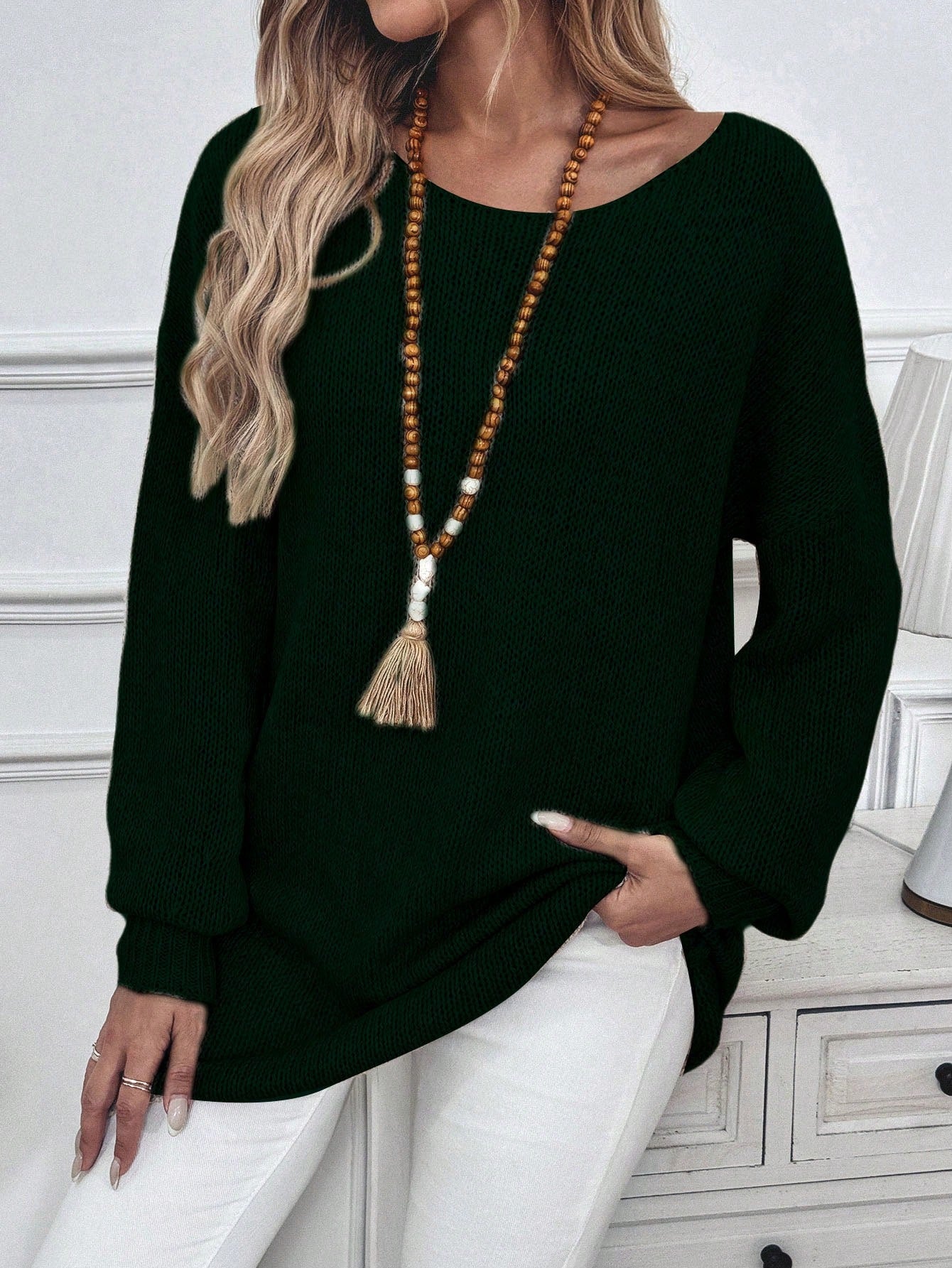 LUNE Knitted Sweater, Solid Color, Loose Fitting, Casual Fall Round Neck Drop Shoulder Batwing Sleeve