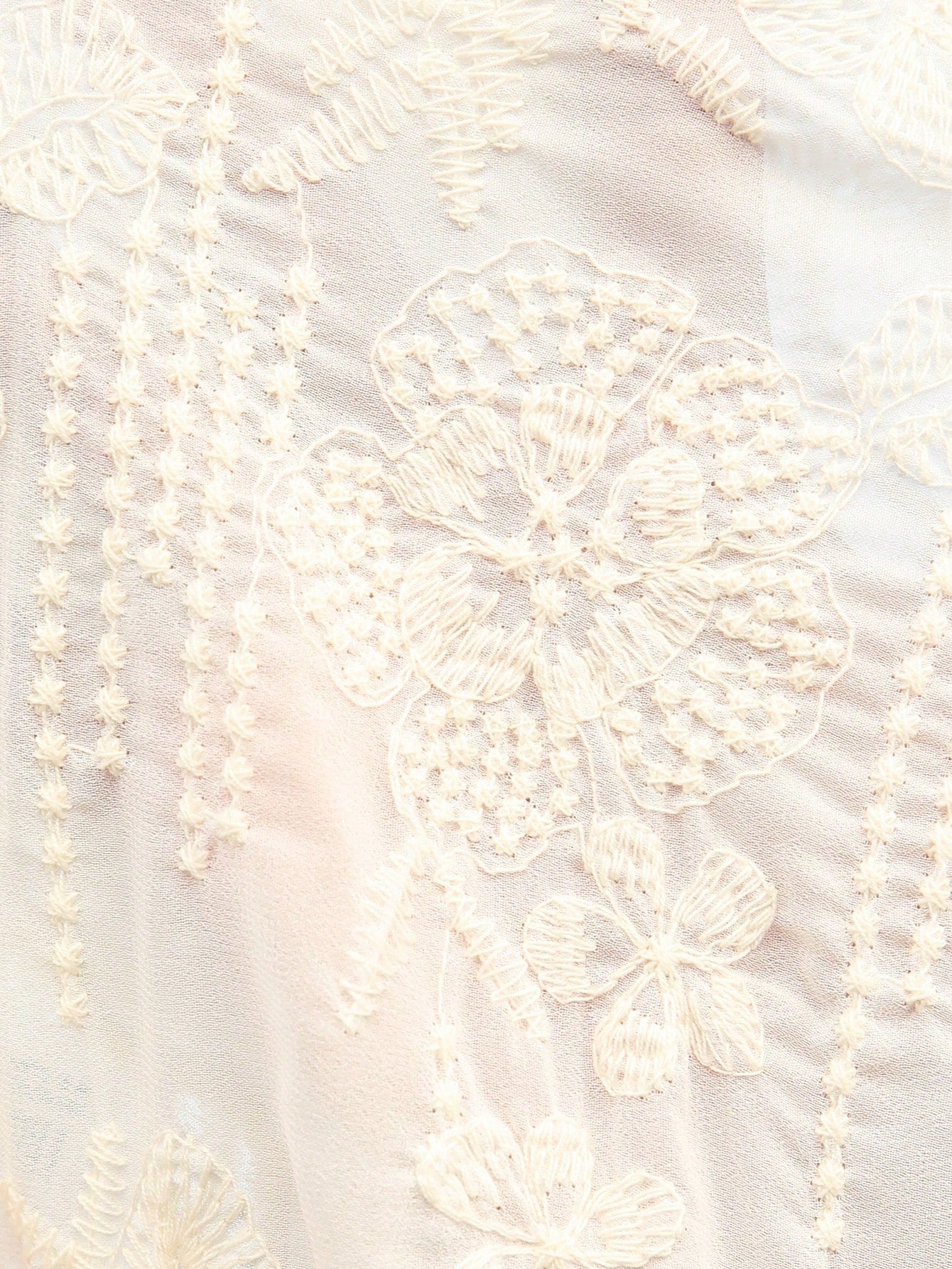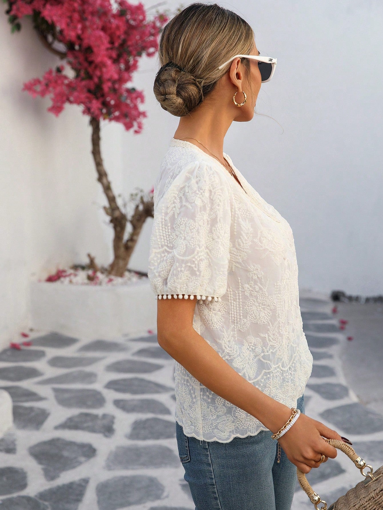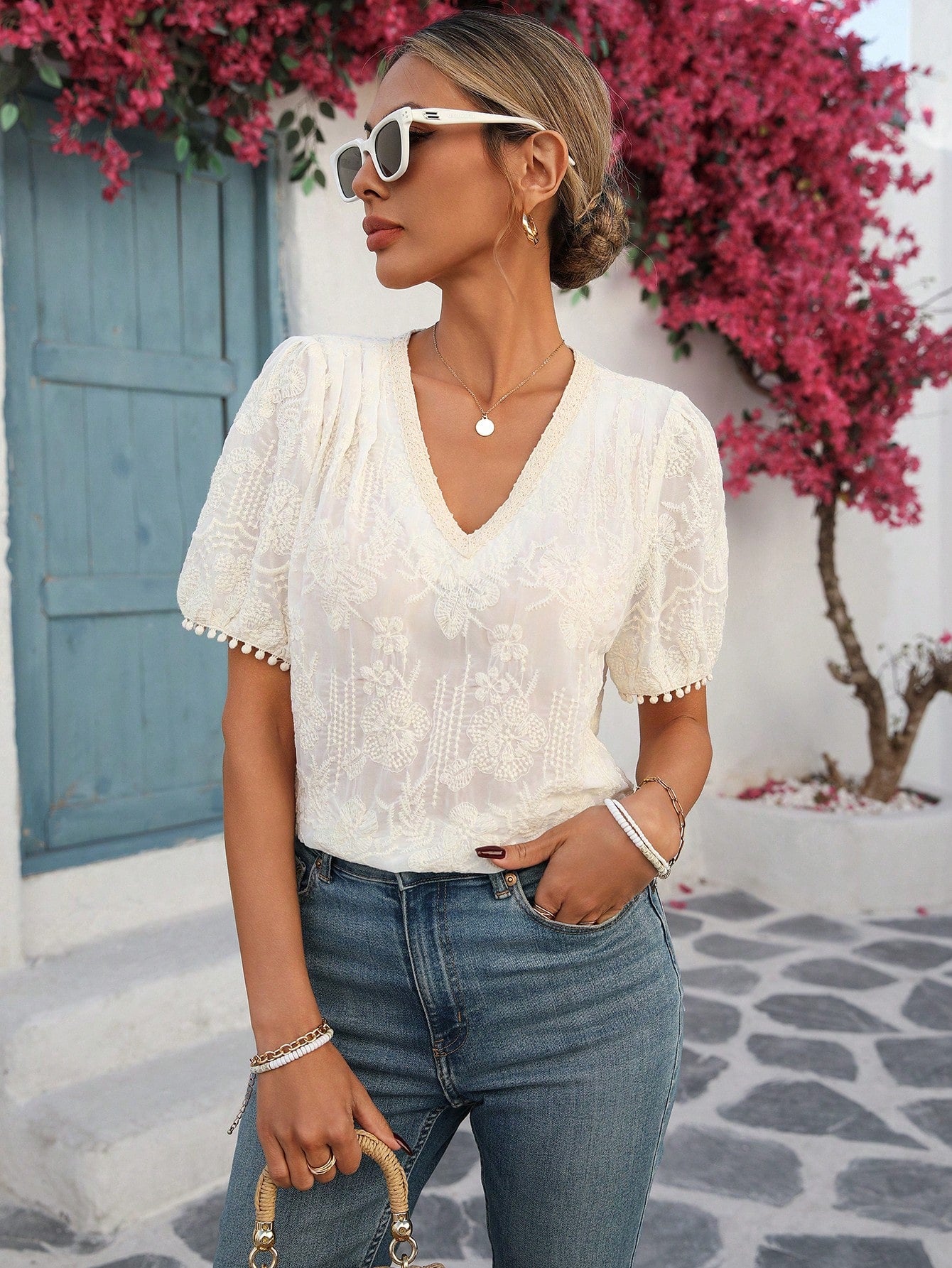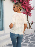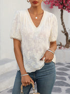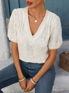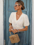 LUNE Women's French Style Vacation & Office Casual Embroidered Fabric V-Neck Ruffle Trim Puff Sleeve Short Sleeve Blouse
