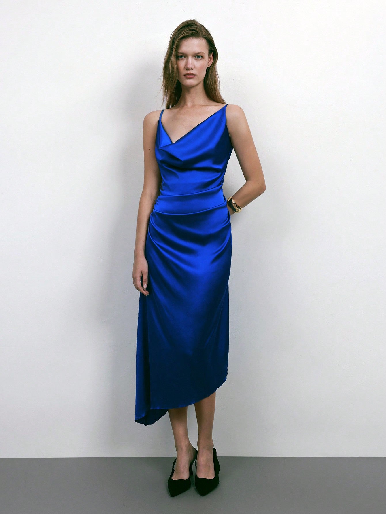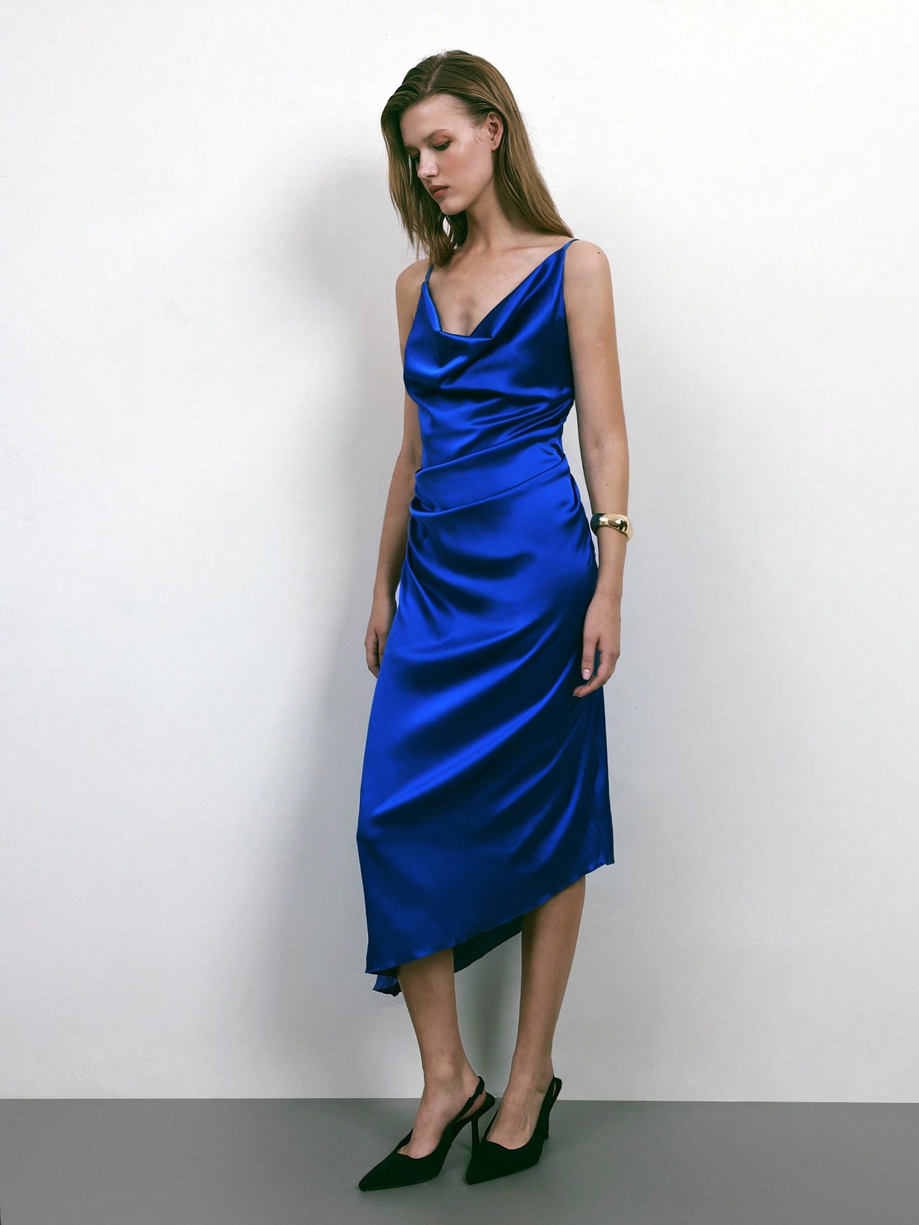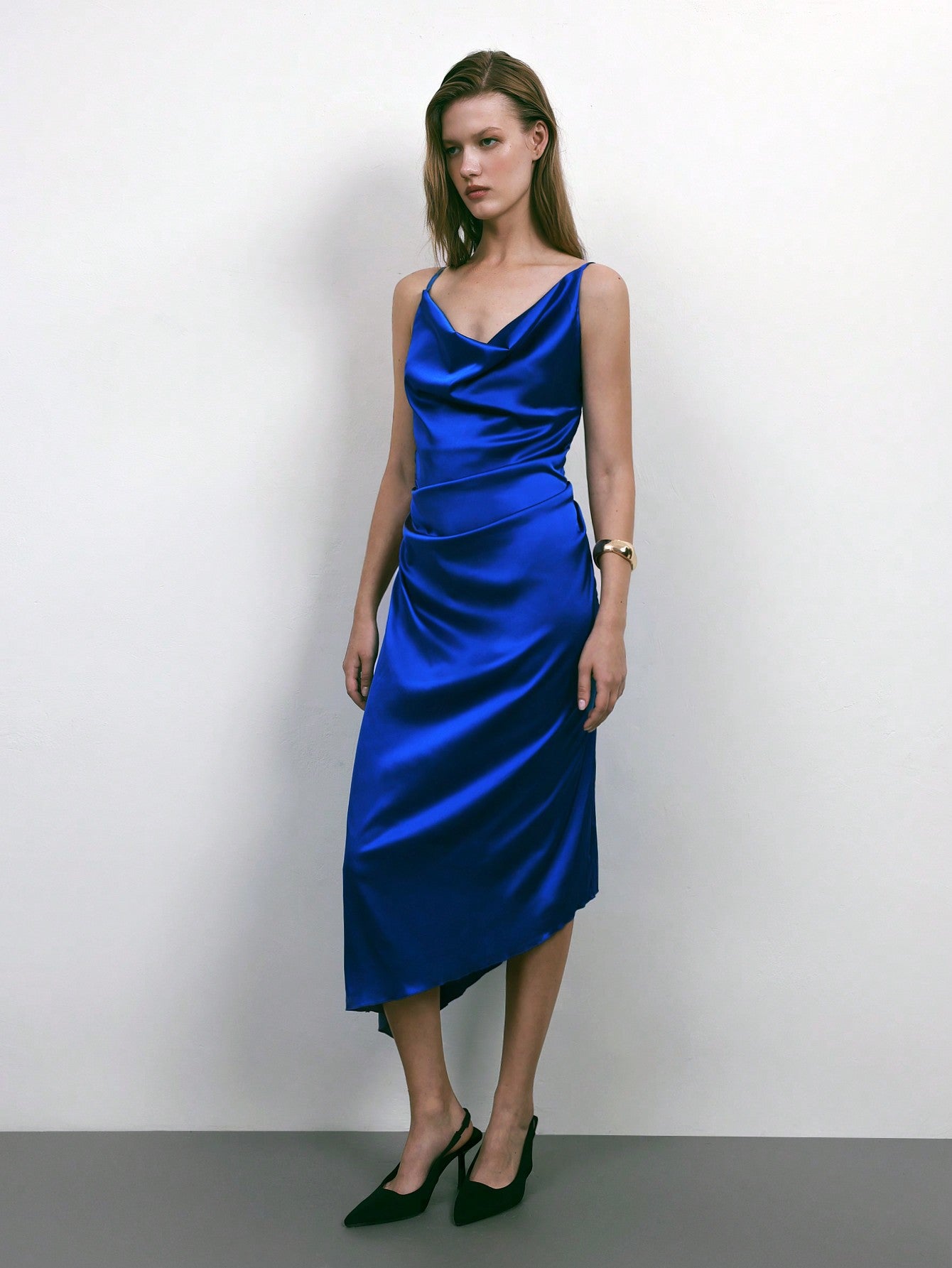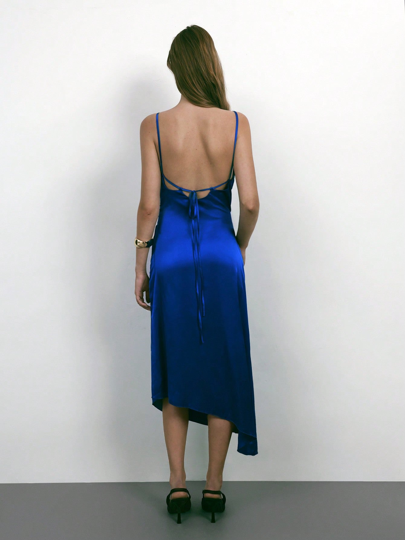 Maija Party Dress Satin Woven Elegant Chic Urban Sapphire Blue Spaghetti Strap Backless Mid-Length Dress