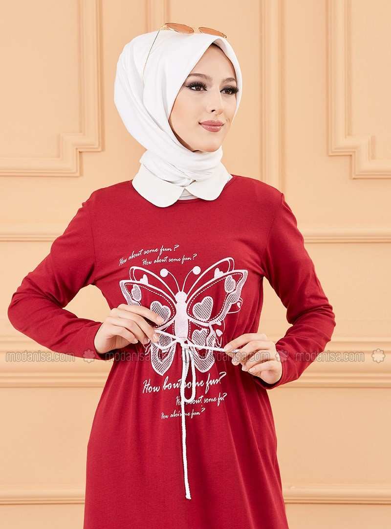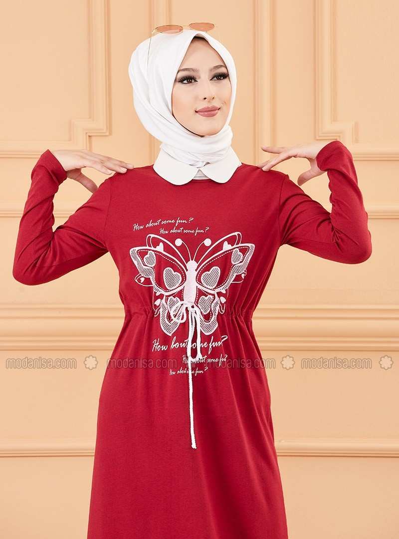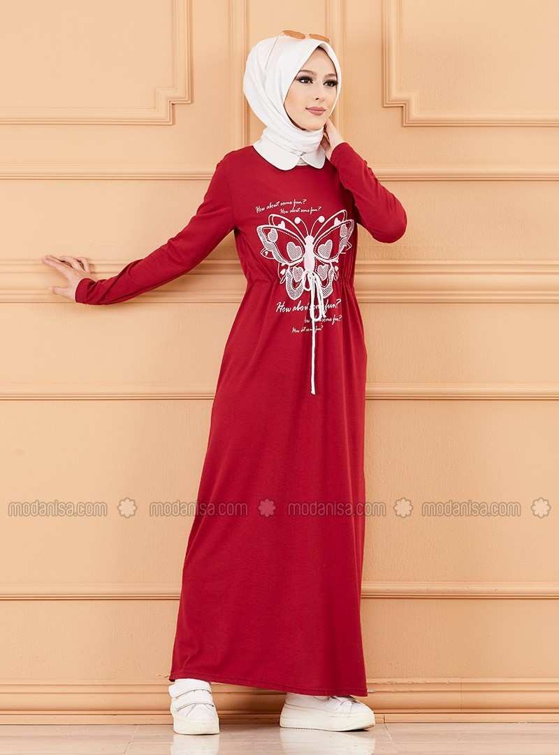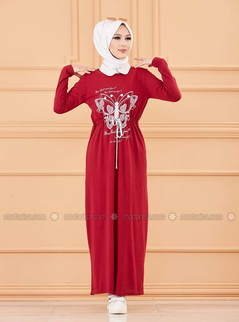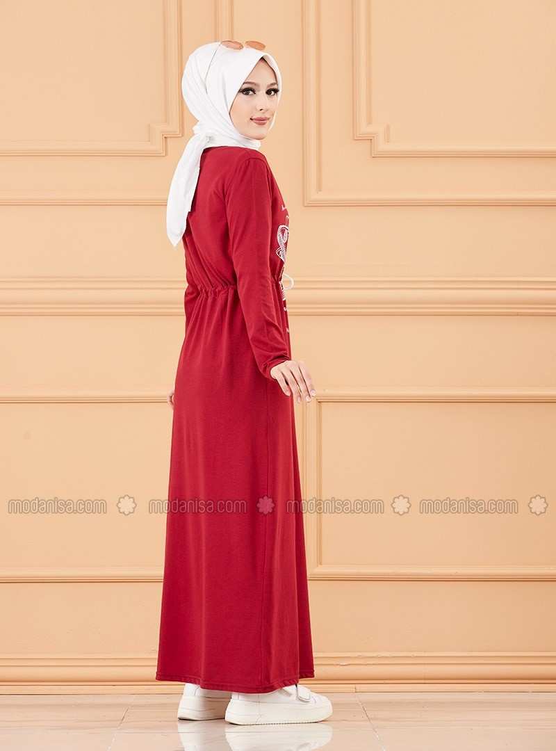 Maroon Multi Crew neck Unlined Cotton Viscose Modest Dress