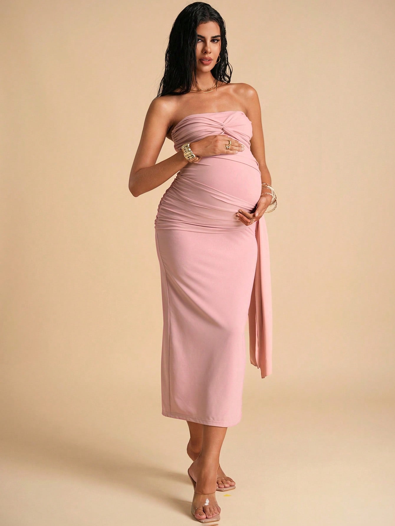MaterniChic Pink Maternity Dress Pregnant Women's Summer Solid Color Twist Knot Side High Slit Bandeau
