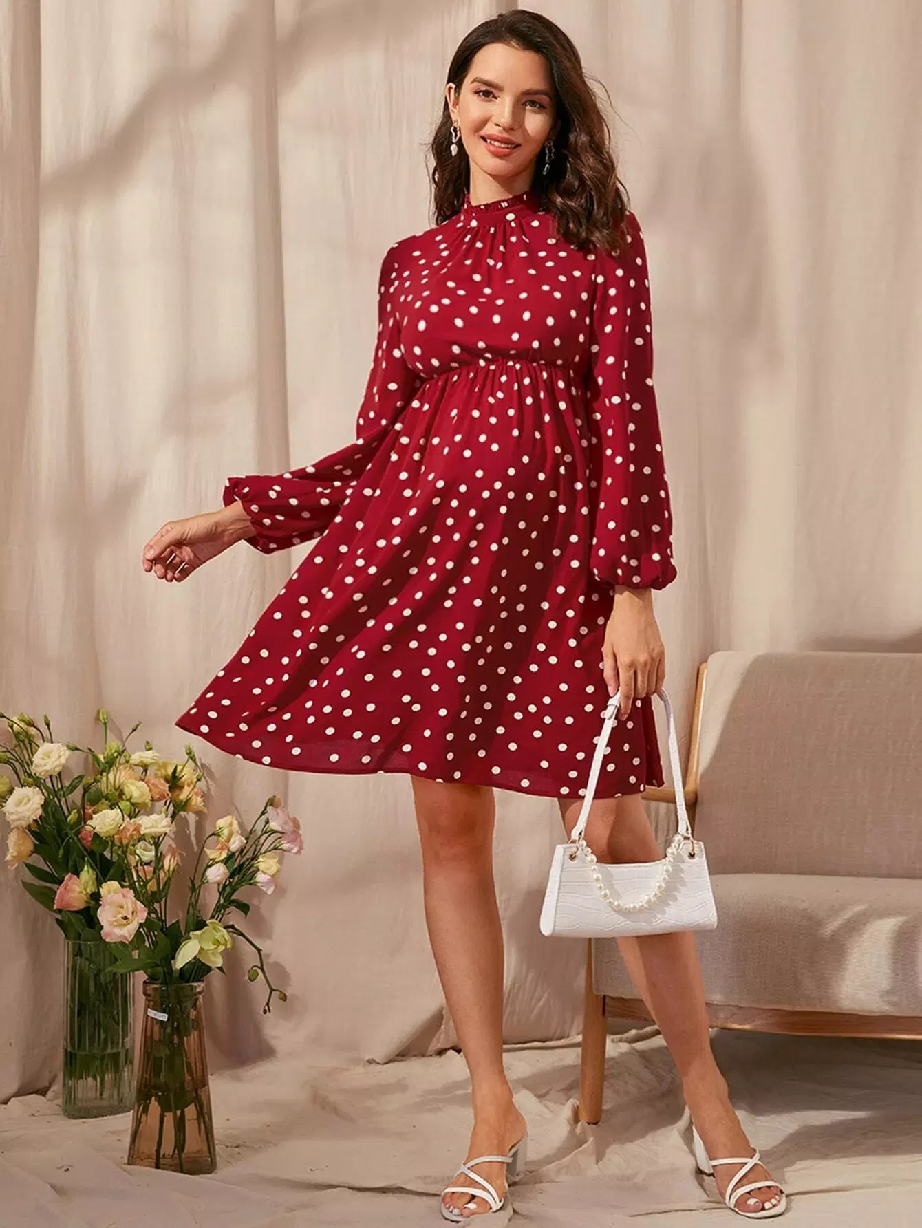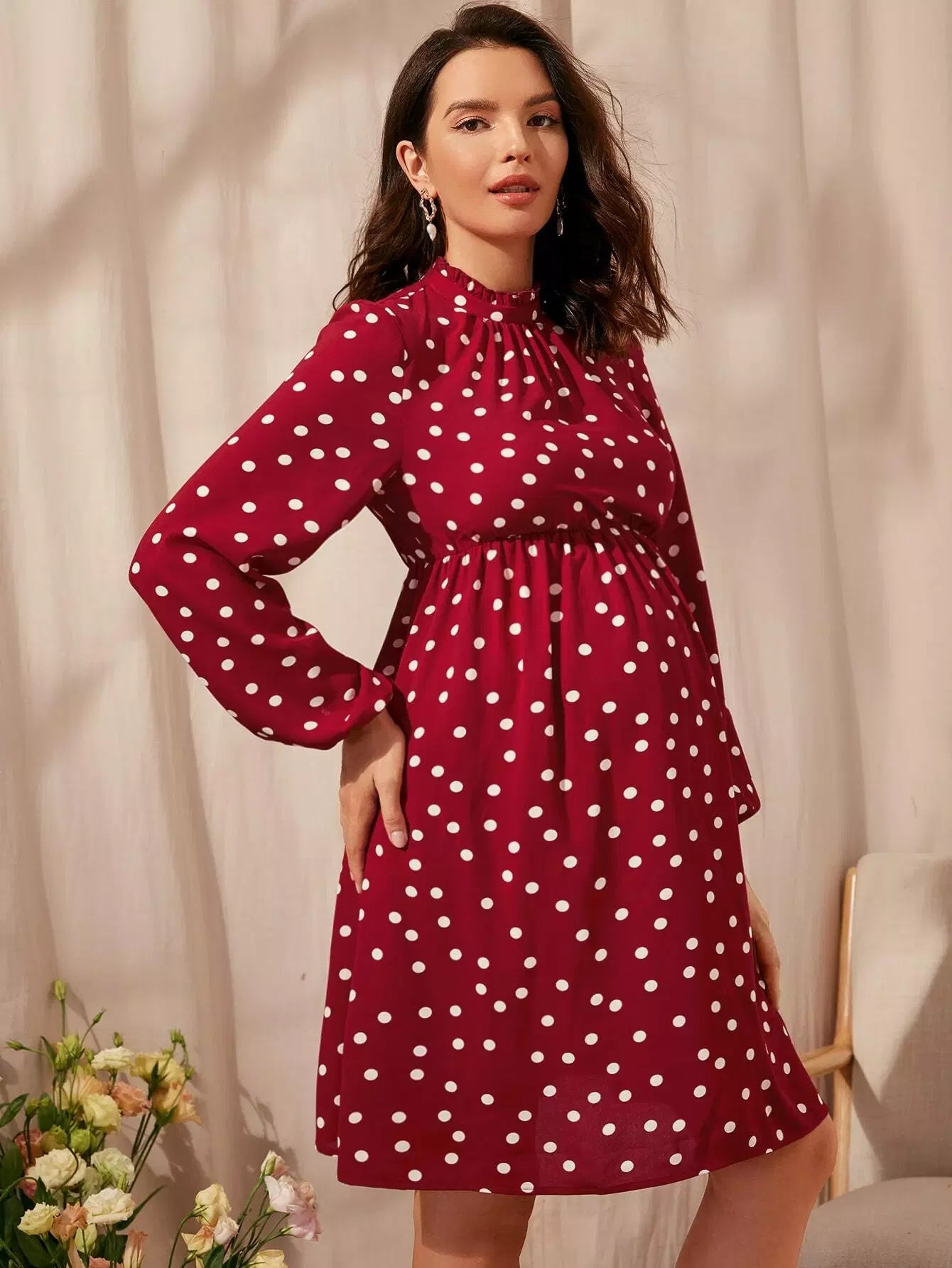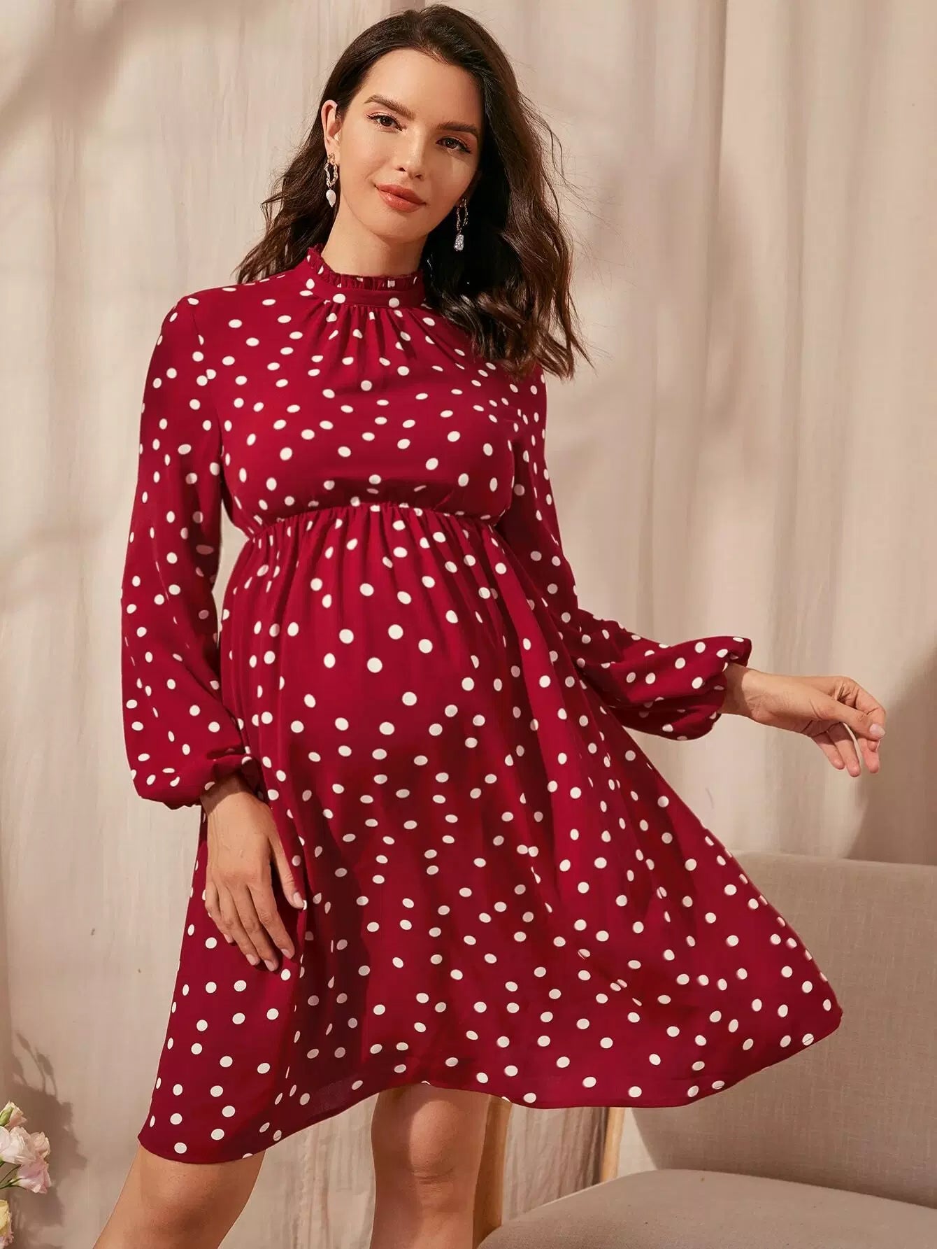 Maternity Frill Neck Bishop Sleeve Polka Dot Dress