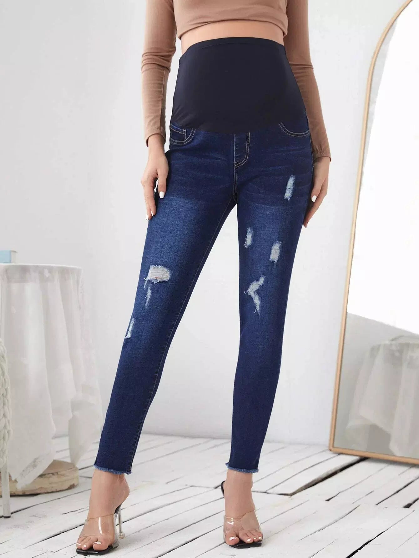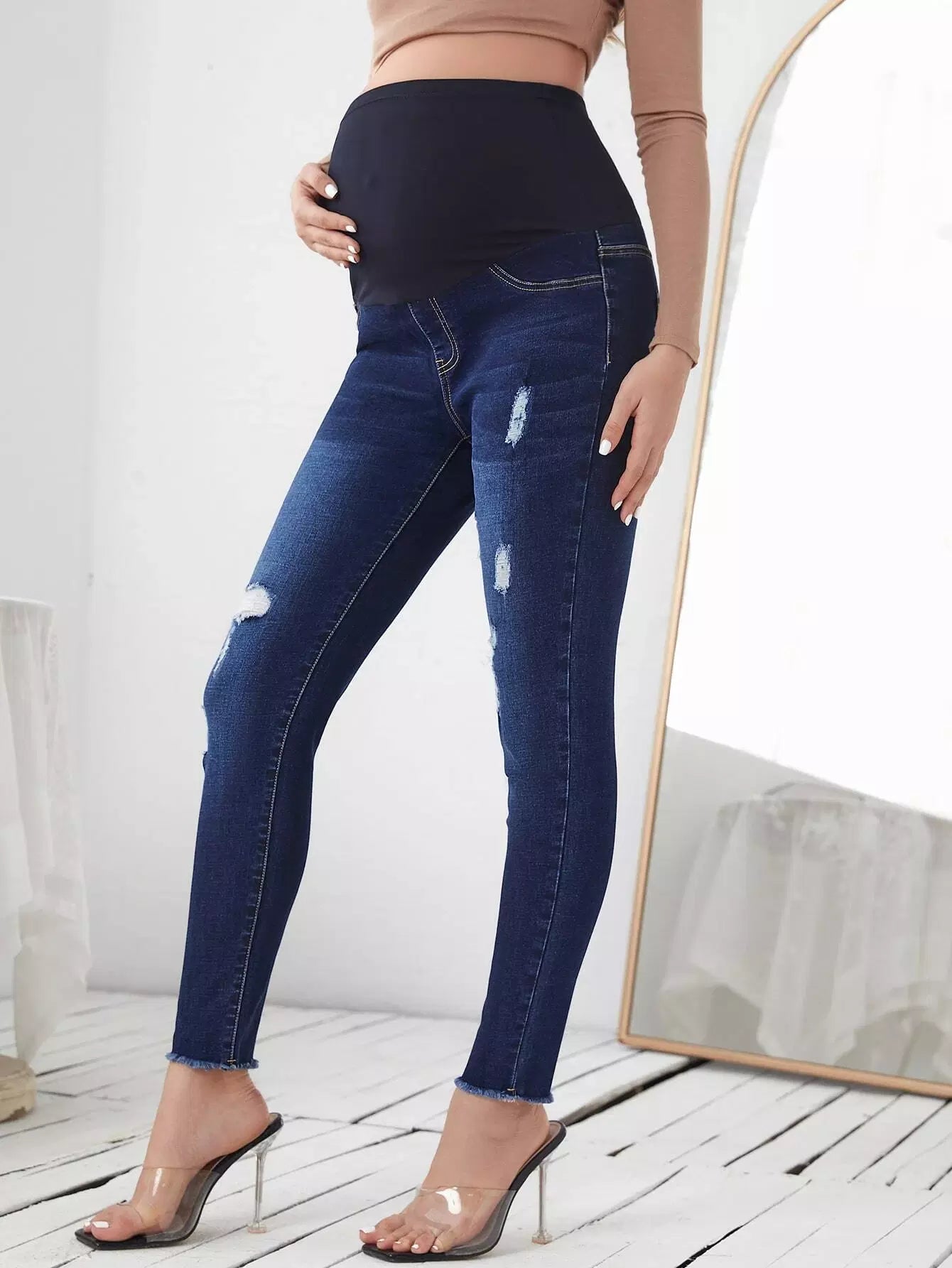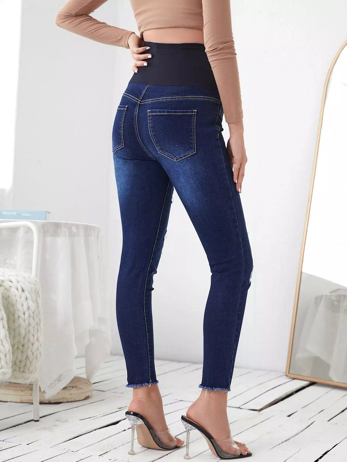 Maternity Wide Waistband Ripped Raw Cut Skinny Jeans
