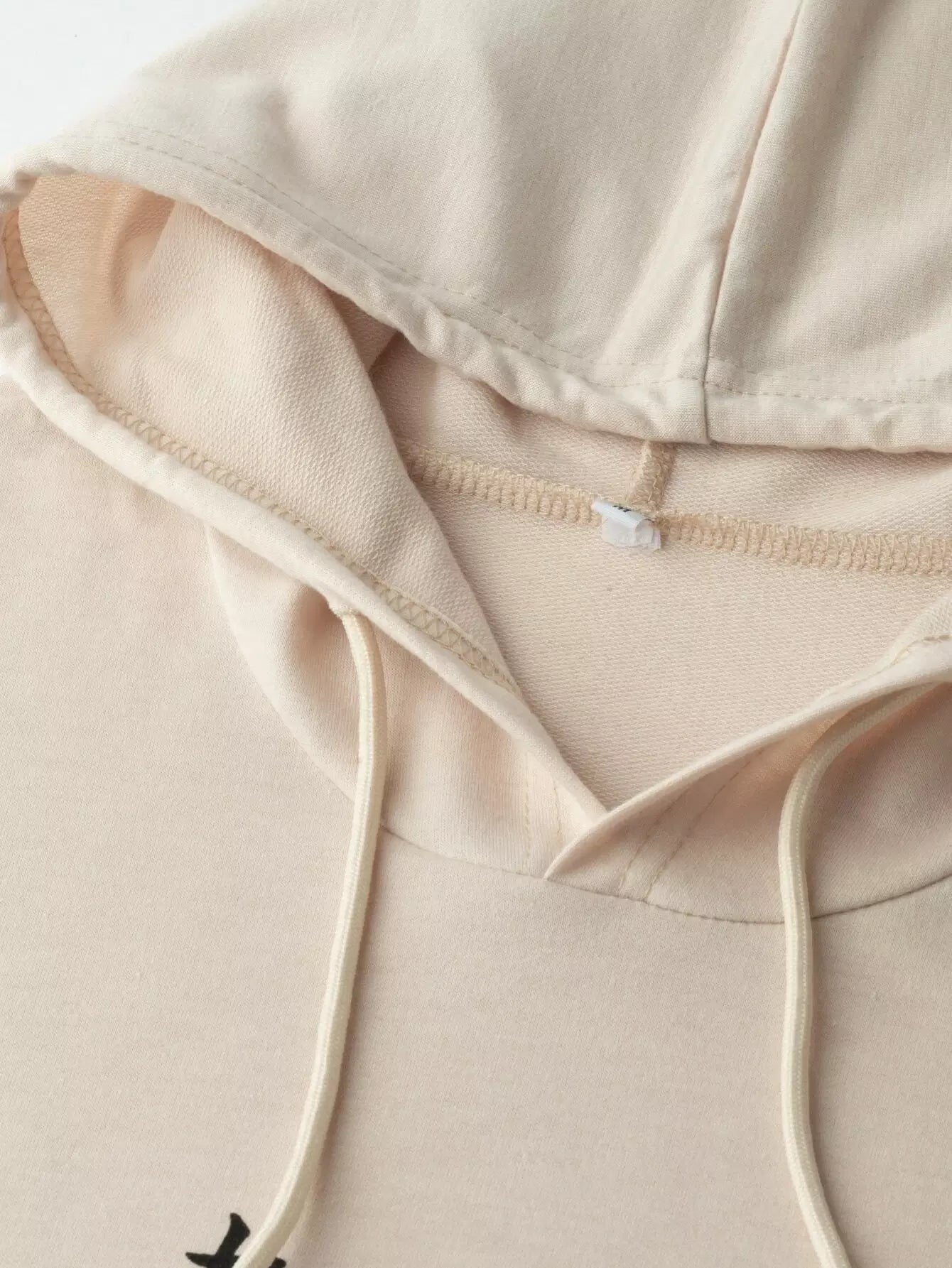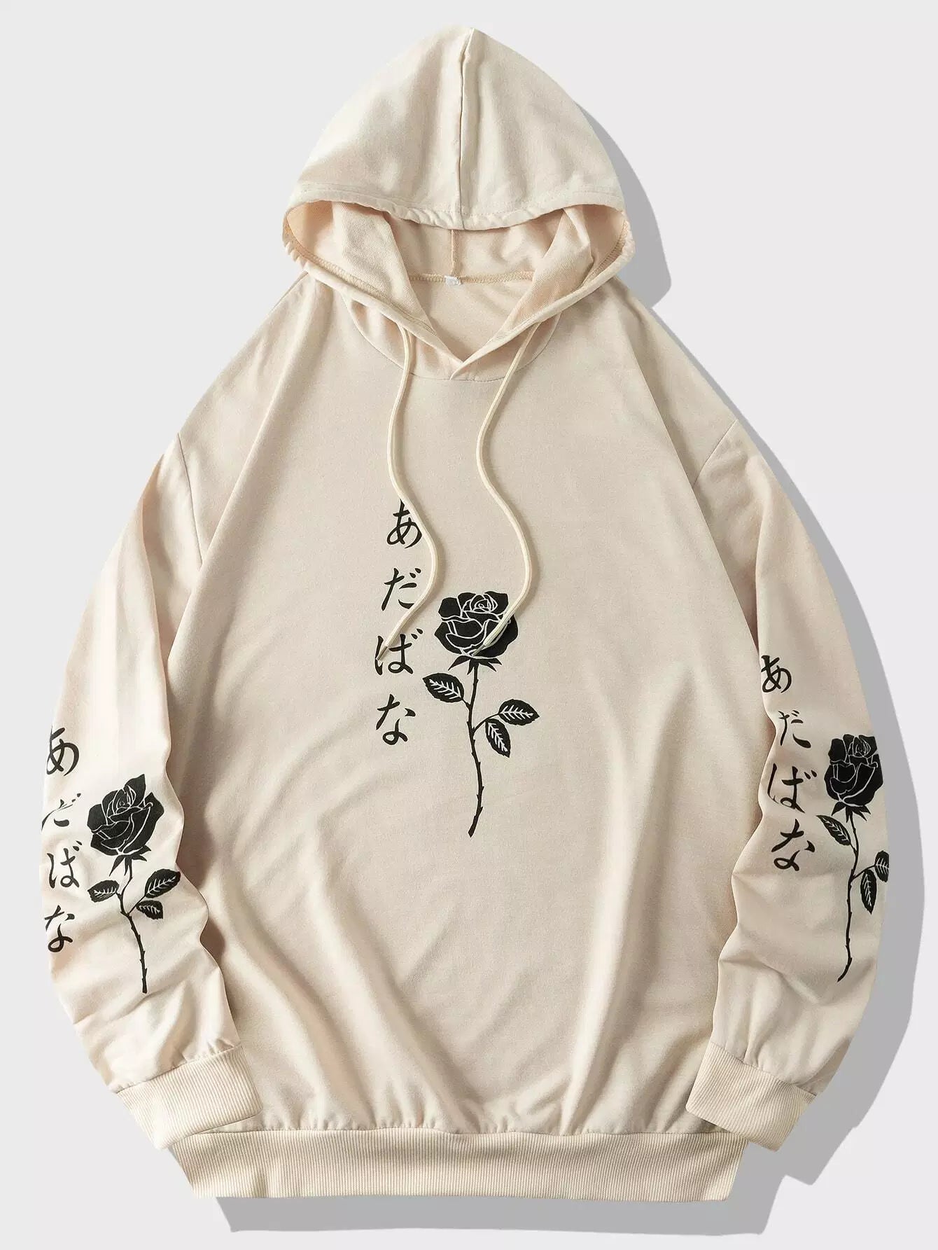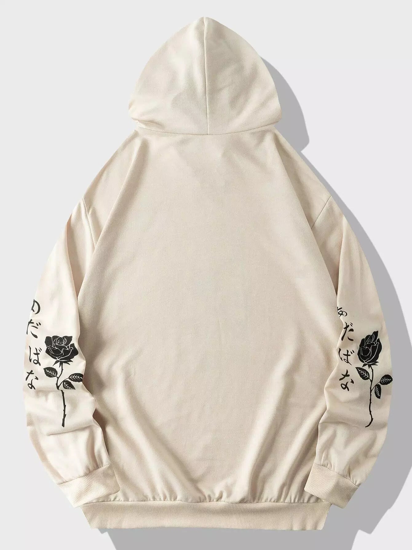 Men Japanese Letter & Floral Print Drawstring Hoodie