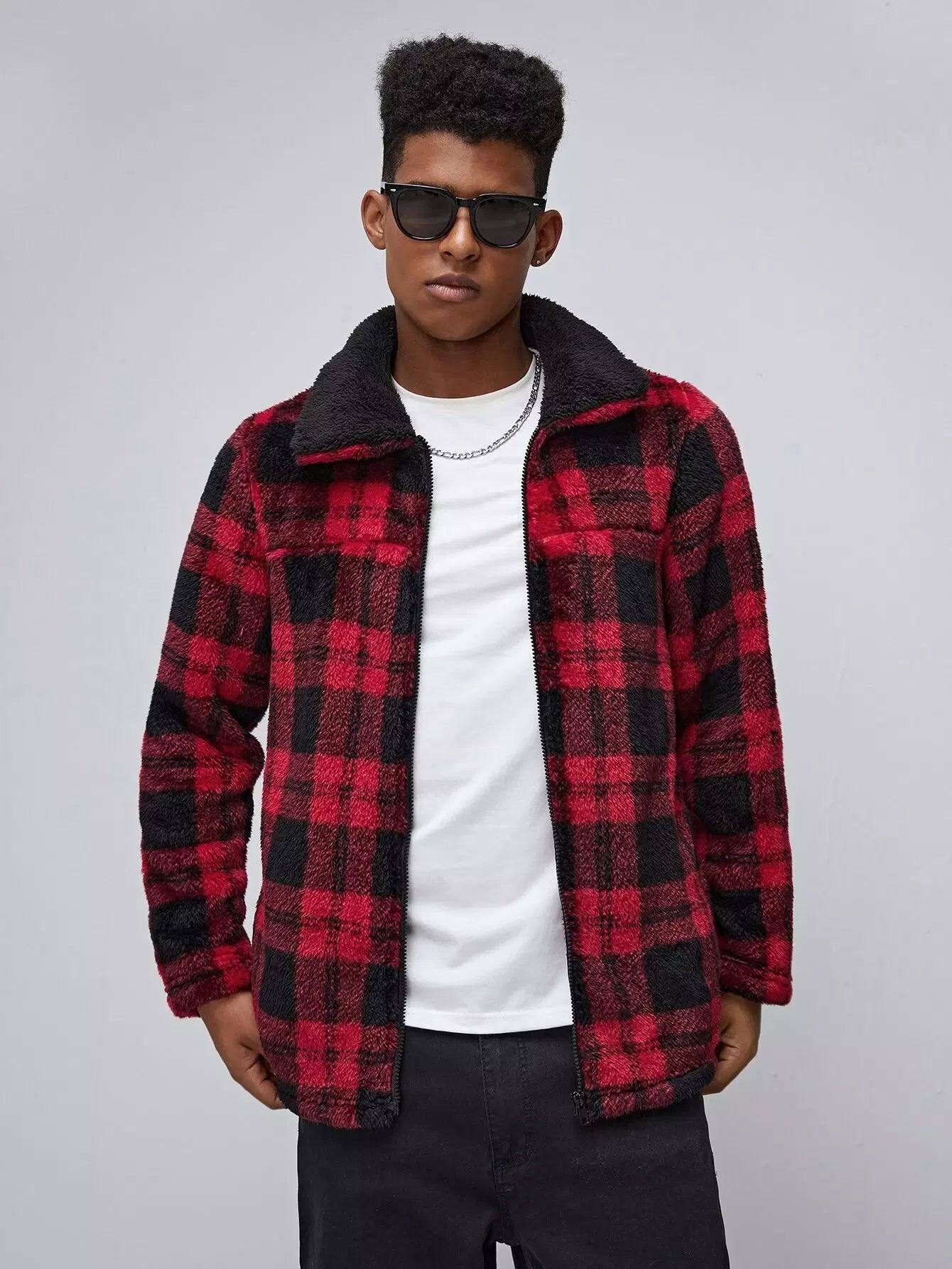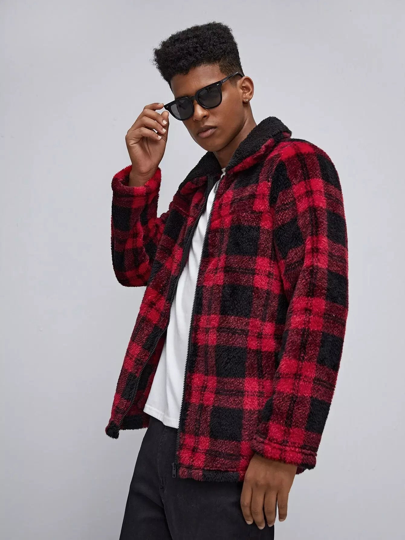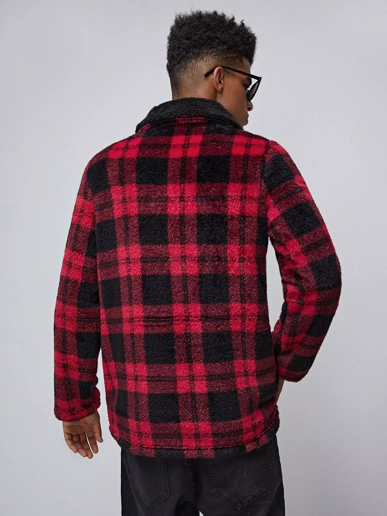 Men Plaid Pattern Slant Pockets Teddy Jacket