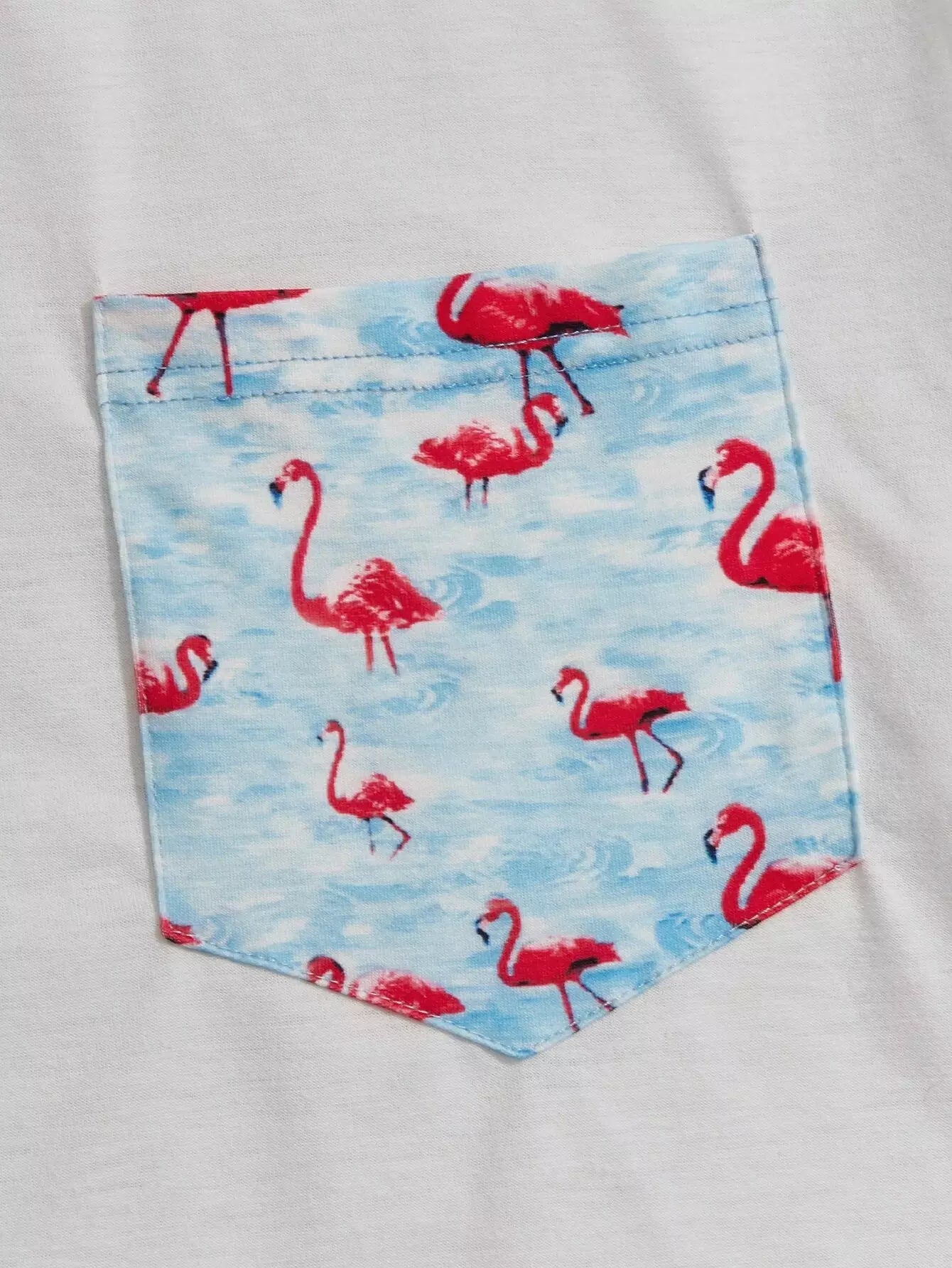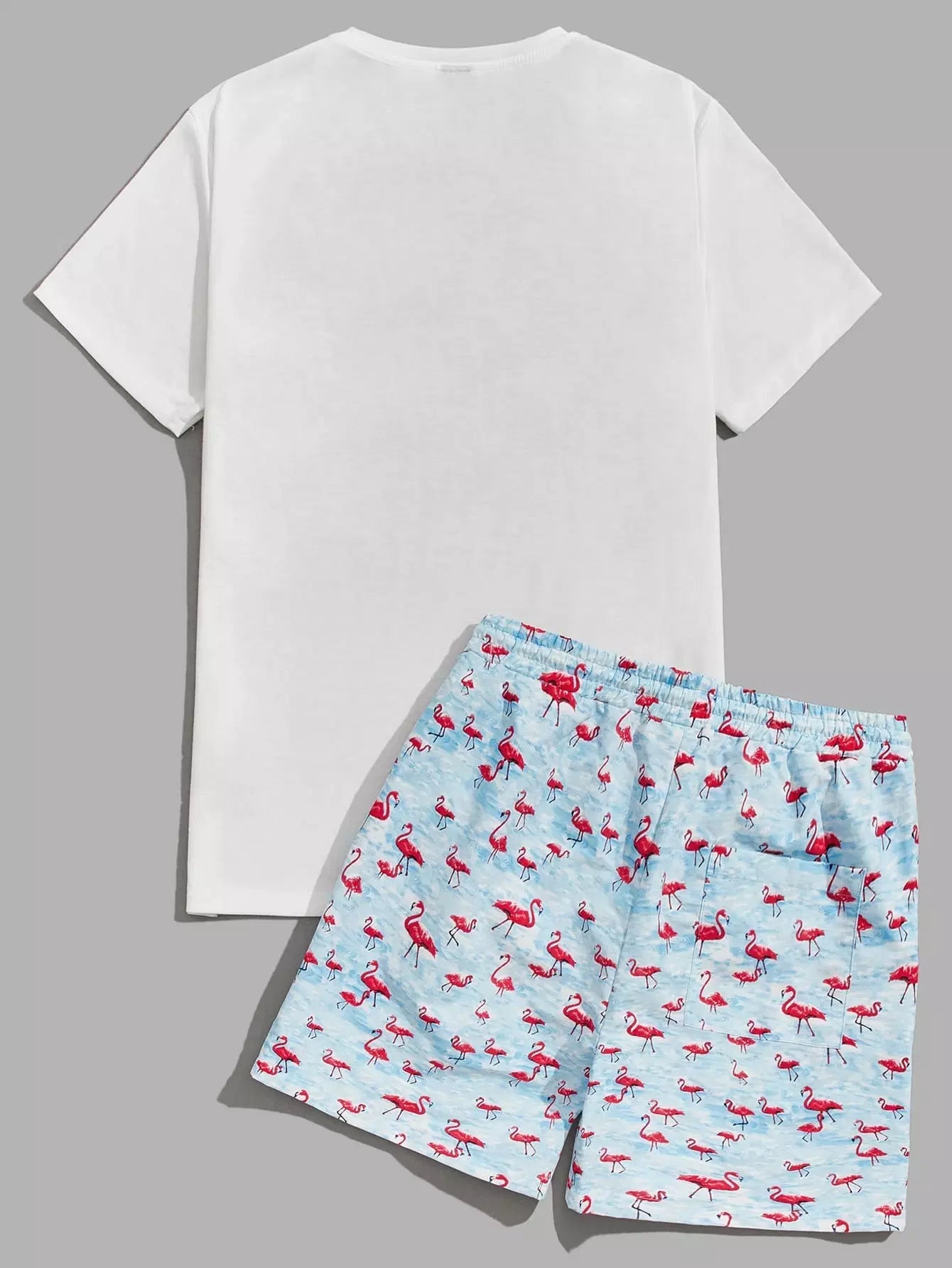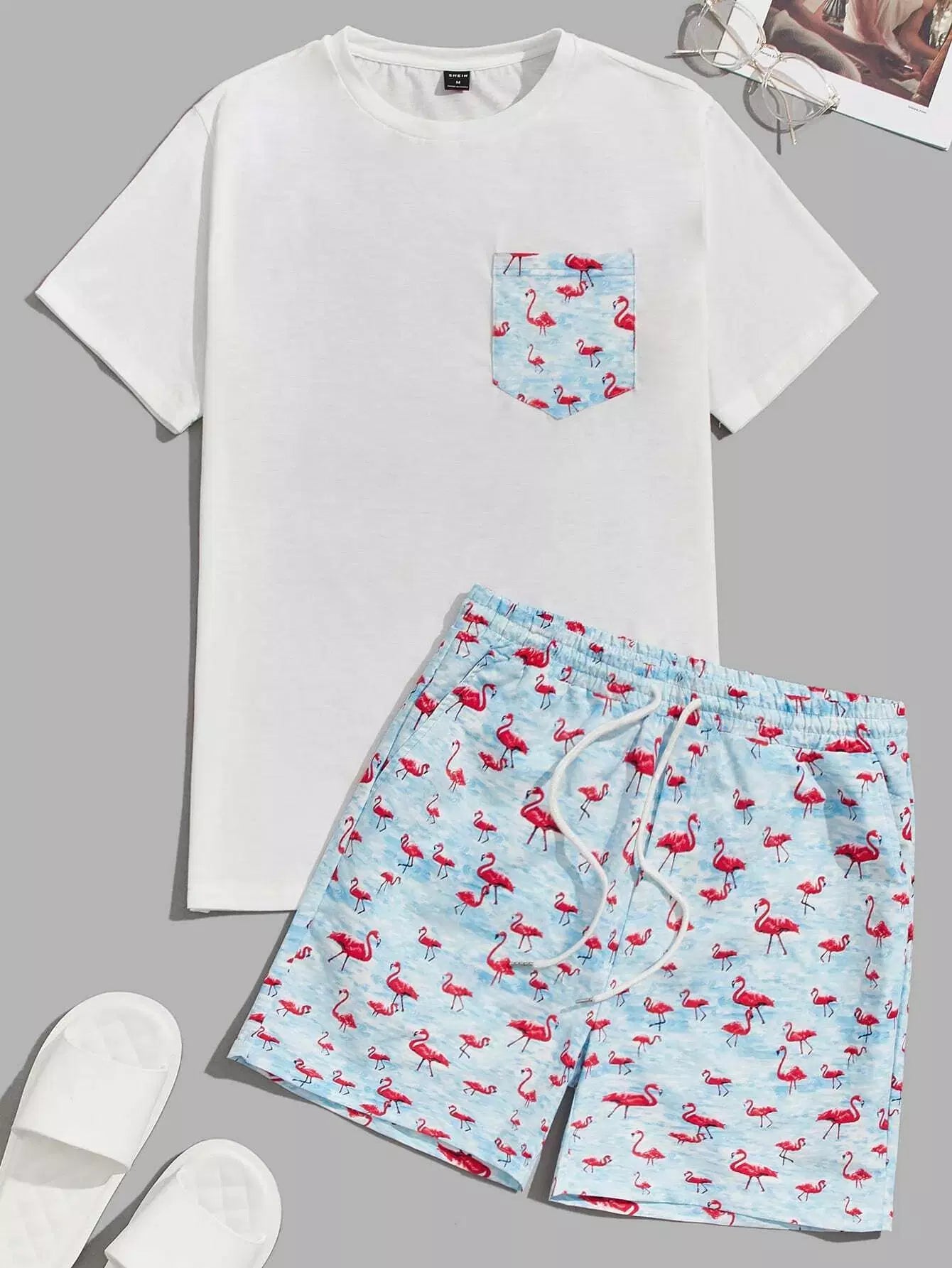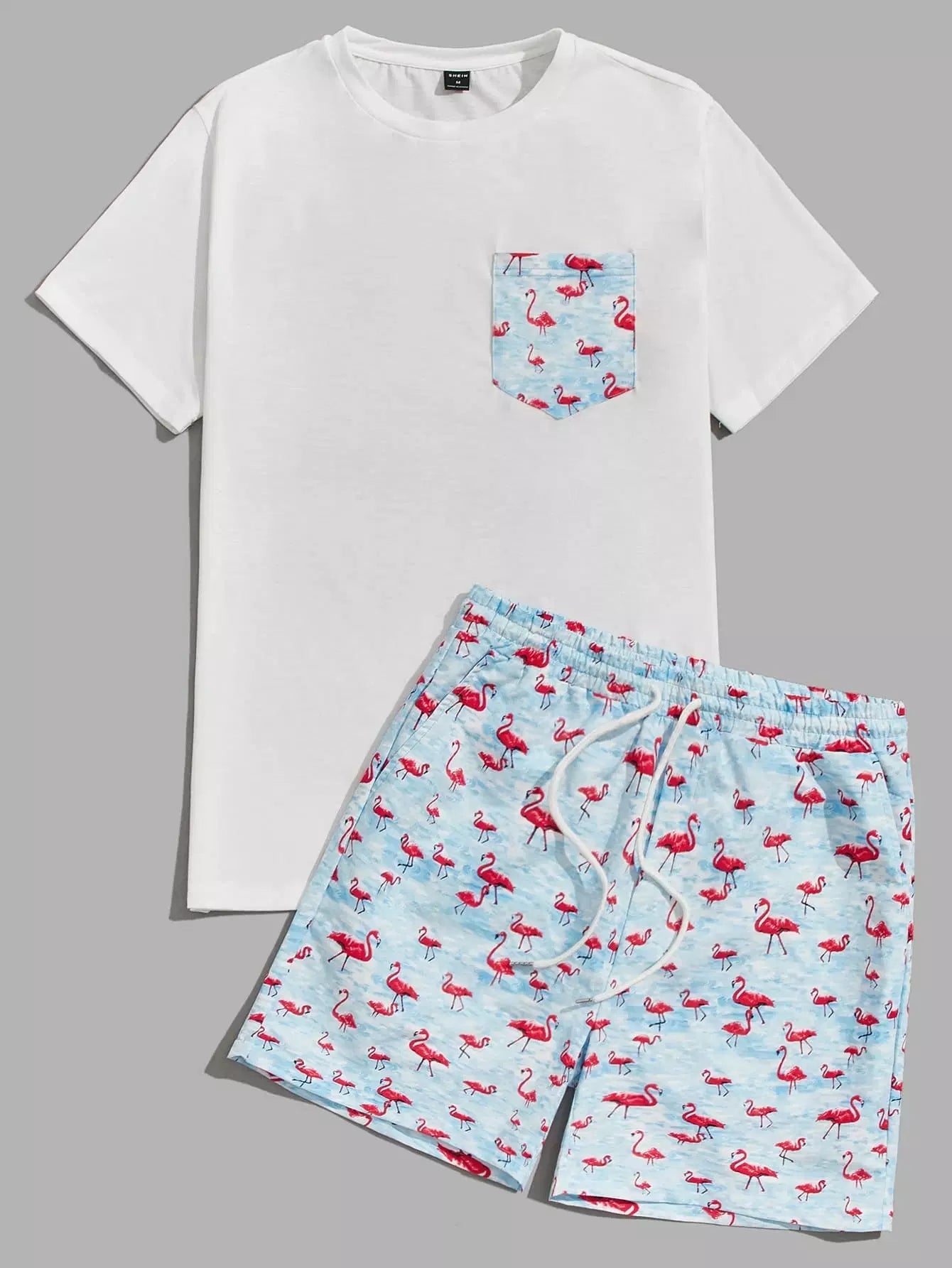Men Pocket Patched Tee and Flamingo Print Shorts Lounge Set