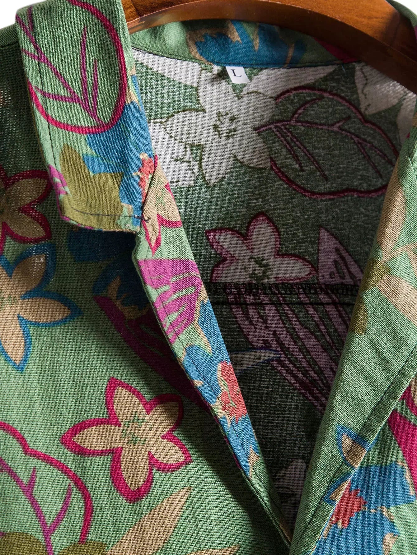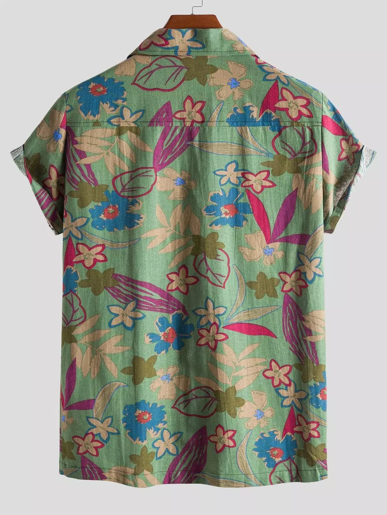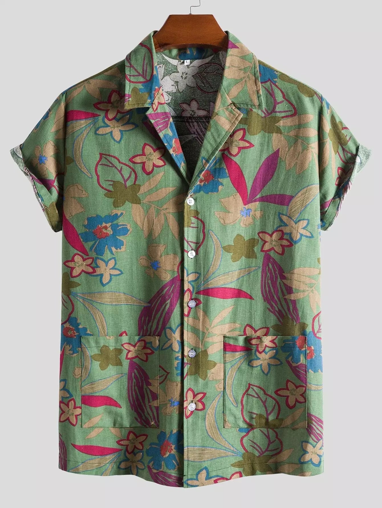 Men Random Floral Print Button Up Dual Pocket Short Sleeve Shirt