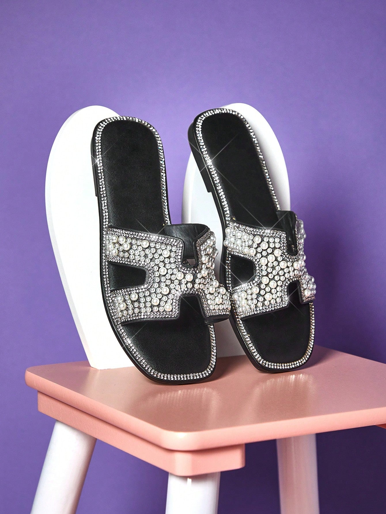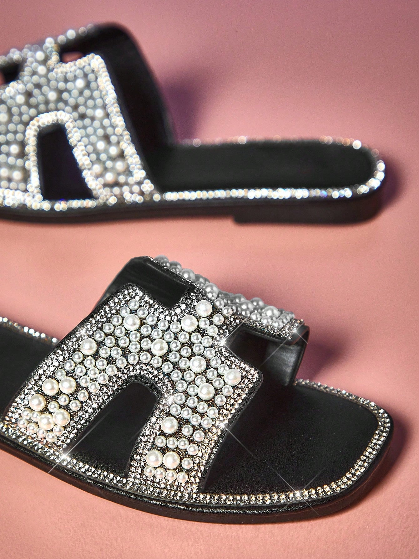 Mini mi Luxury-Inspired Kids' Black Deconstructed Cutout Straps & Edge Sparkle Sole Slides|Cloud Cushion Footbed For Garden Party To Private Viewings