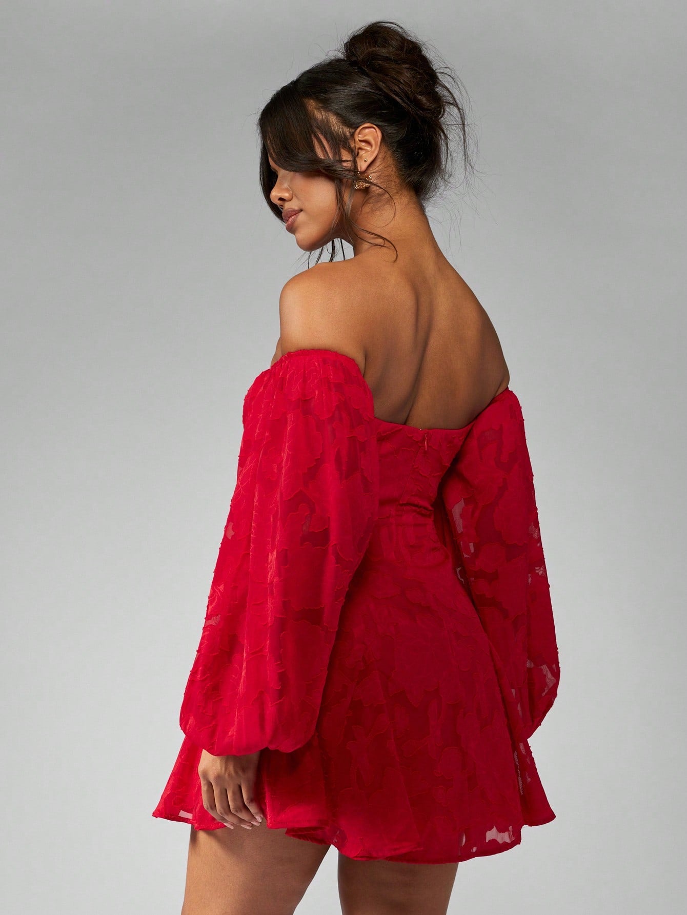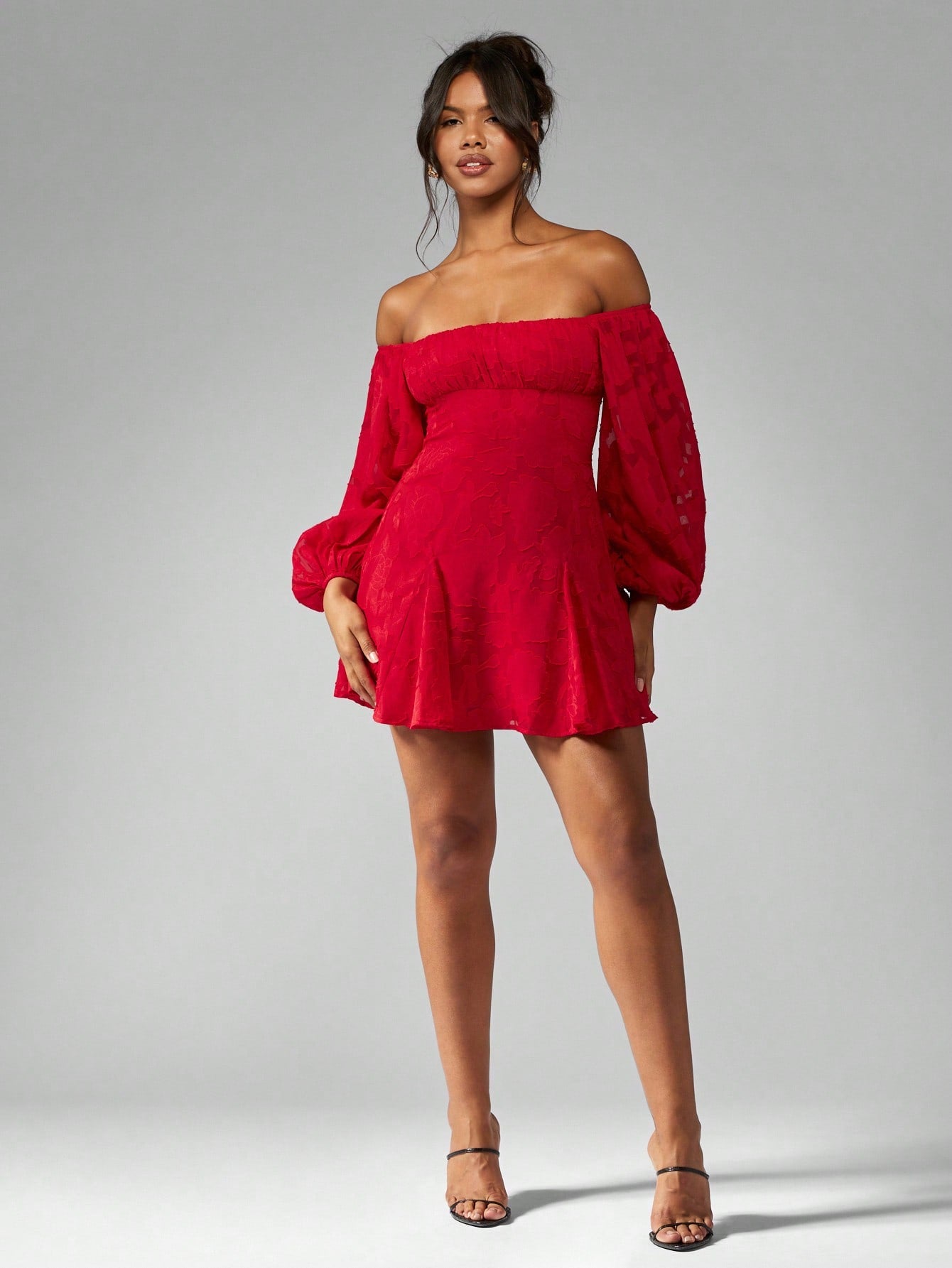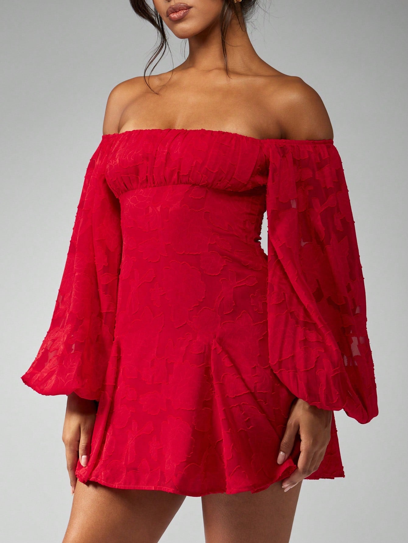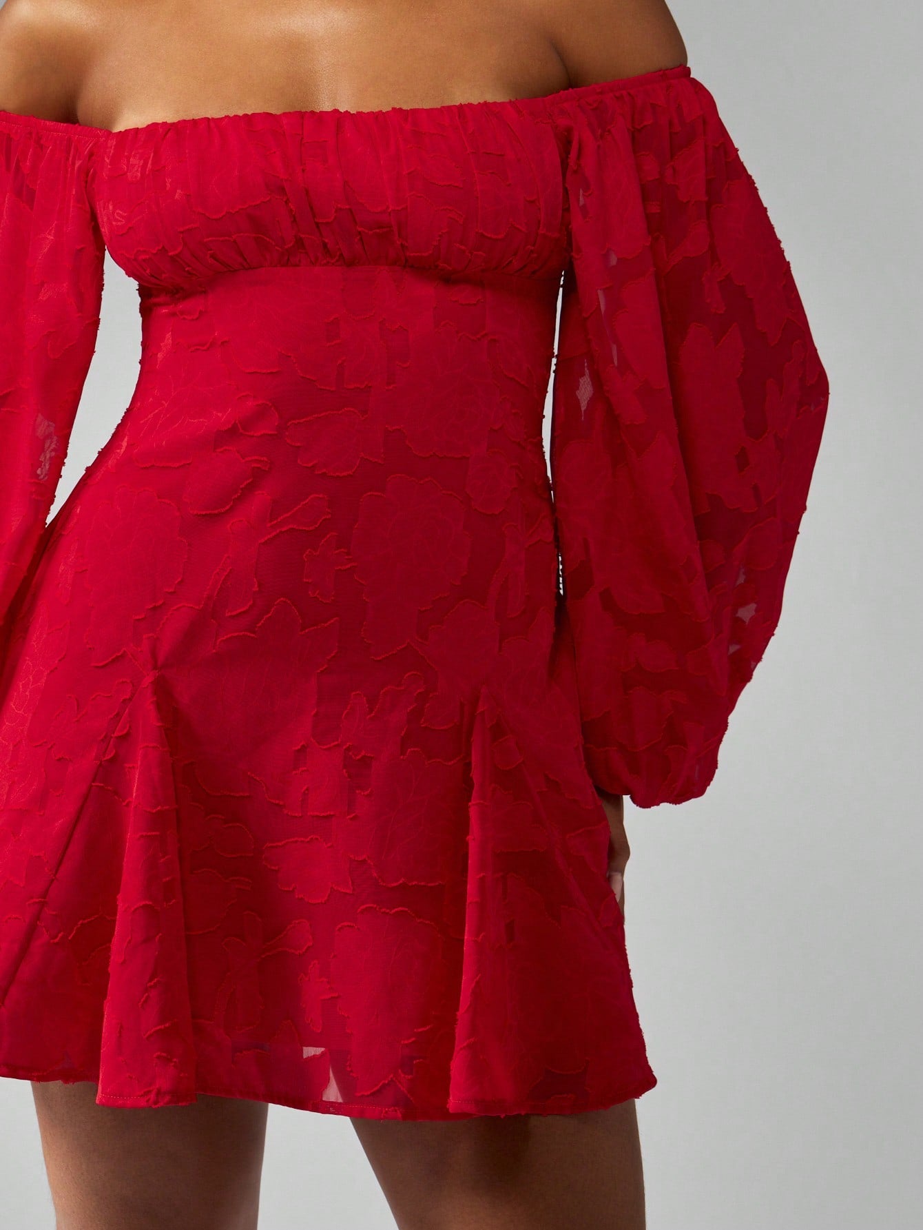 MISSGUIDED Off Shoulder Balloon Sleeve Mini Skater Dress Devore Chiffon Ruched Bust Party Special Occasion