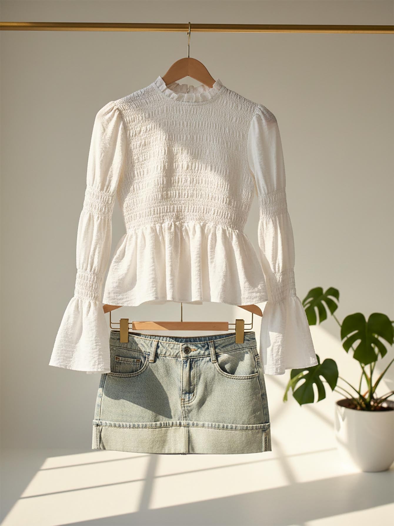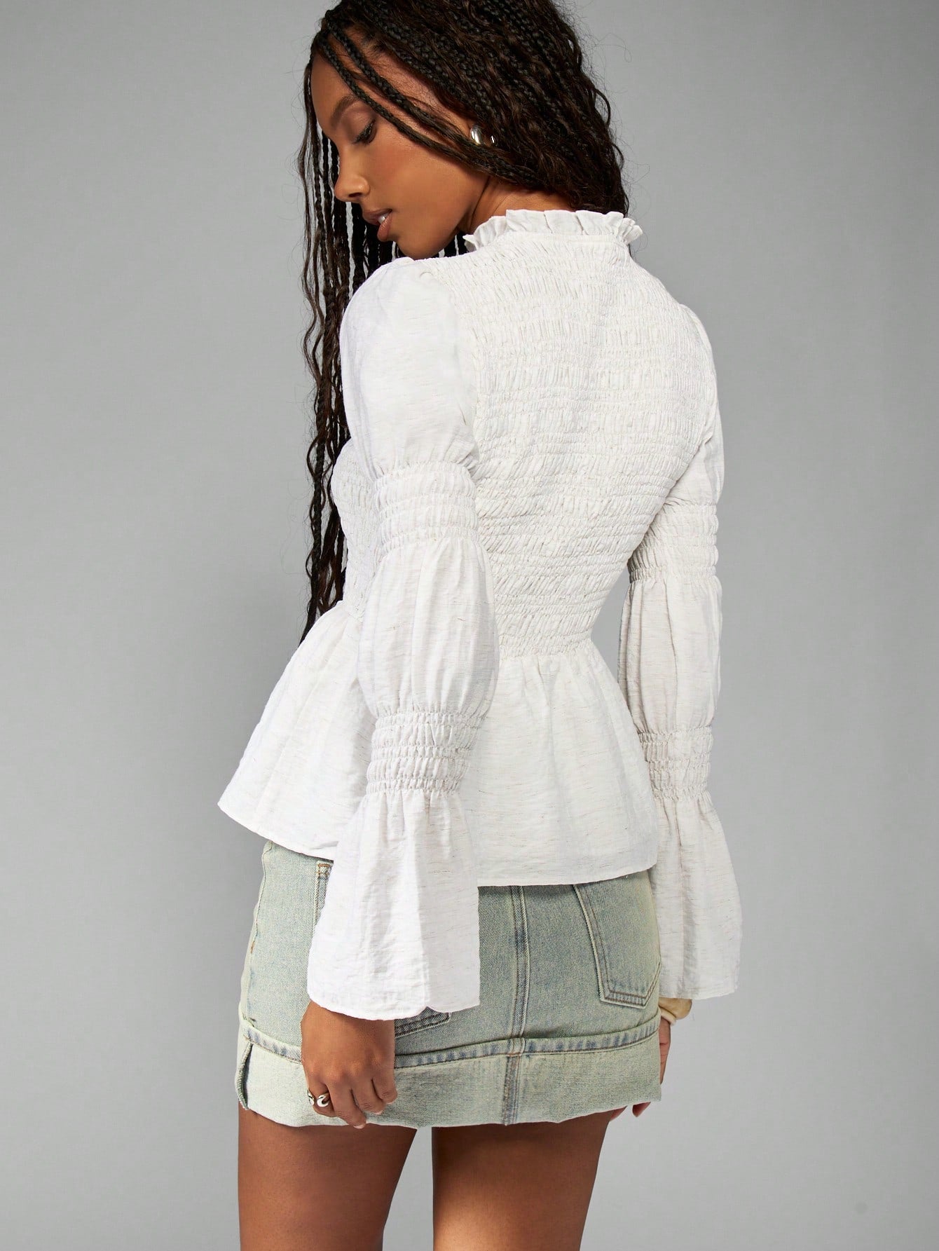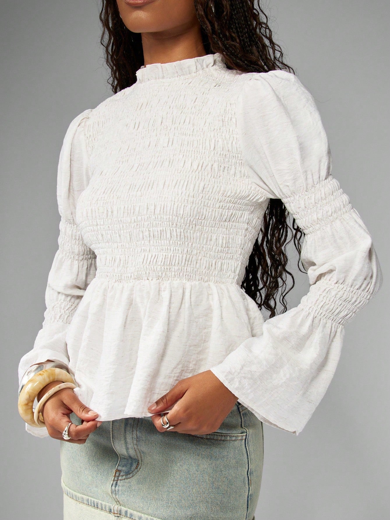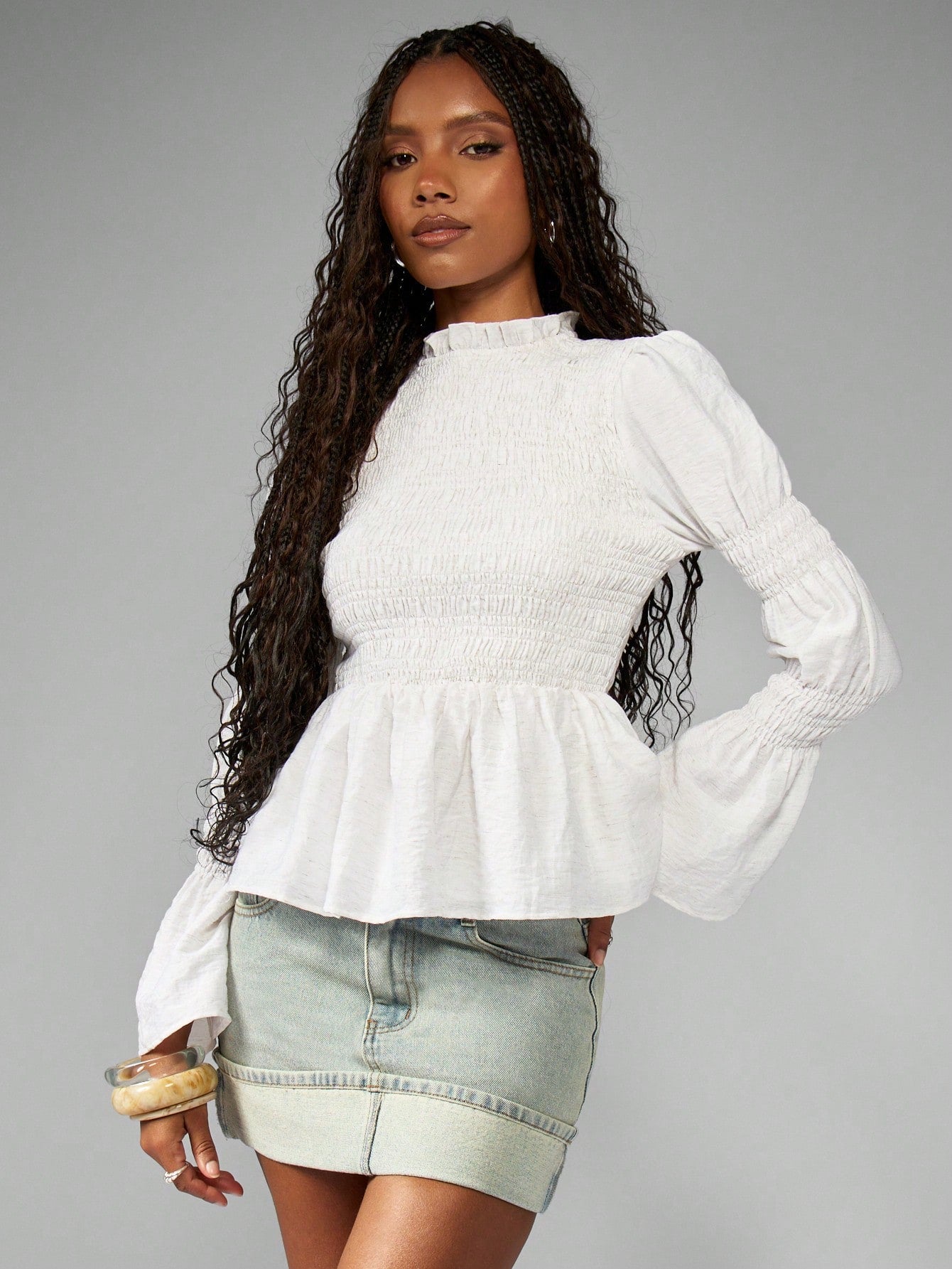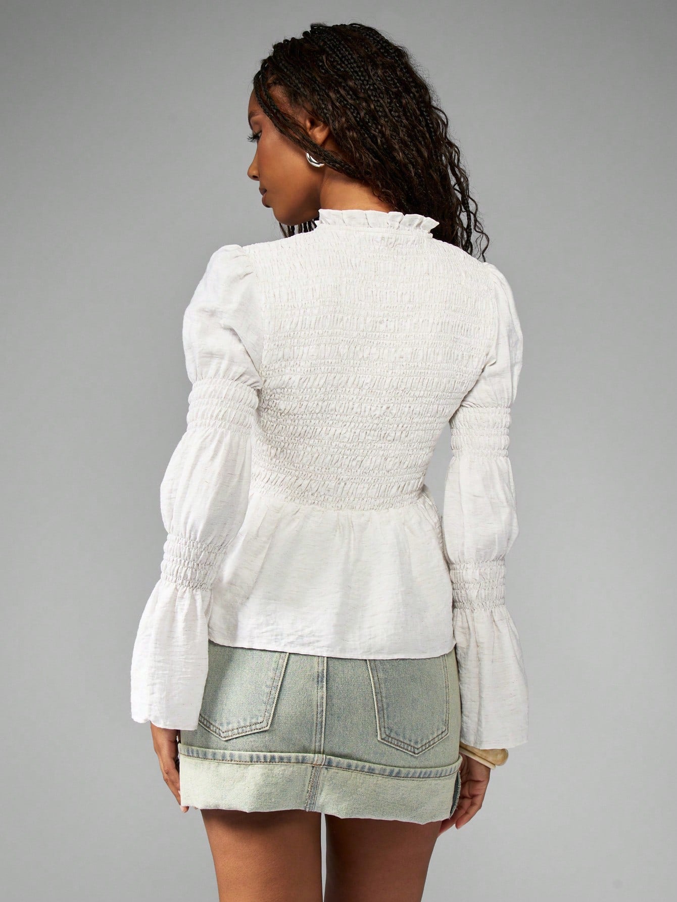 MISSGUIDED Smocked Bodice Blouse Ruffled Neck Puff Sleeve Victorian Style Peasant Top Summer Spring