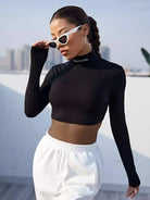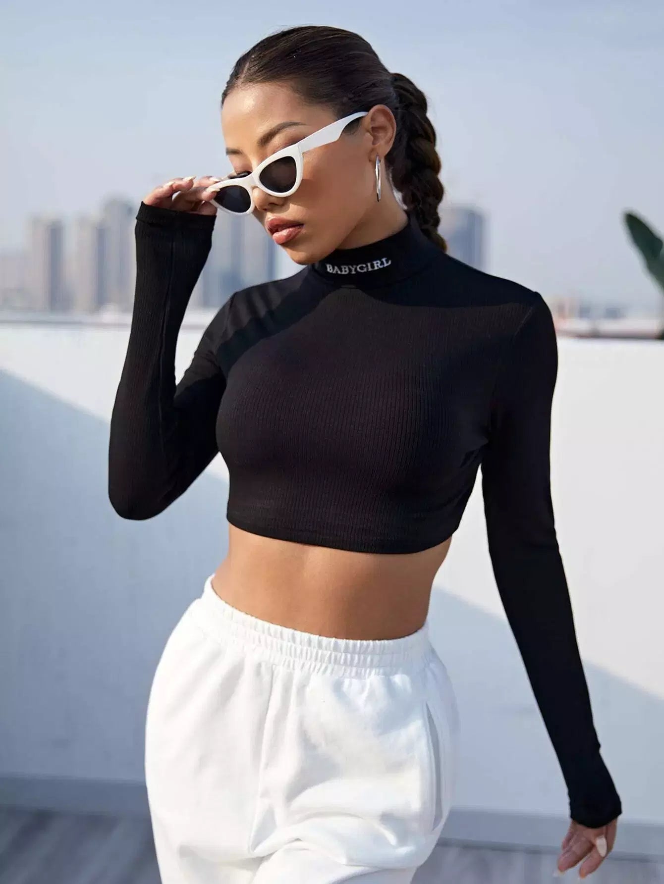 Mock-Neck Letter Embroidery Rib-knit Crop Top