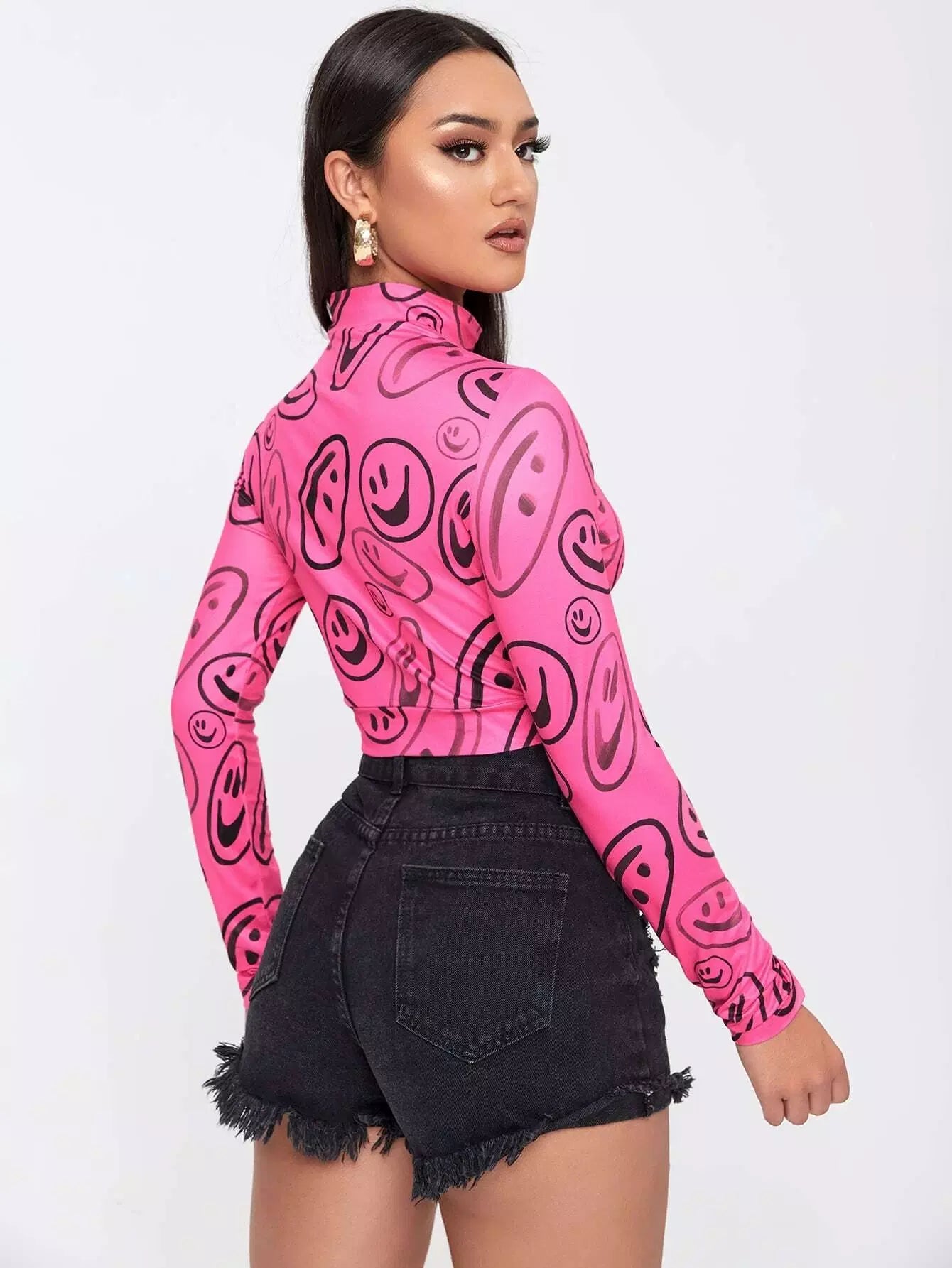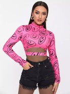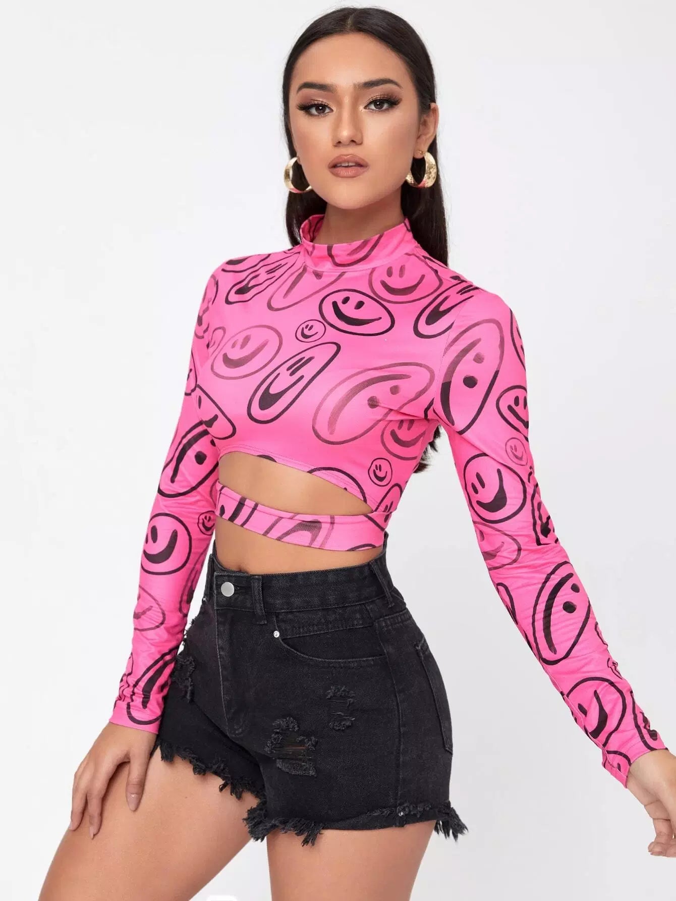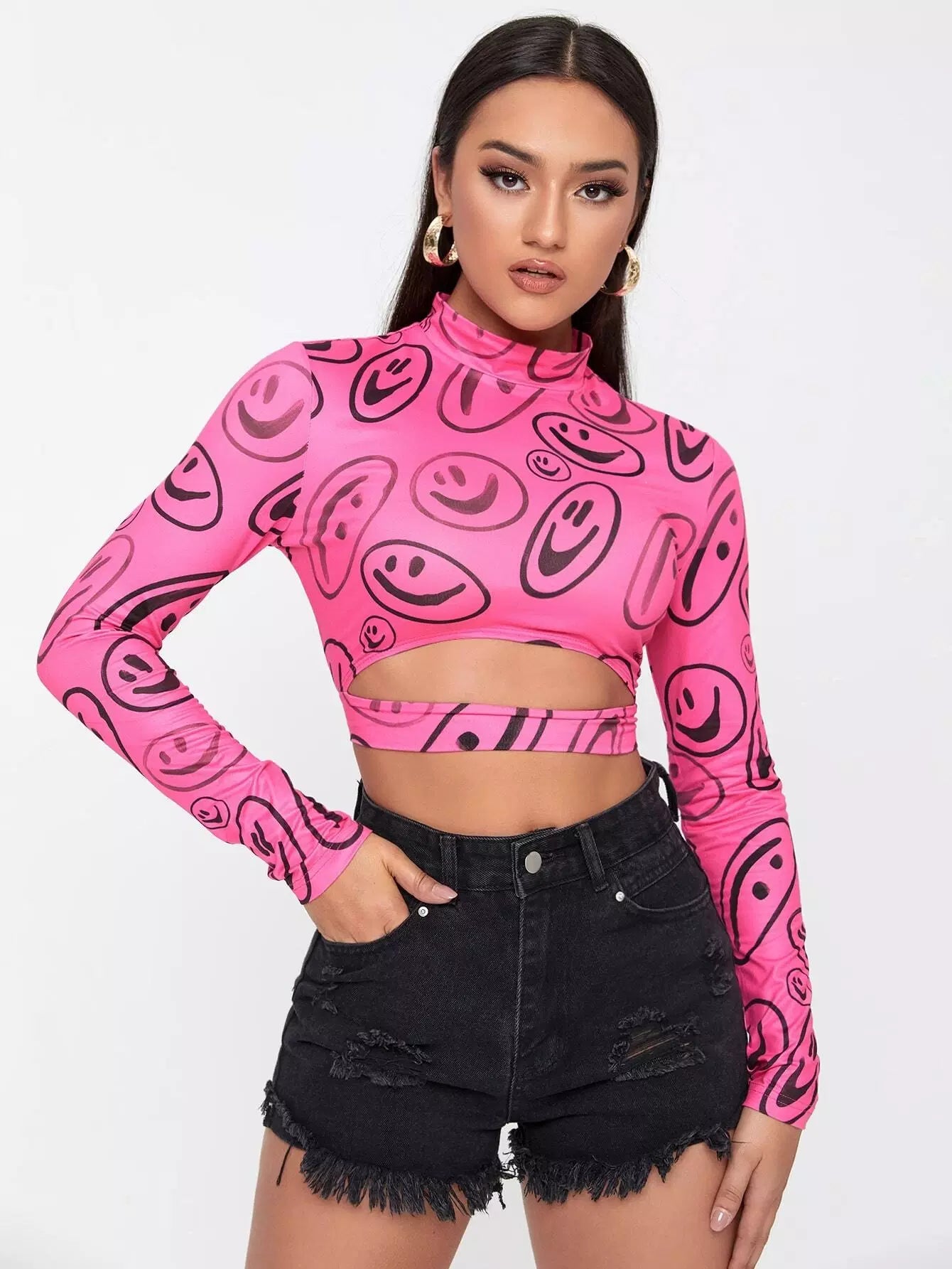 Mock Neck Smile Face Print Cut Out Tee