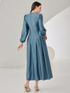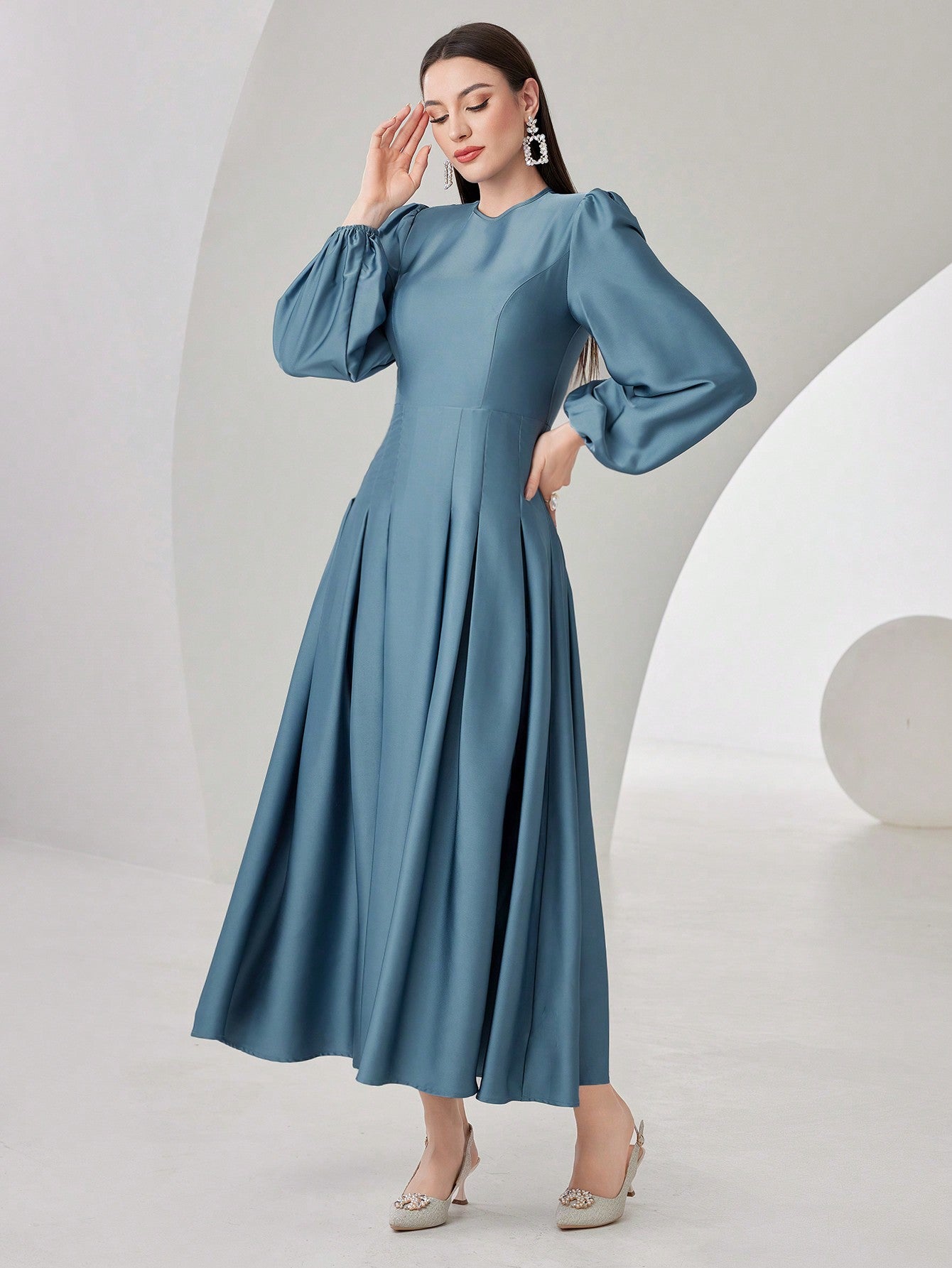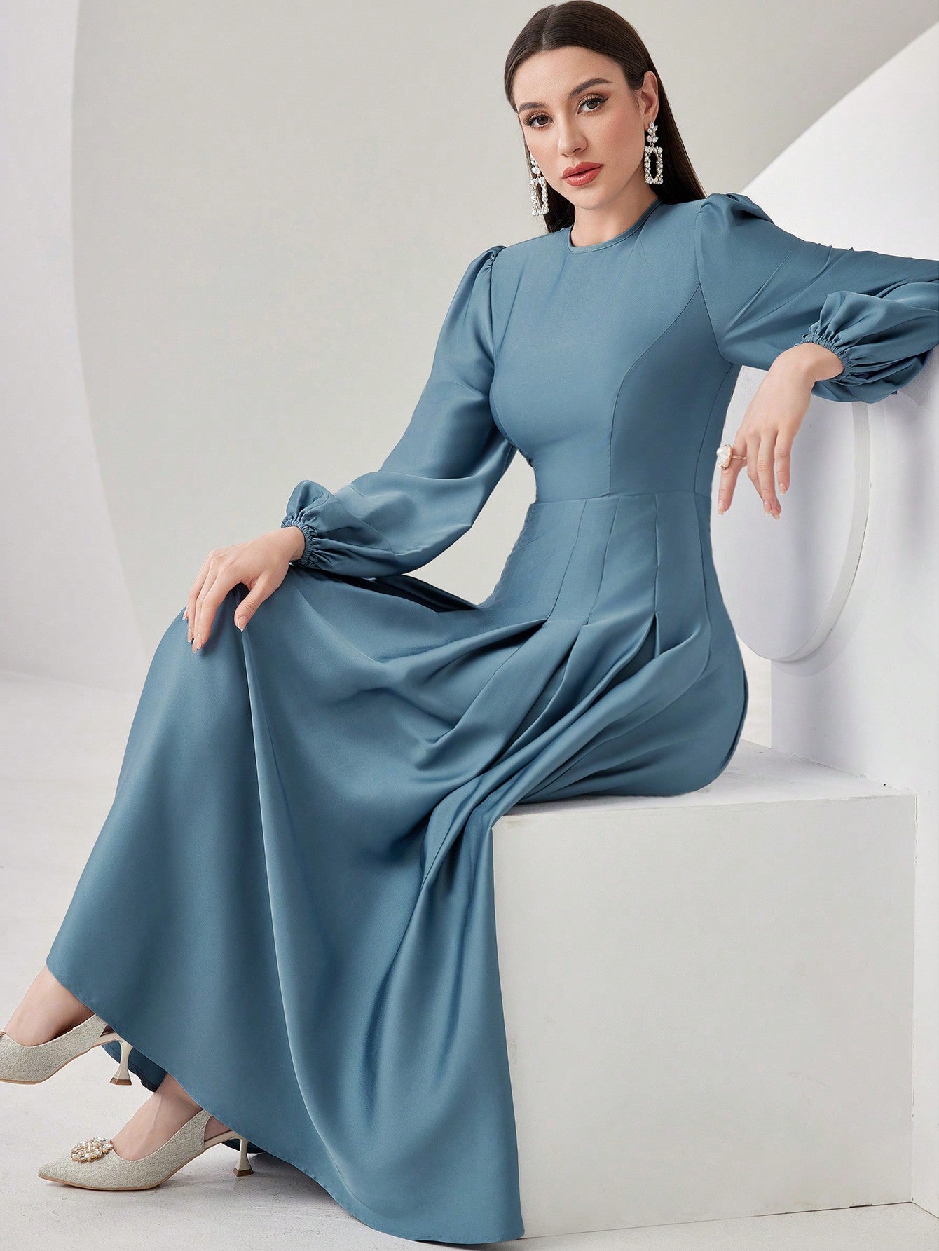 Modelyn Ladies' Solid Color Lantern Sleeve Pleated Dress Long Evening Dresses