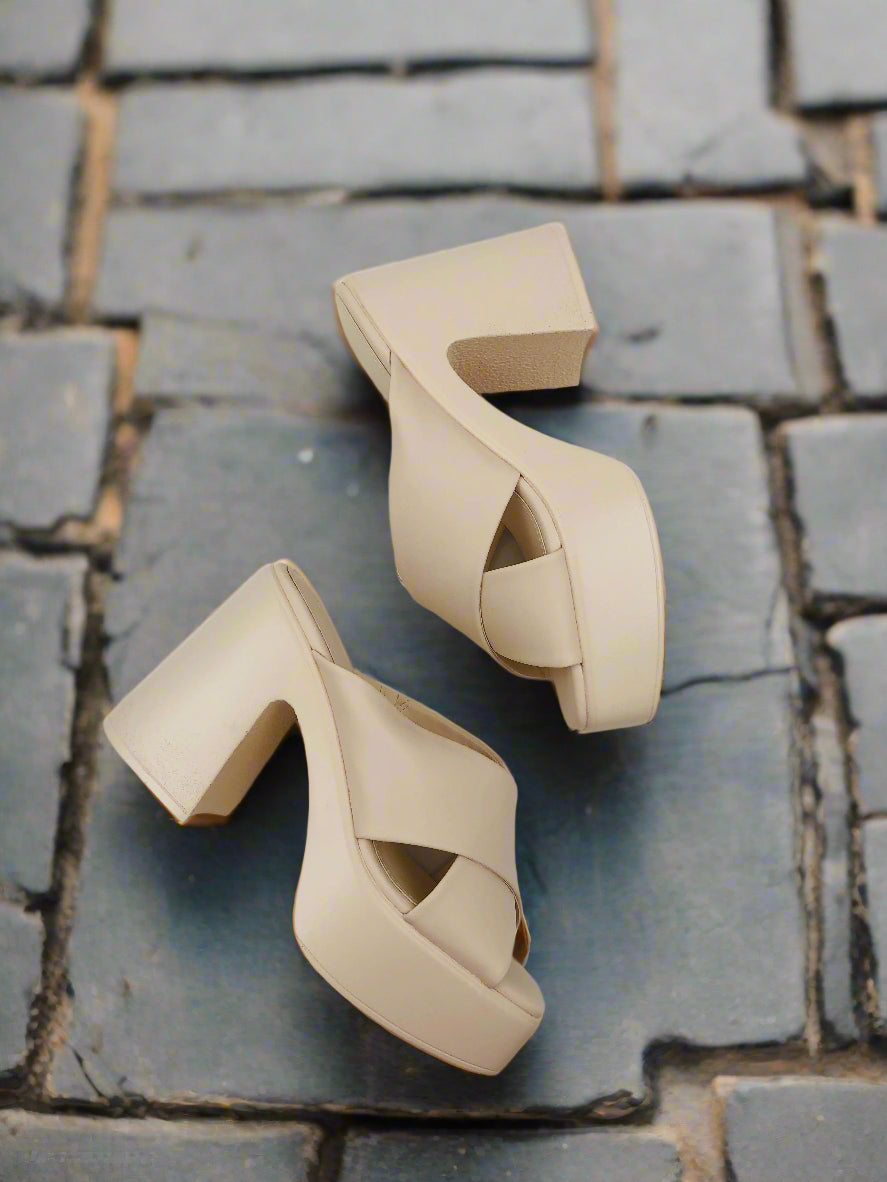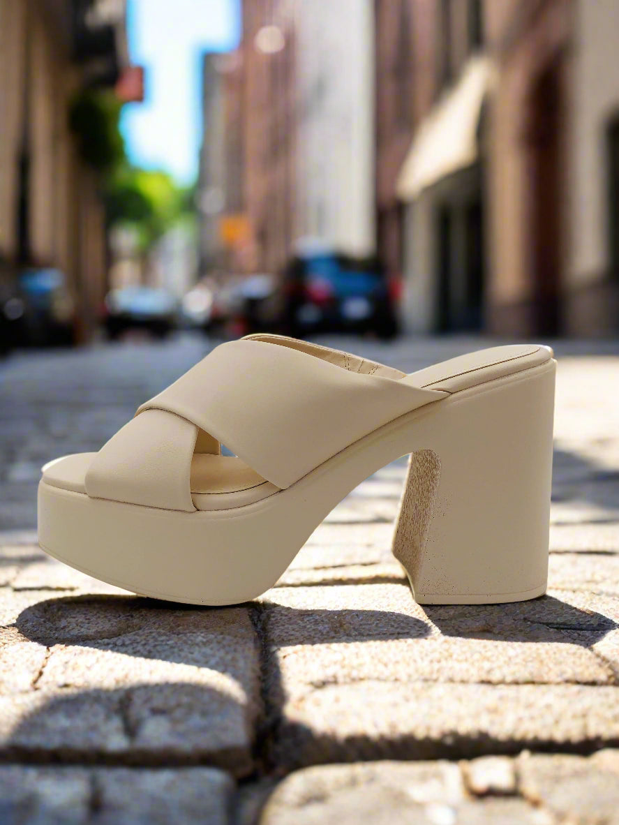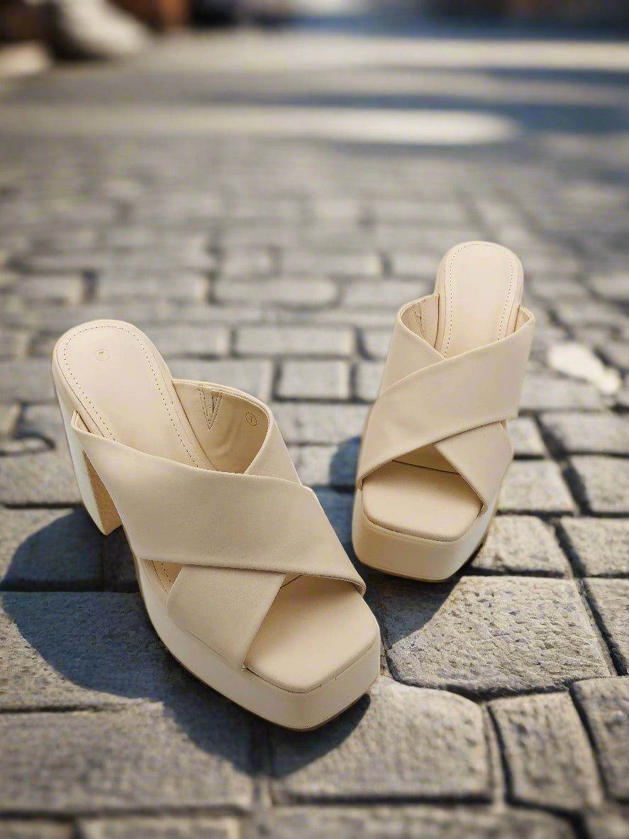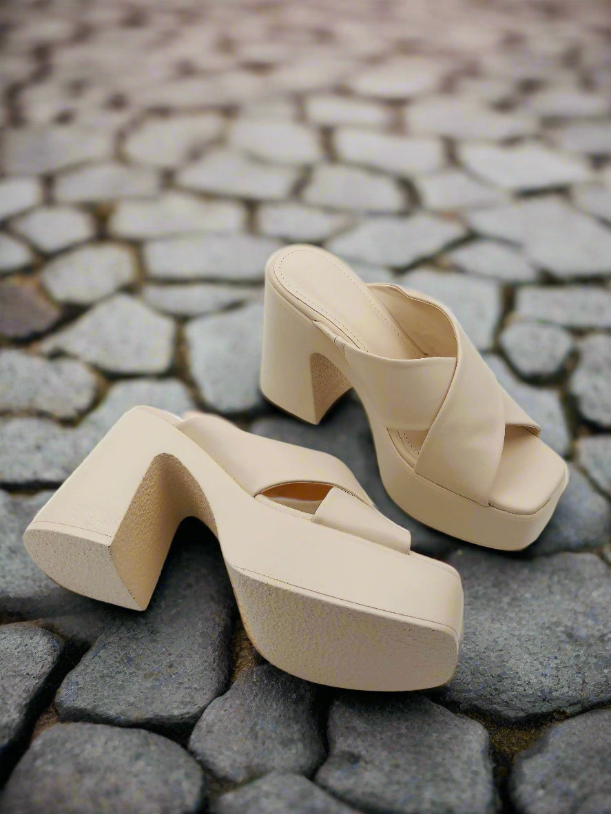 Modern and elegant white mules with a platform heel, open at the front and featuring a wide crisscross strap across the instep.