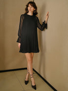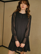 MOTF STUDIO GUIPURE LACE COLLAR CONTRAST SHEER MESH FLARE SLEEVE PLISSE SHORT DRESS