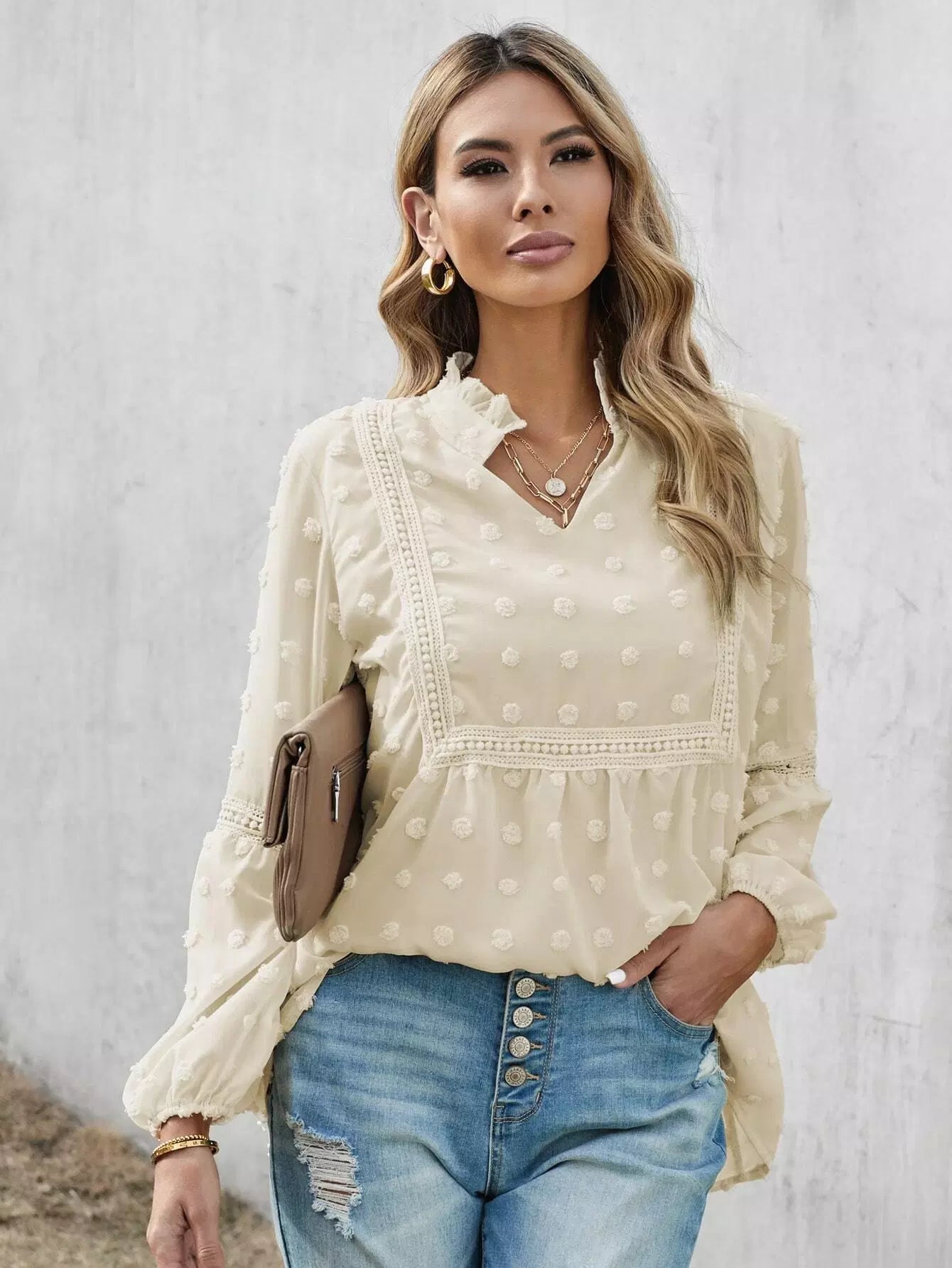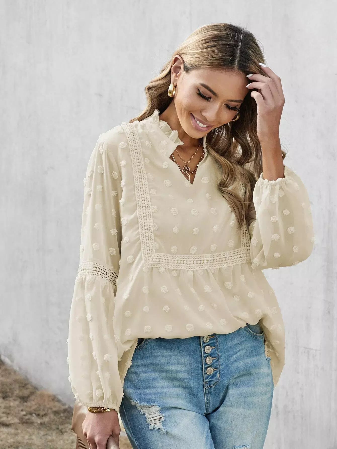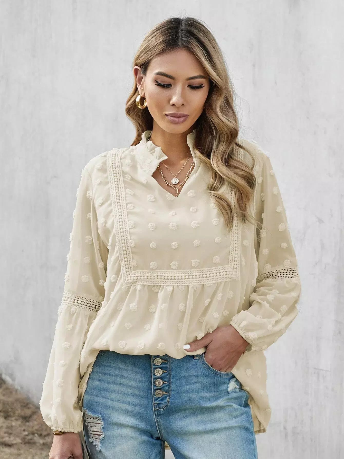 Notch Neck Lace Panel Swiss Dot Chiffon Blouse