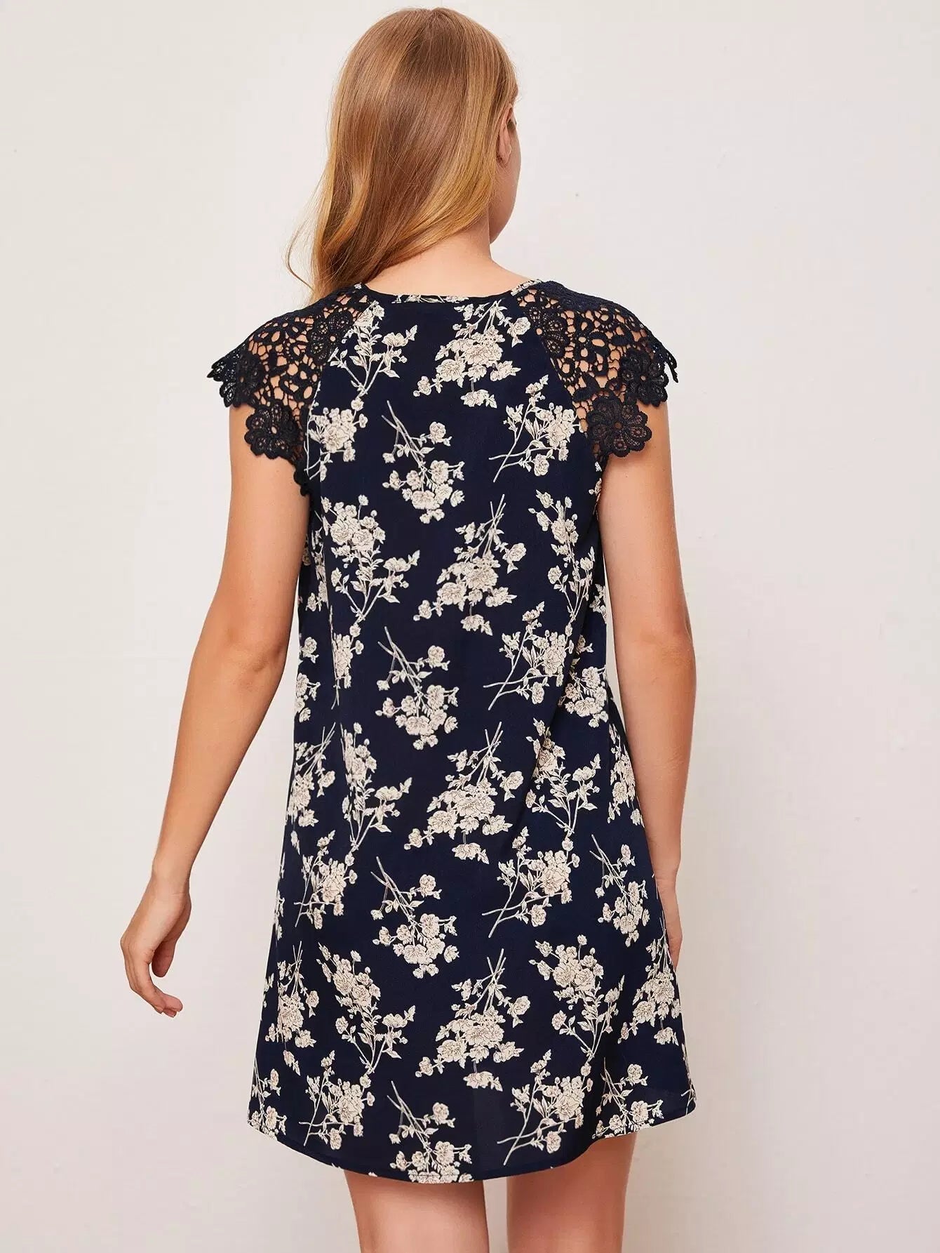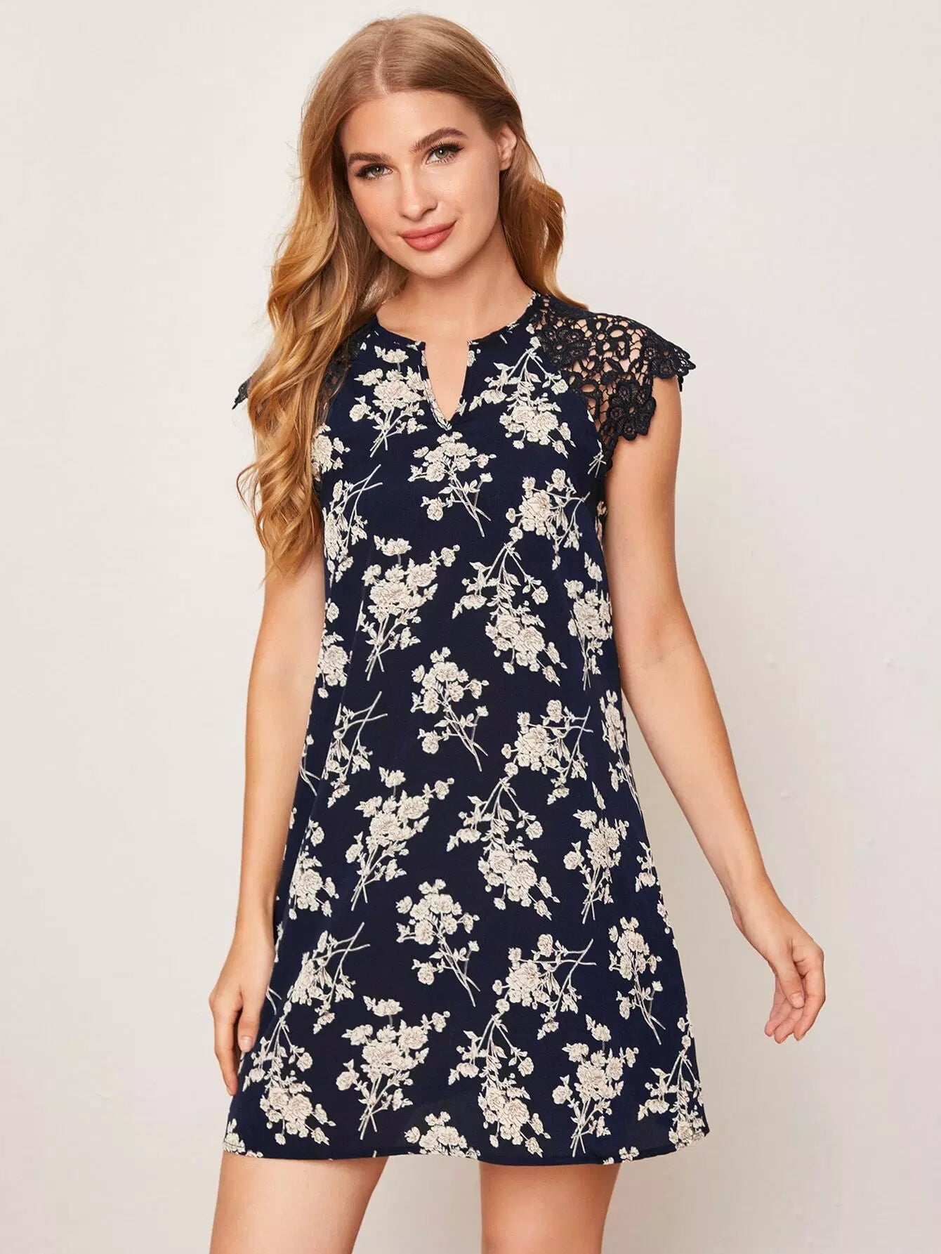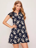 Notched Neck Guipure Lace Shoulder Floral Dress
