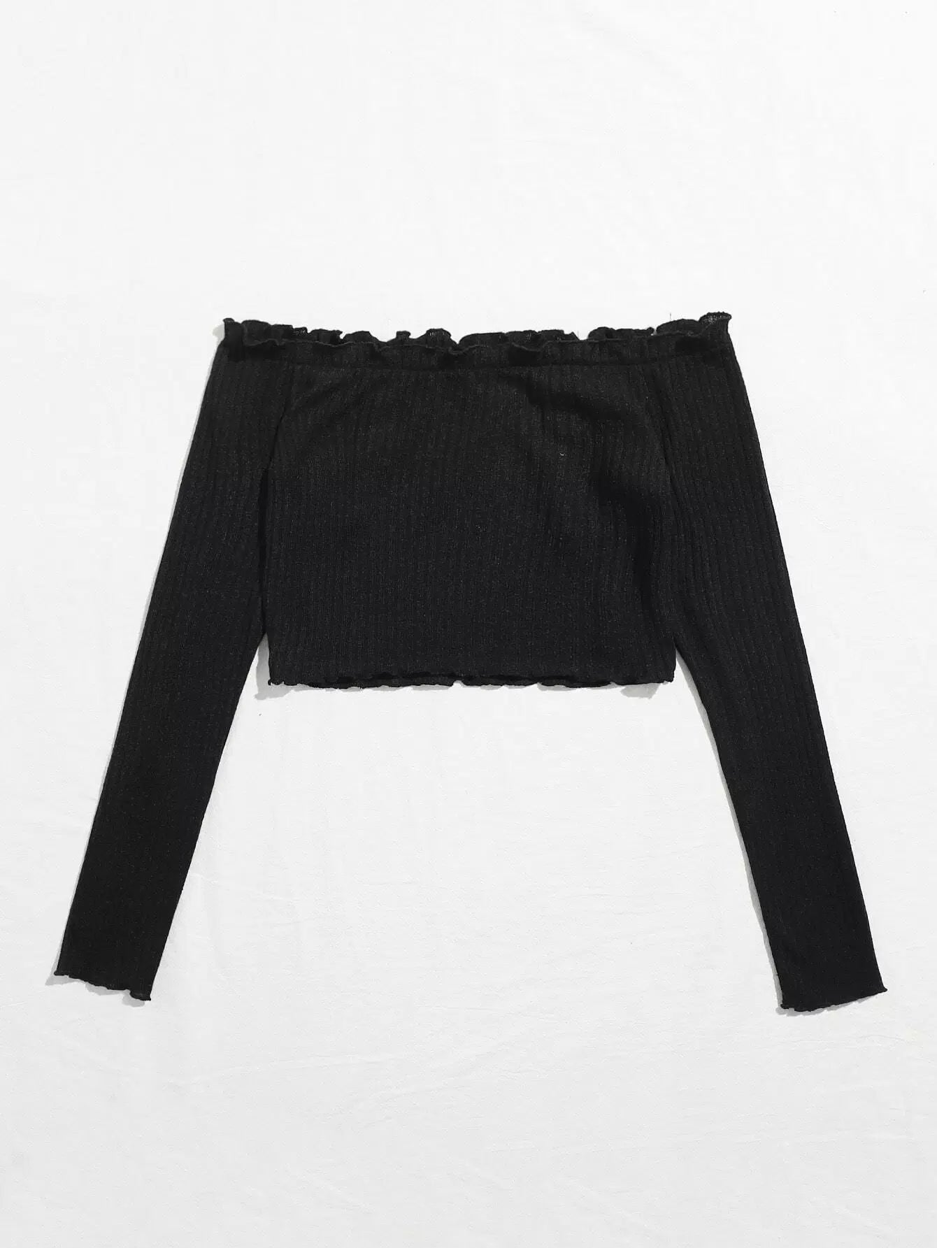 Off Shoulder Lettuce Trim Rib-knit Crop Top