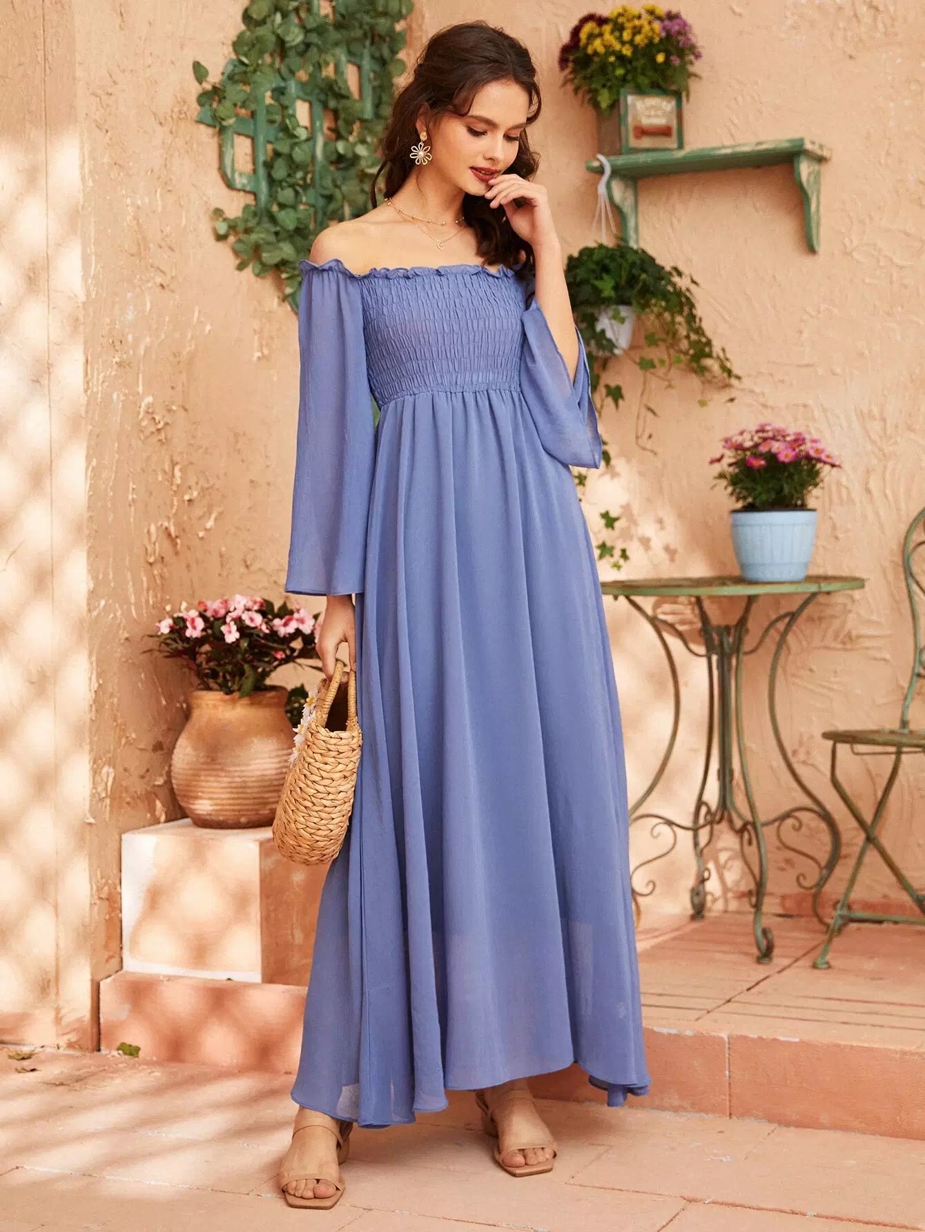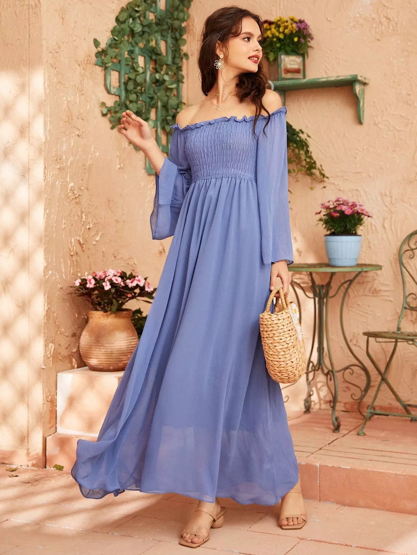Off Shoulder Shirred Bell Sleeve Dress