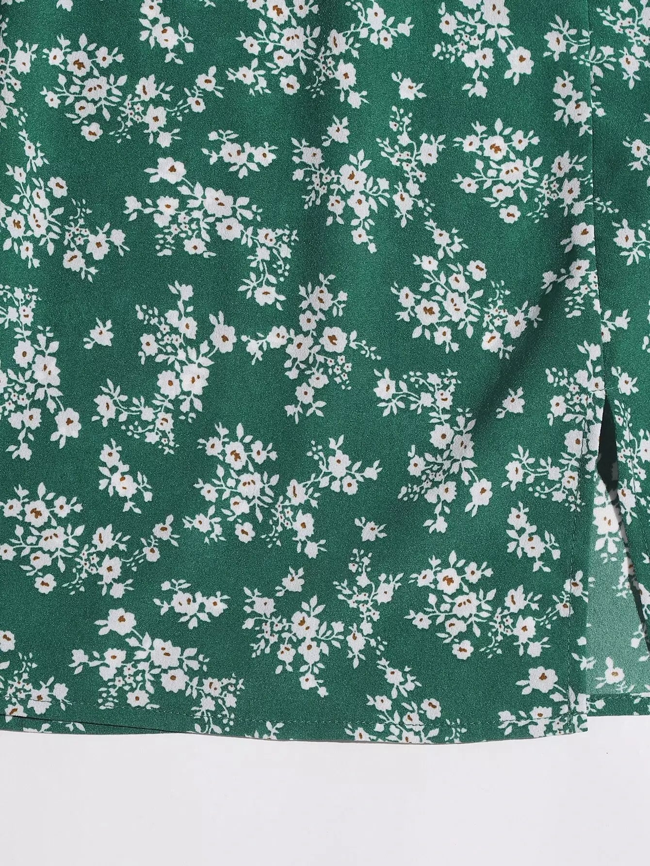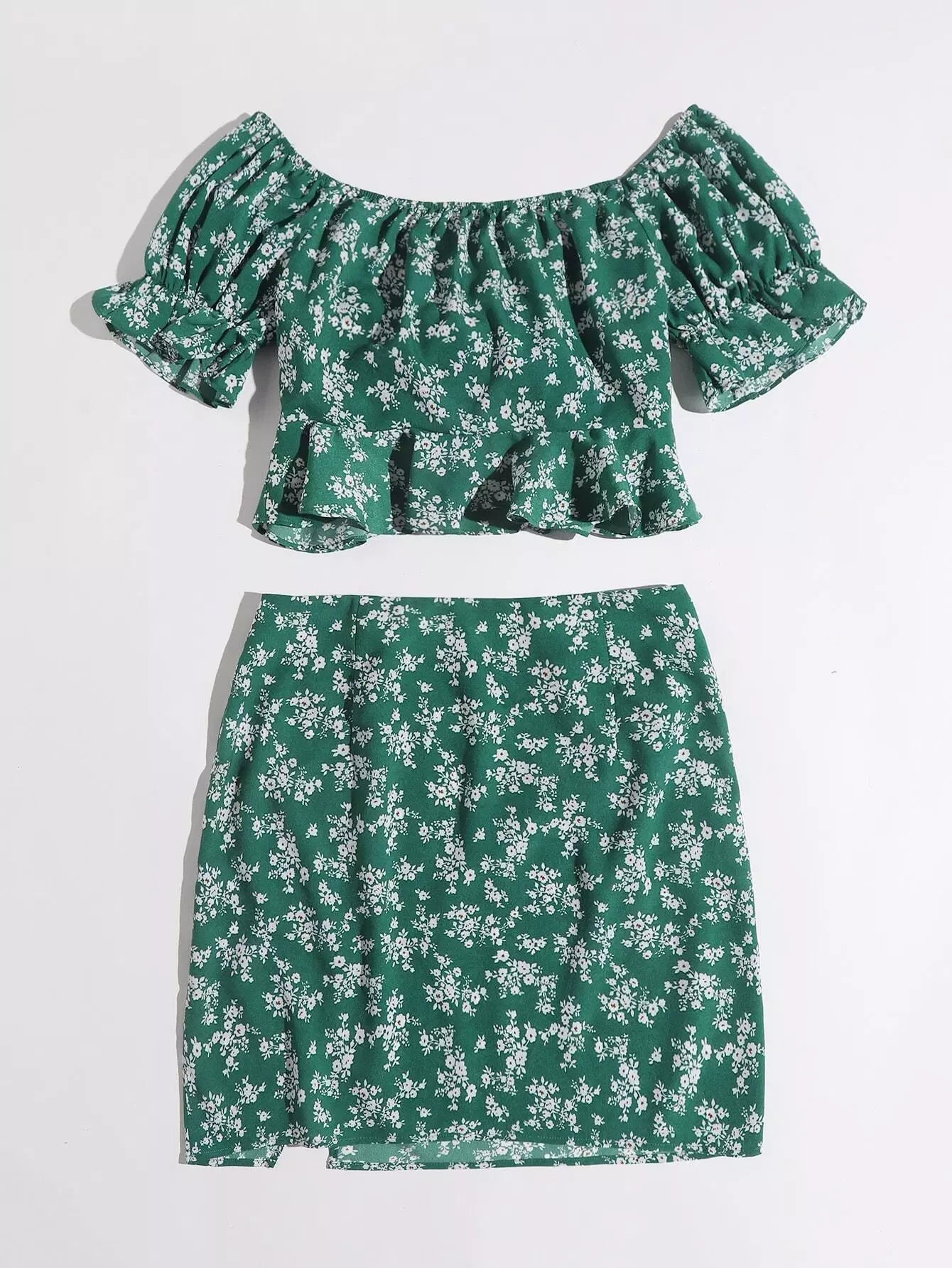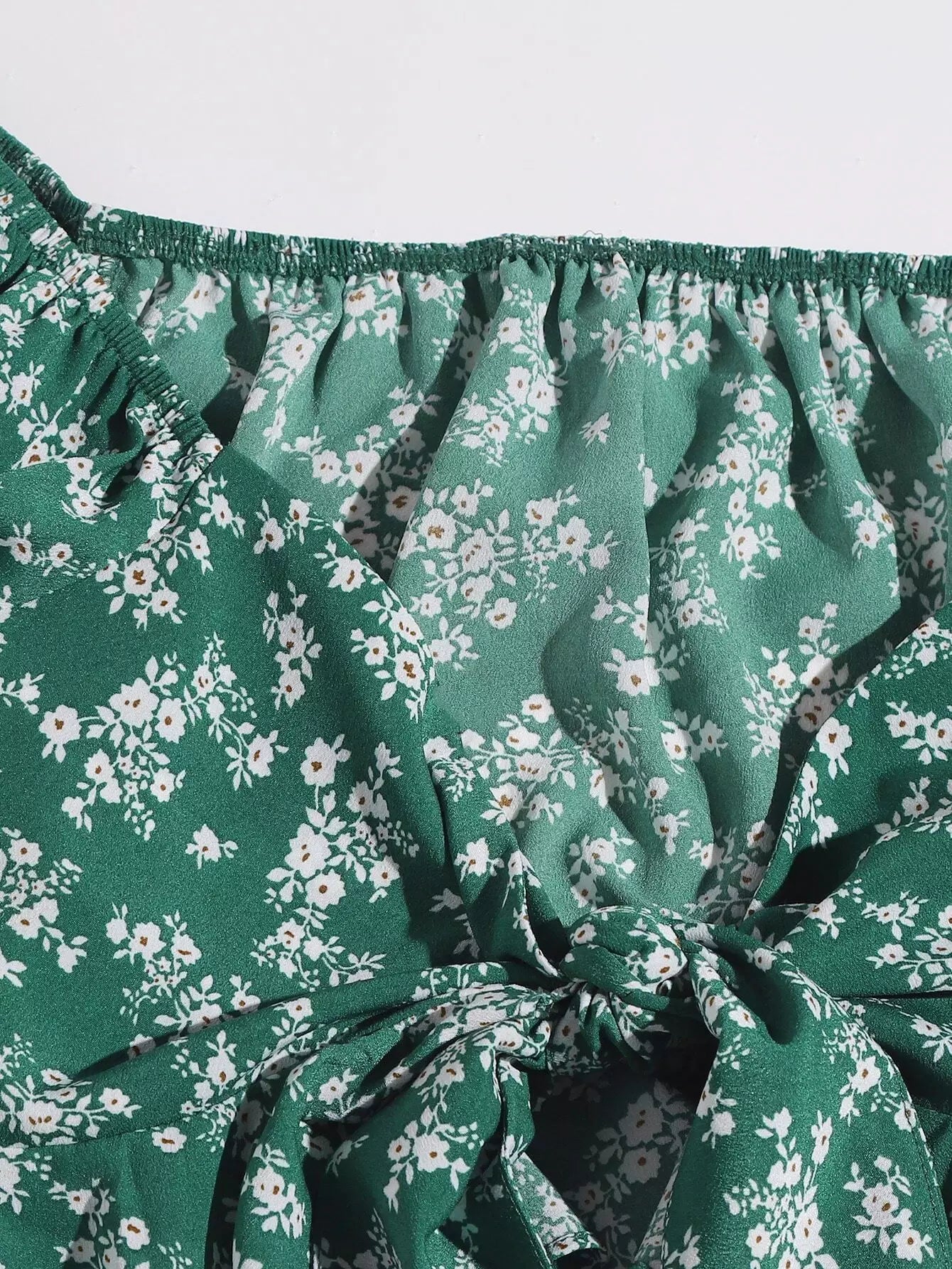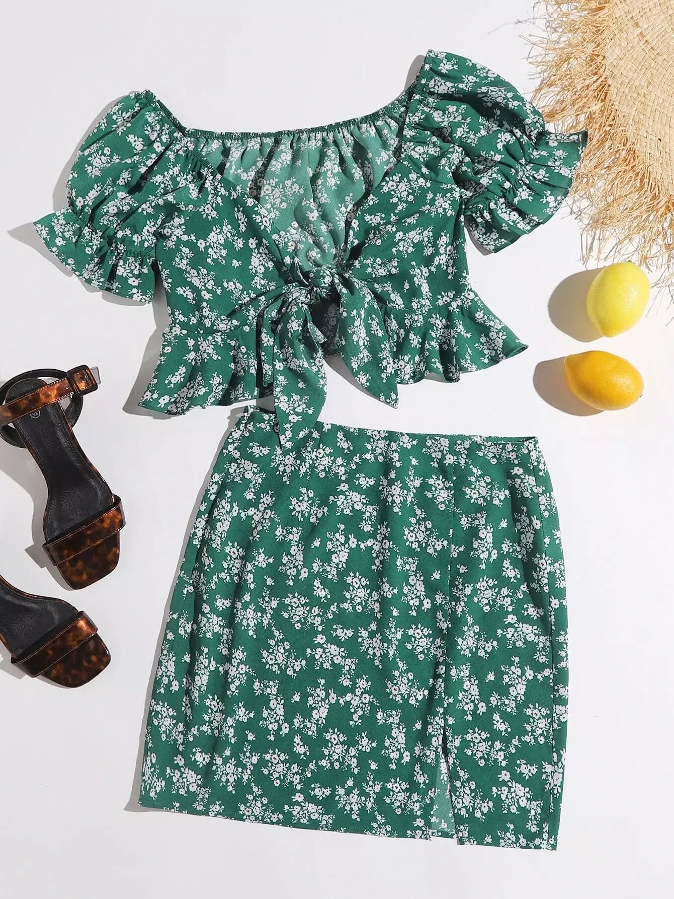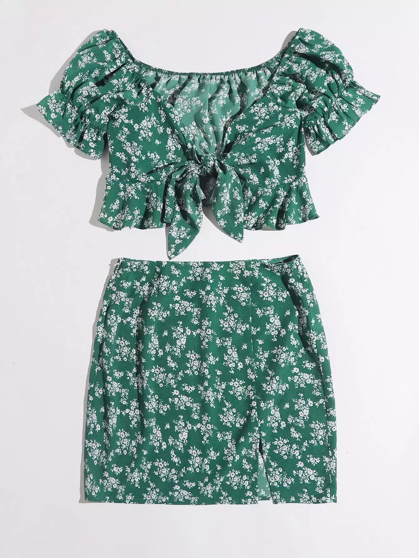 Off Shoulder Tie Front Ruffle Trim Ditsy Floral Top & Skirt Set