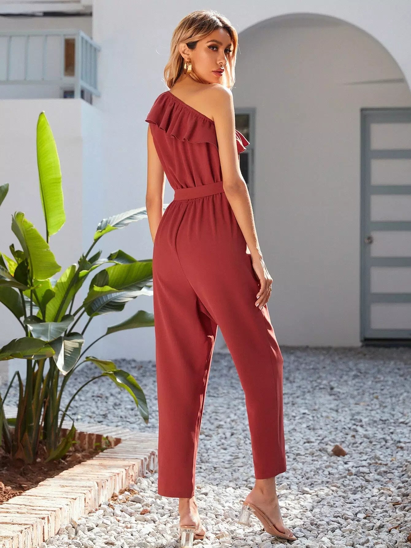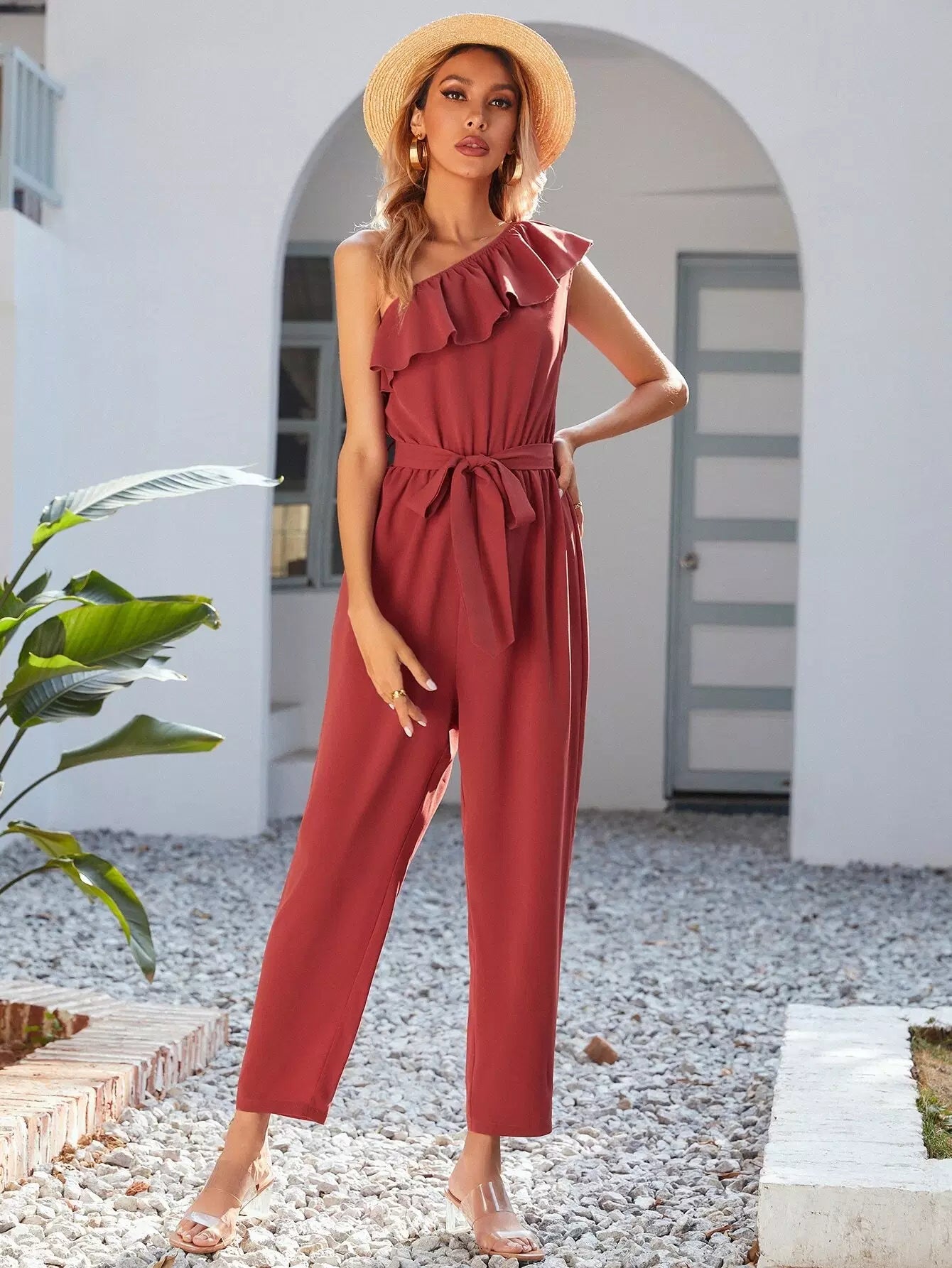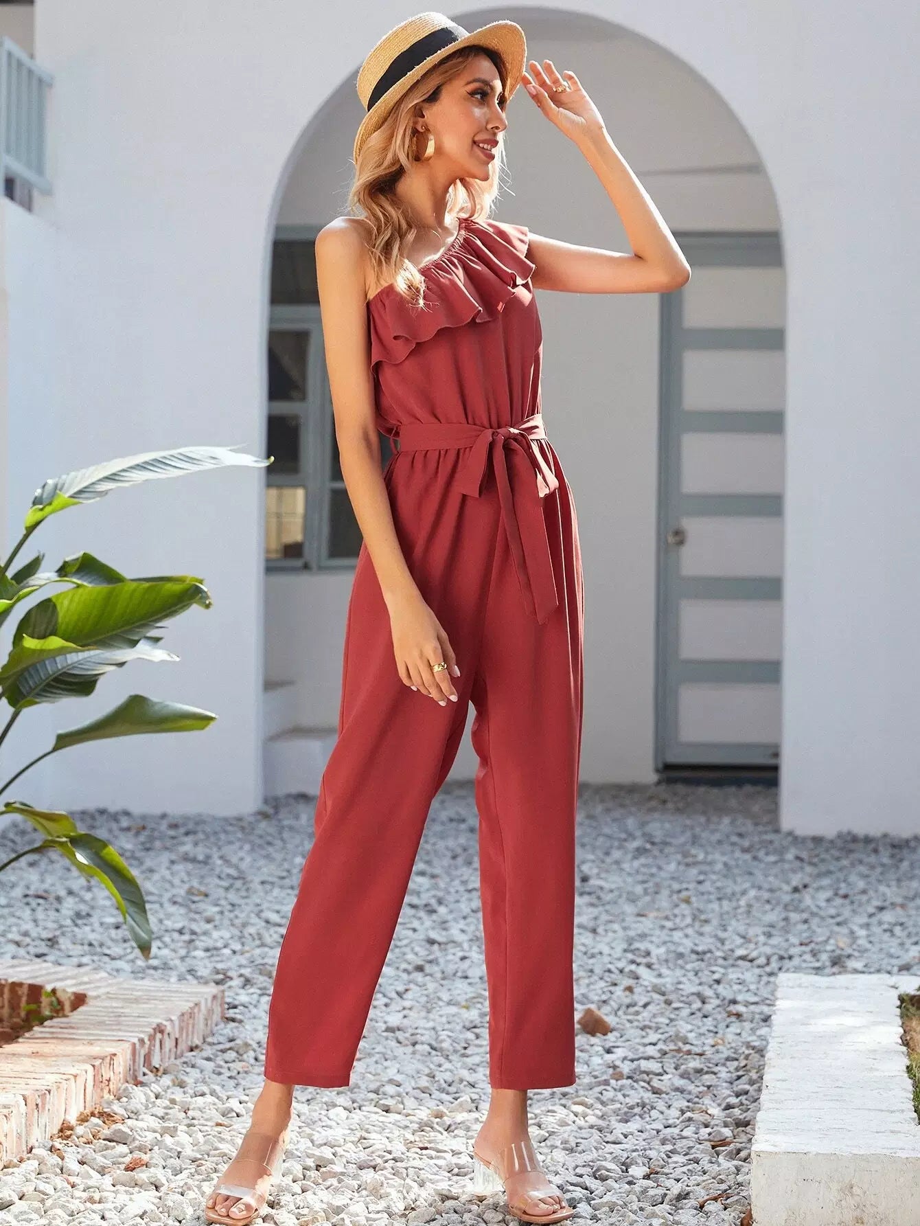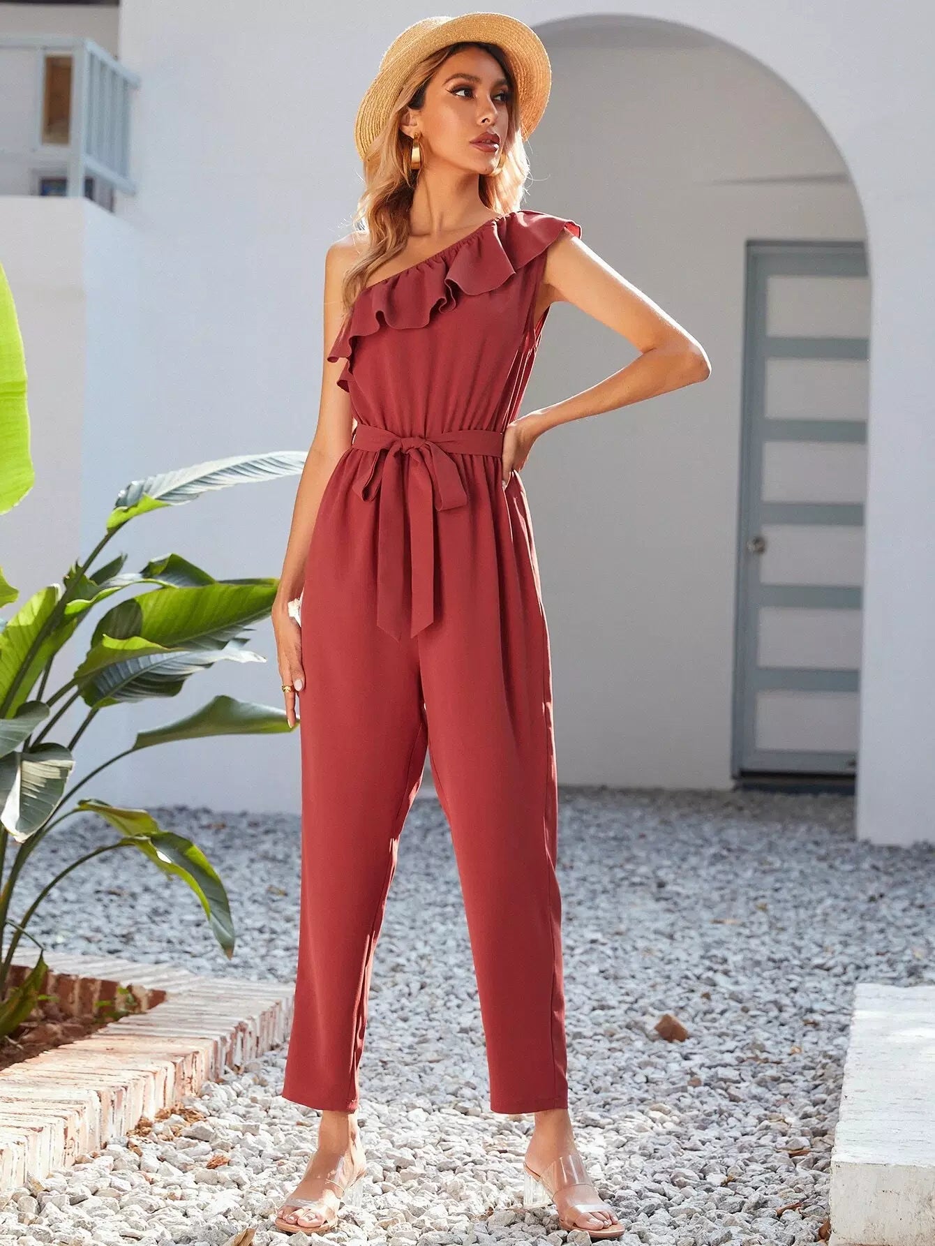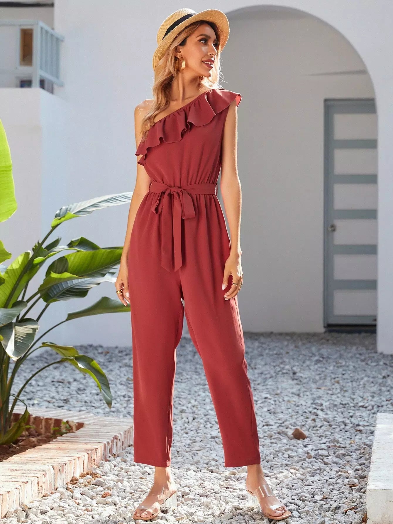 One Shoulder Ruffle Trim Self Tie Jumpsuit