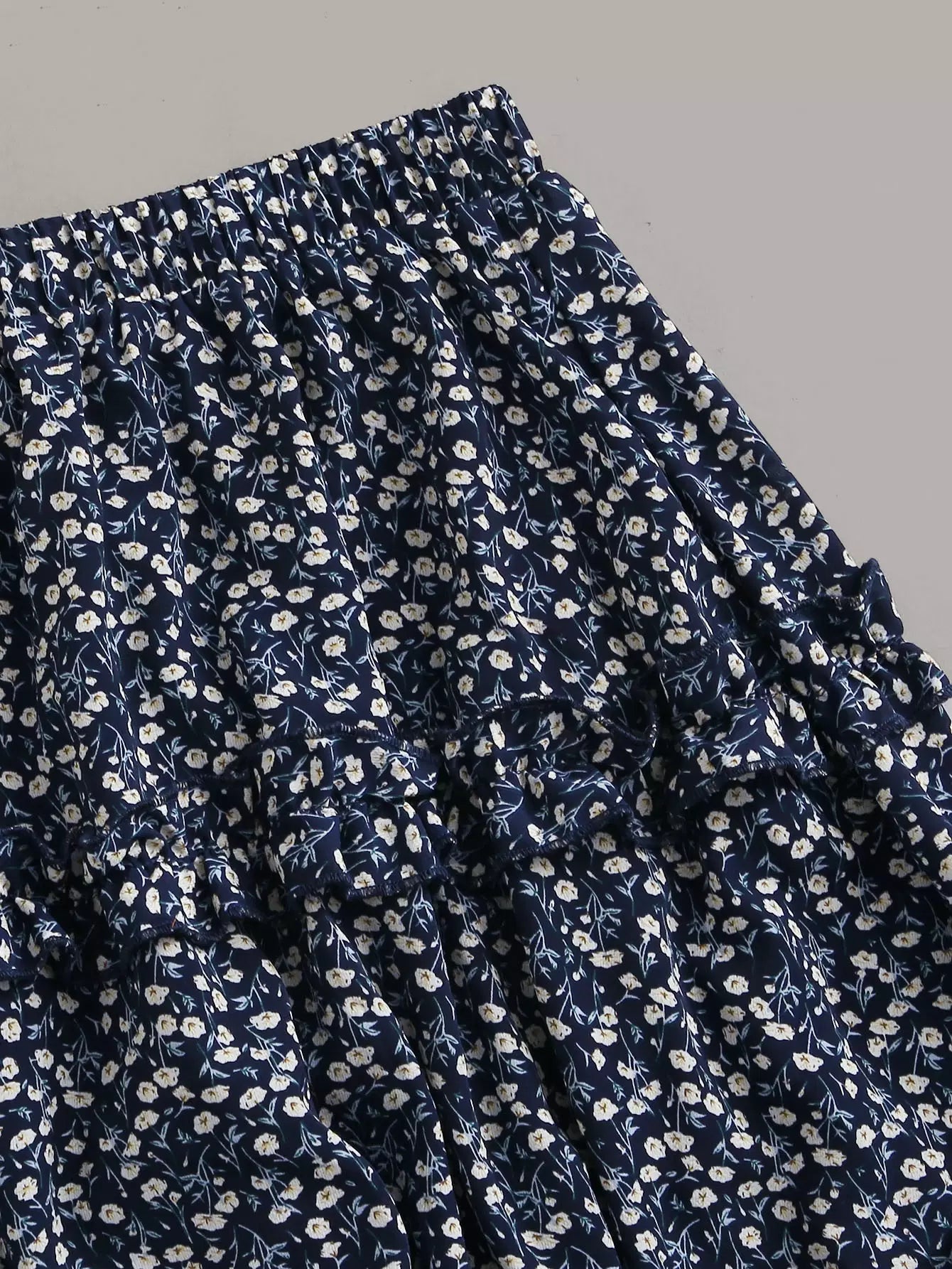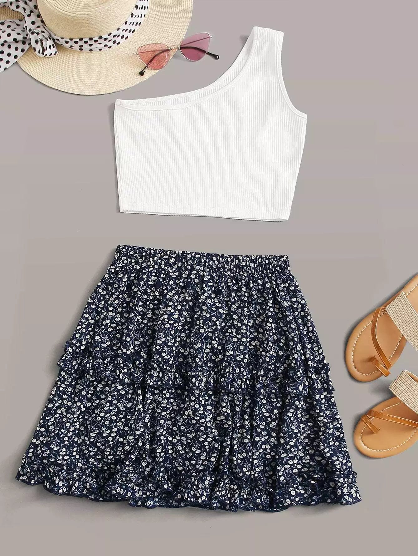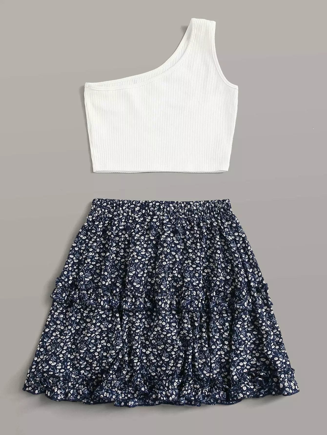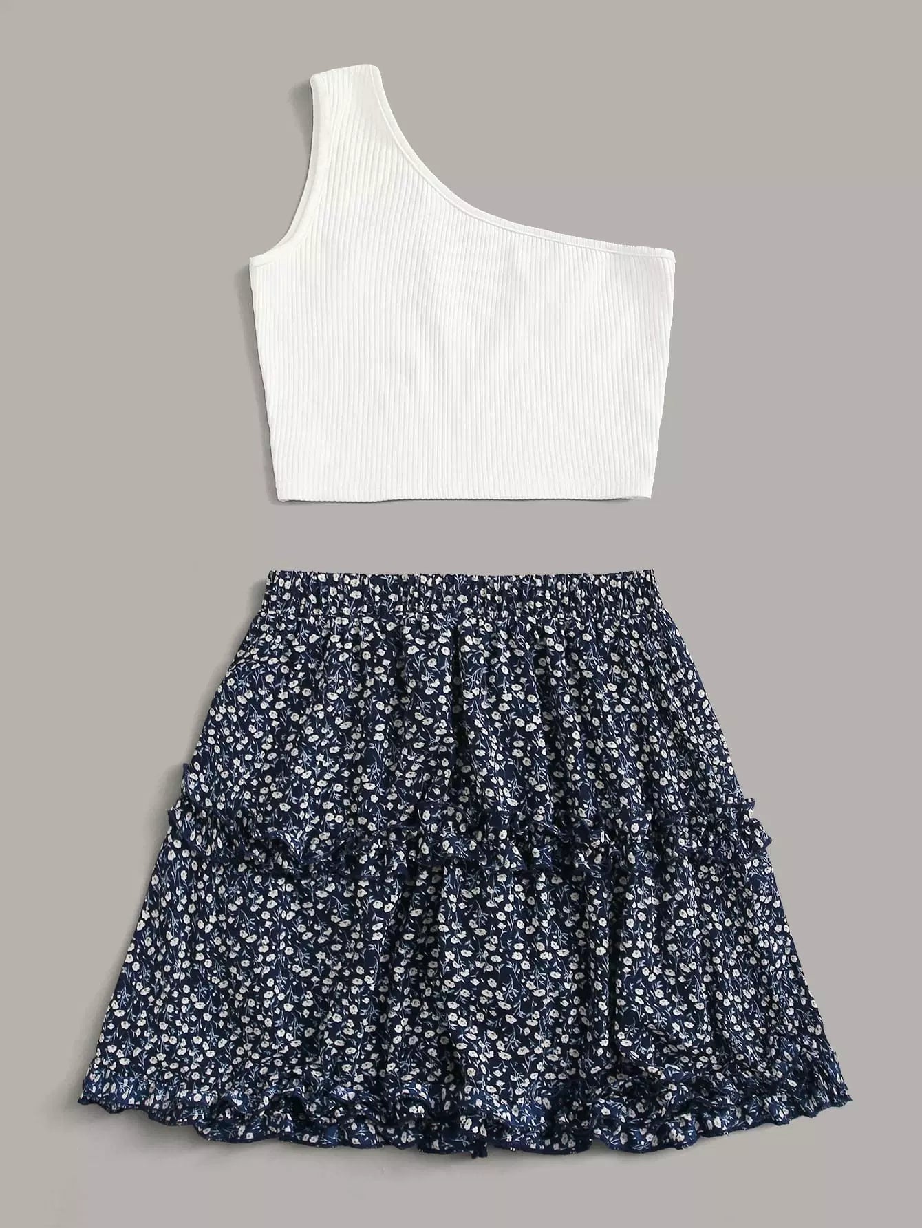 One Shoulder Top With Ditsy Floral Layered Skirt