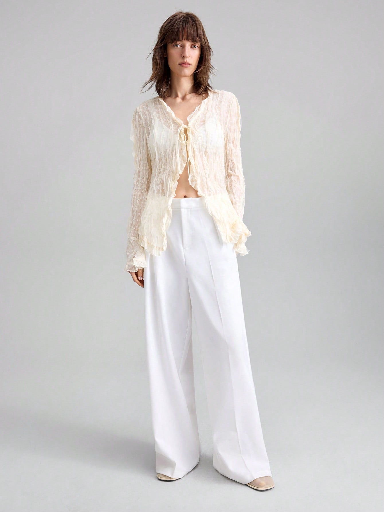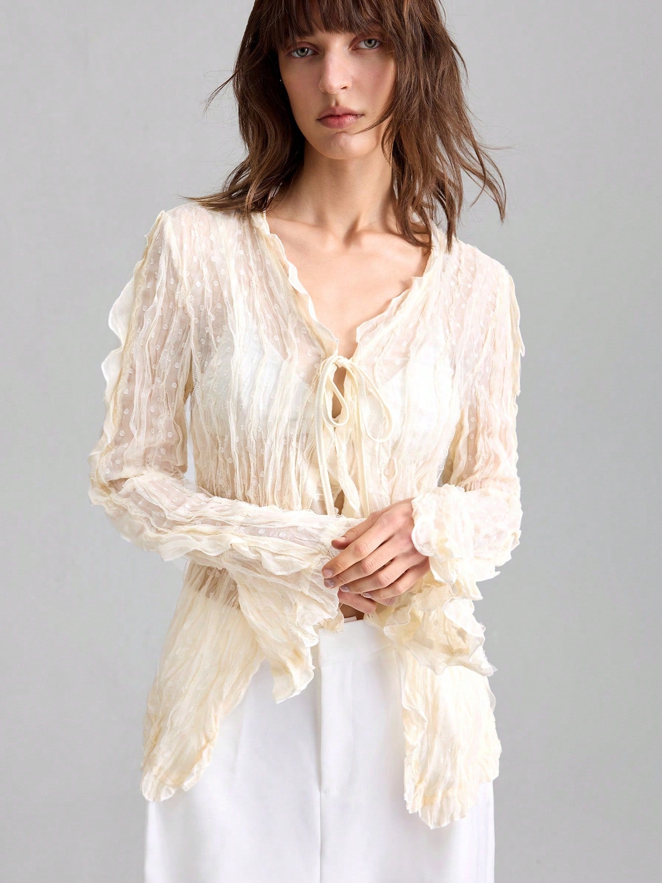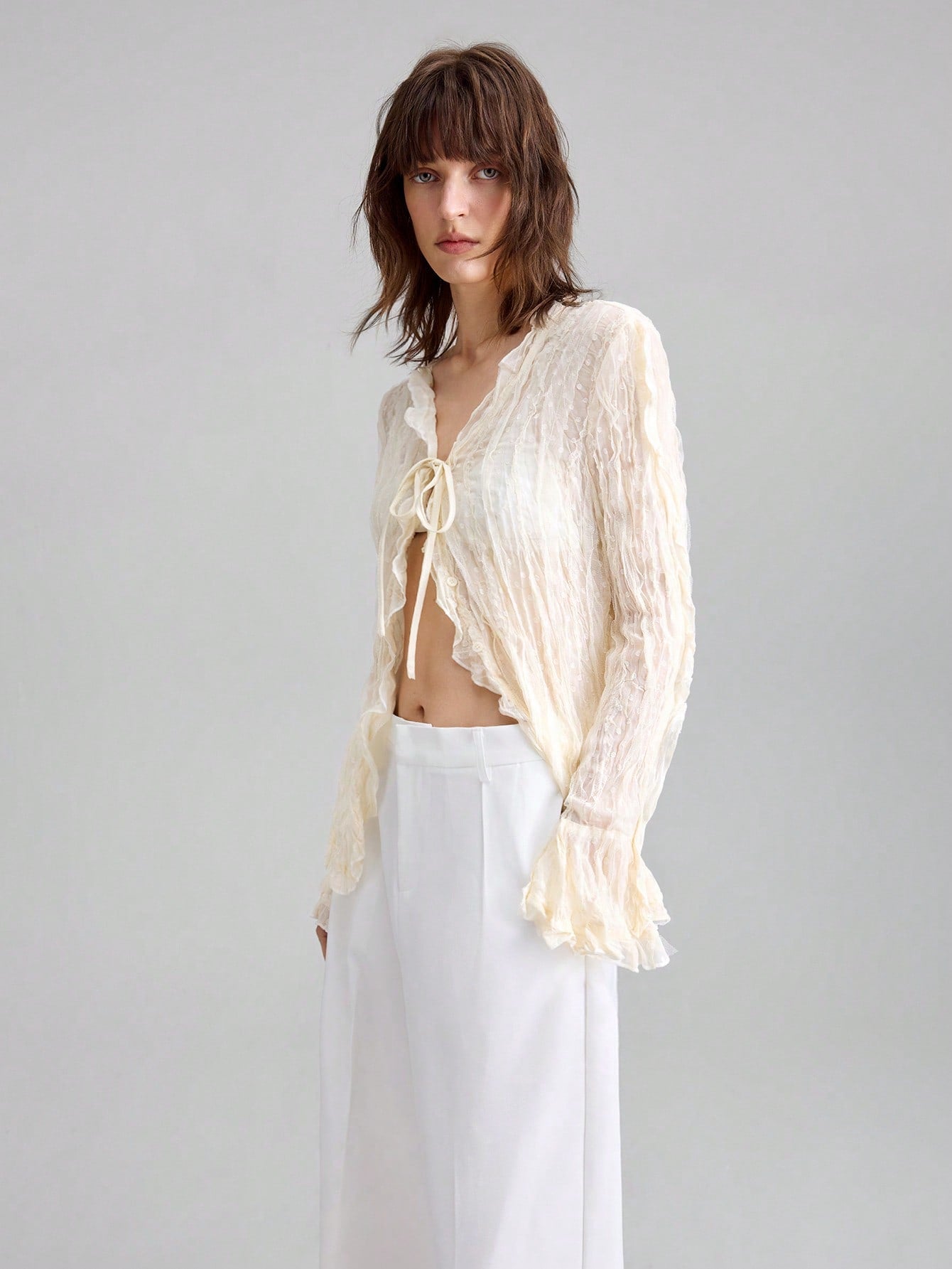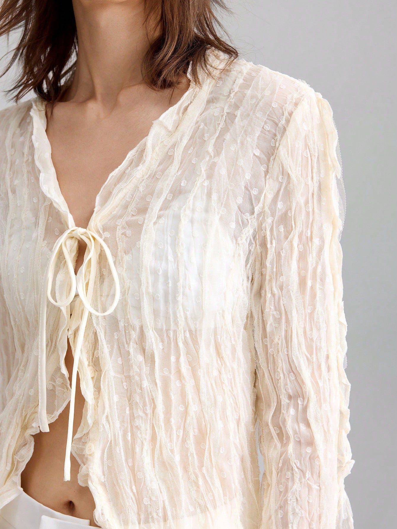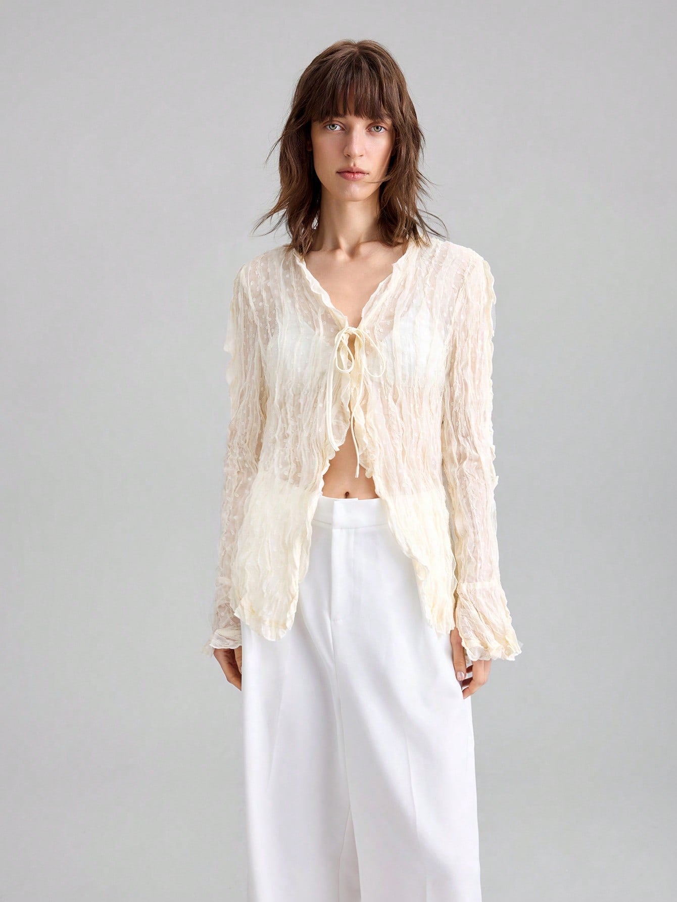 Ontre 2025 Women Solid Color Minimalist Casual Tie Front Long Sleeve Top, Suitable For American Independence