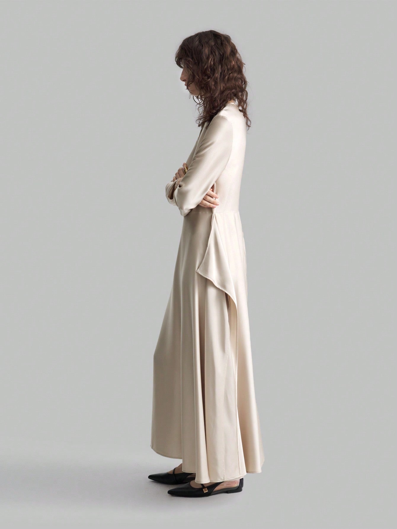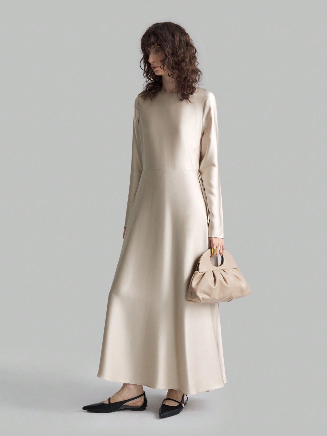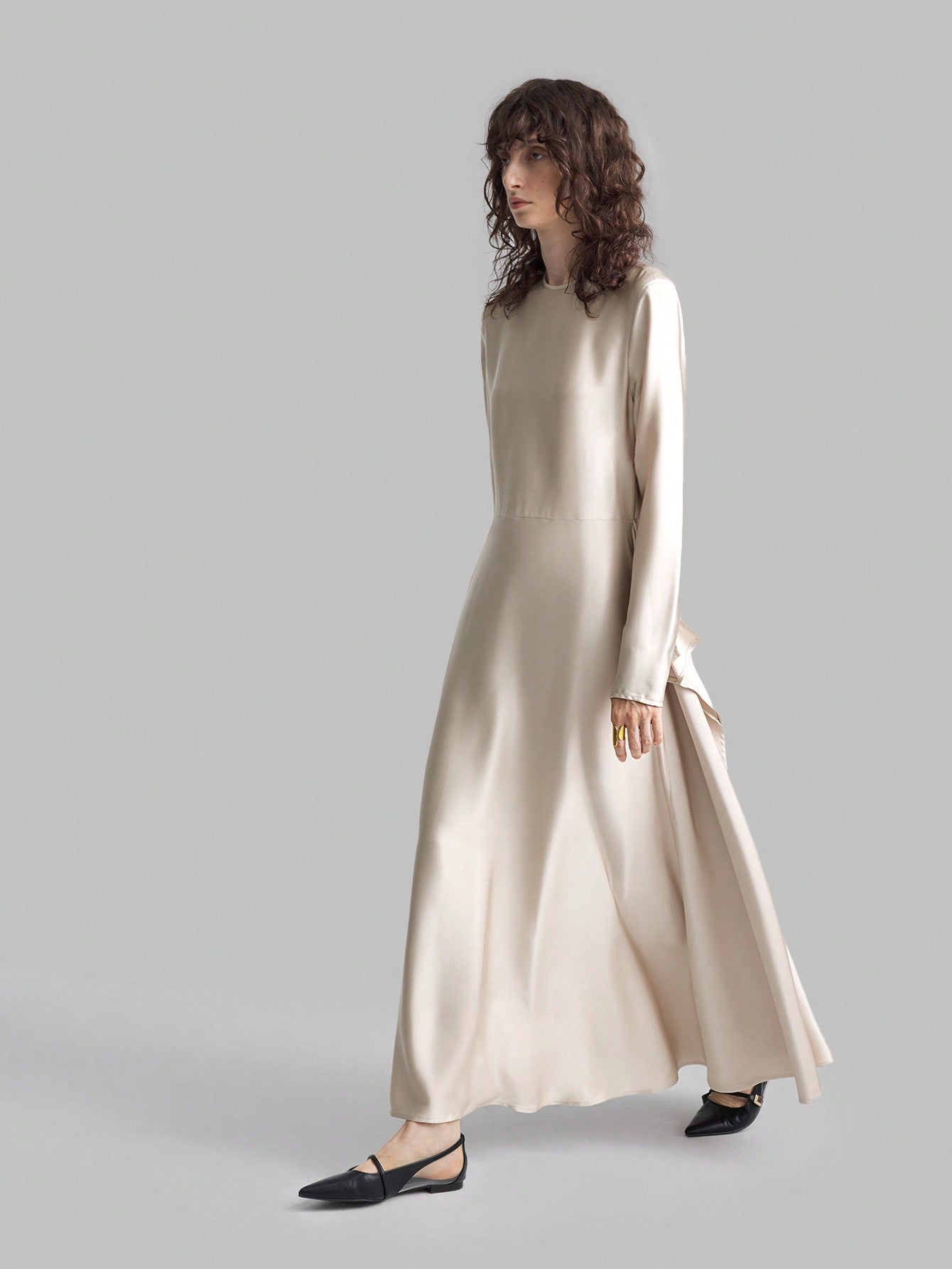 Ontre Women's Apricot Asymmetrical Hem Long Sleeve Round Neck Satin Dress, New Luxury Minimalist Design