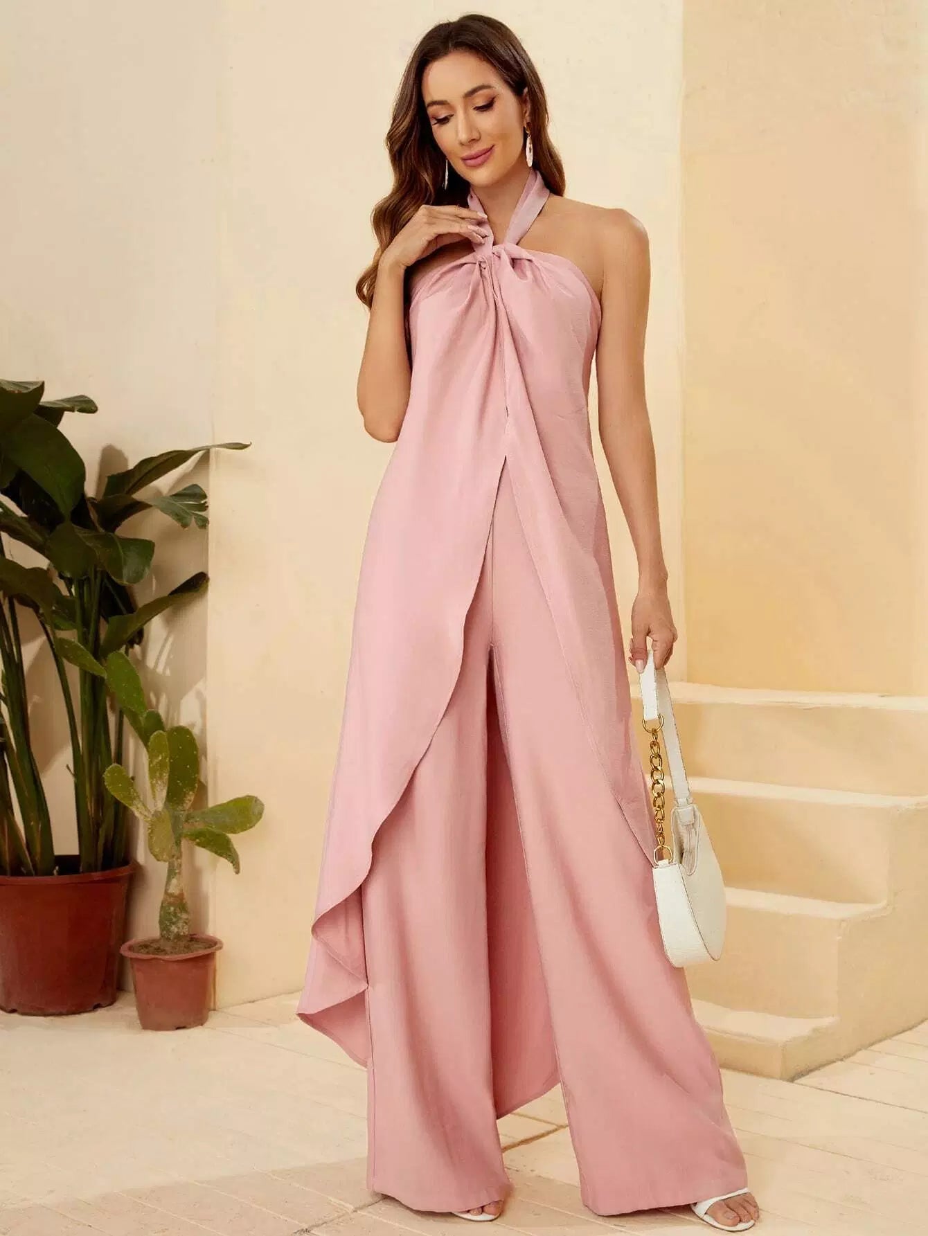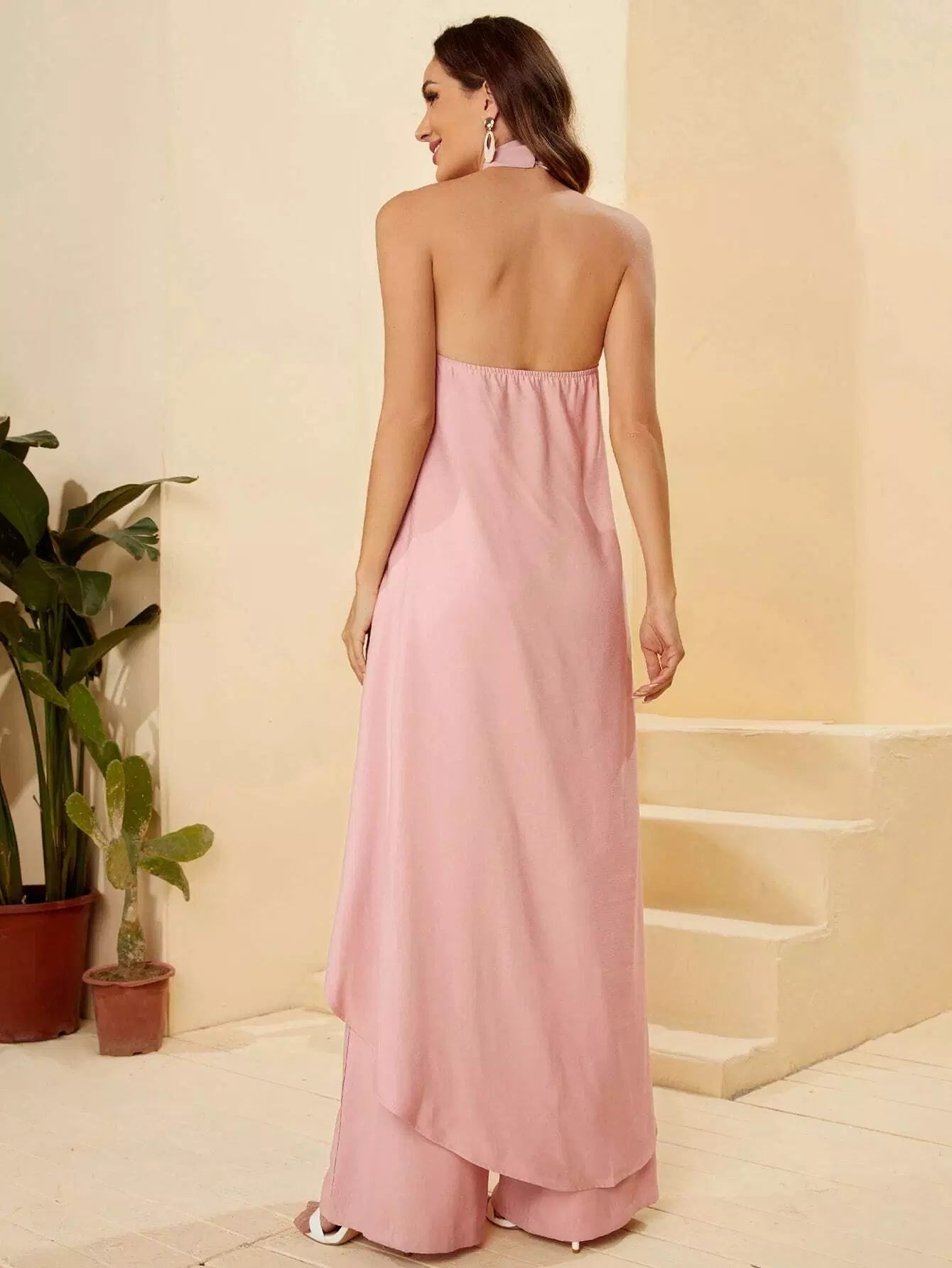 Open Back Asymmetrical Hem Halter Top & Palazzo Pants Set