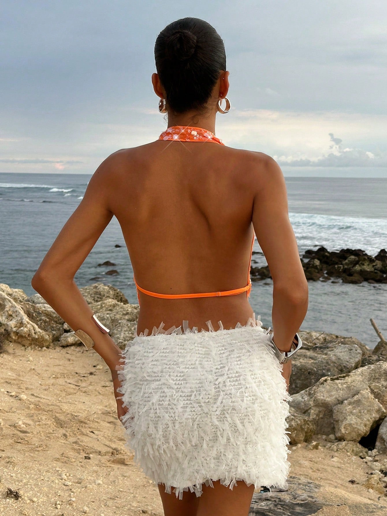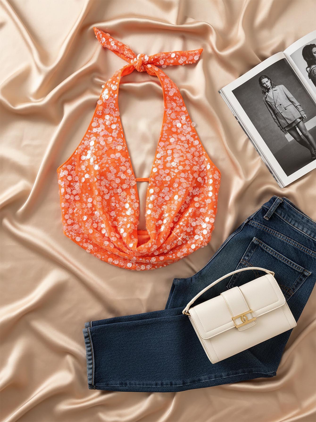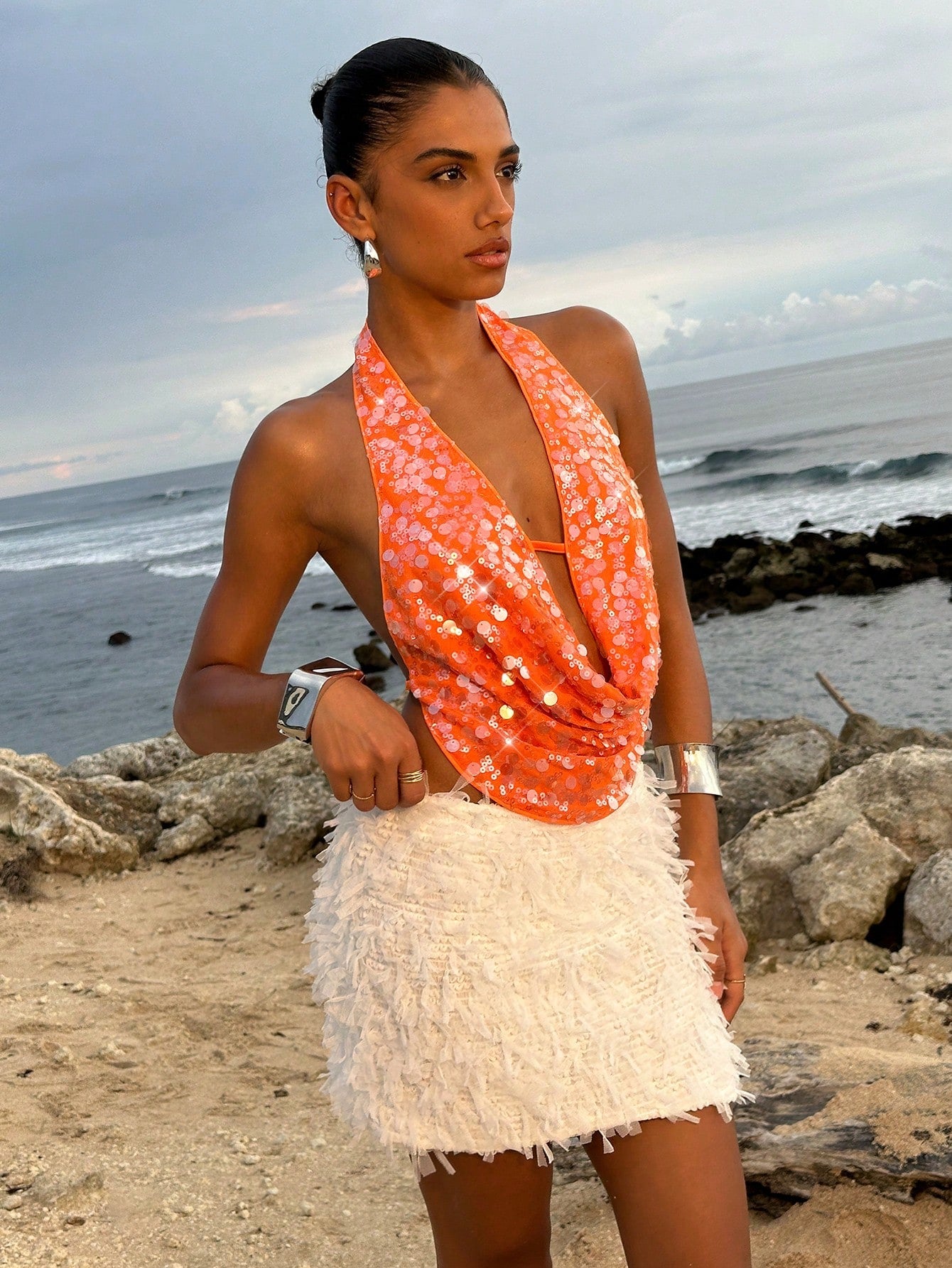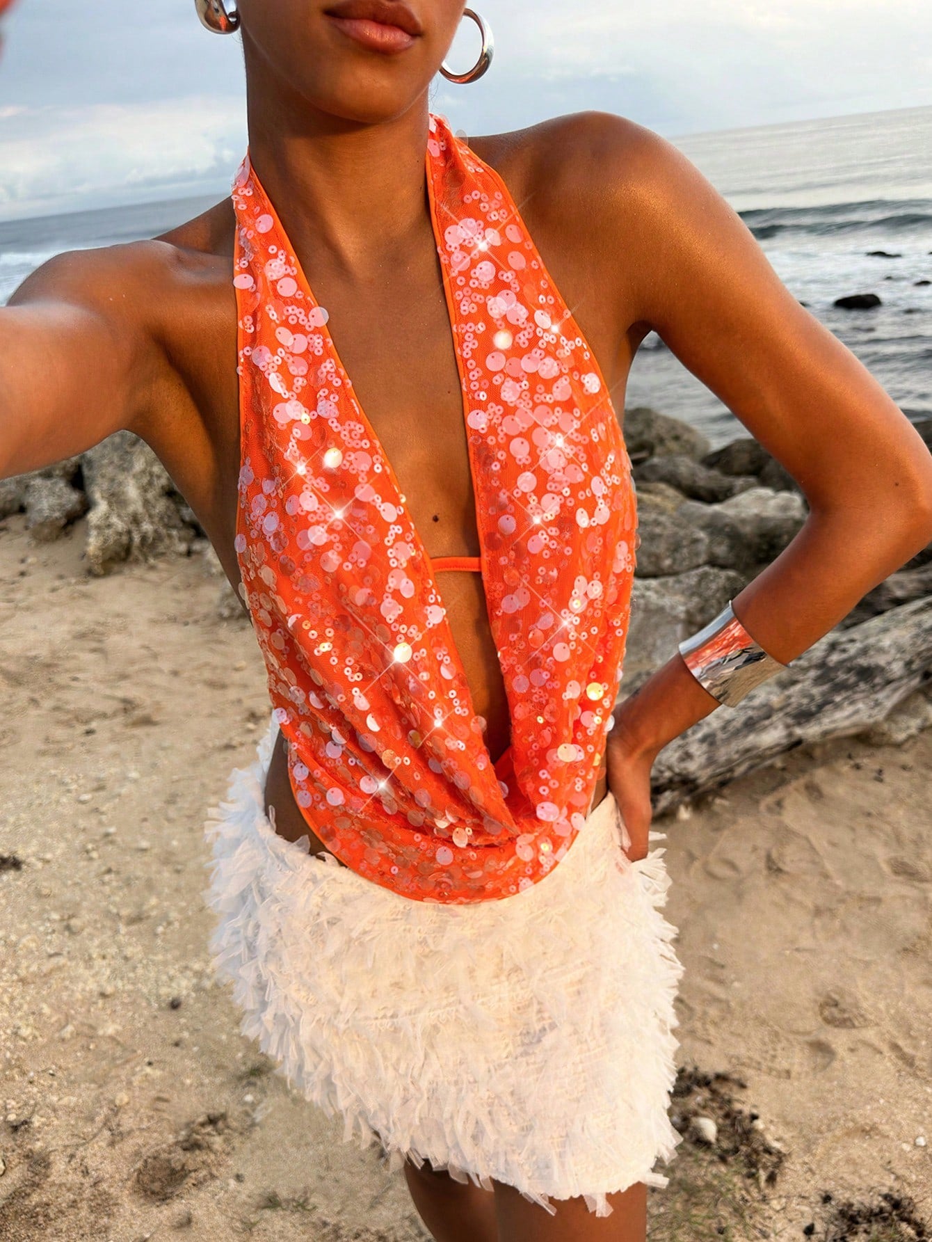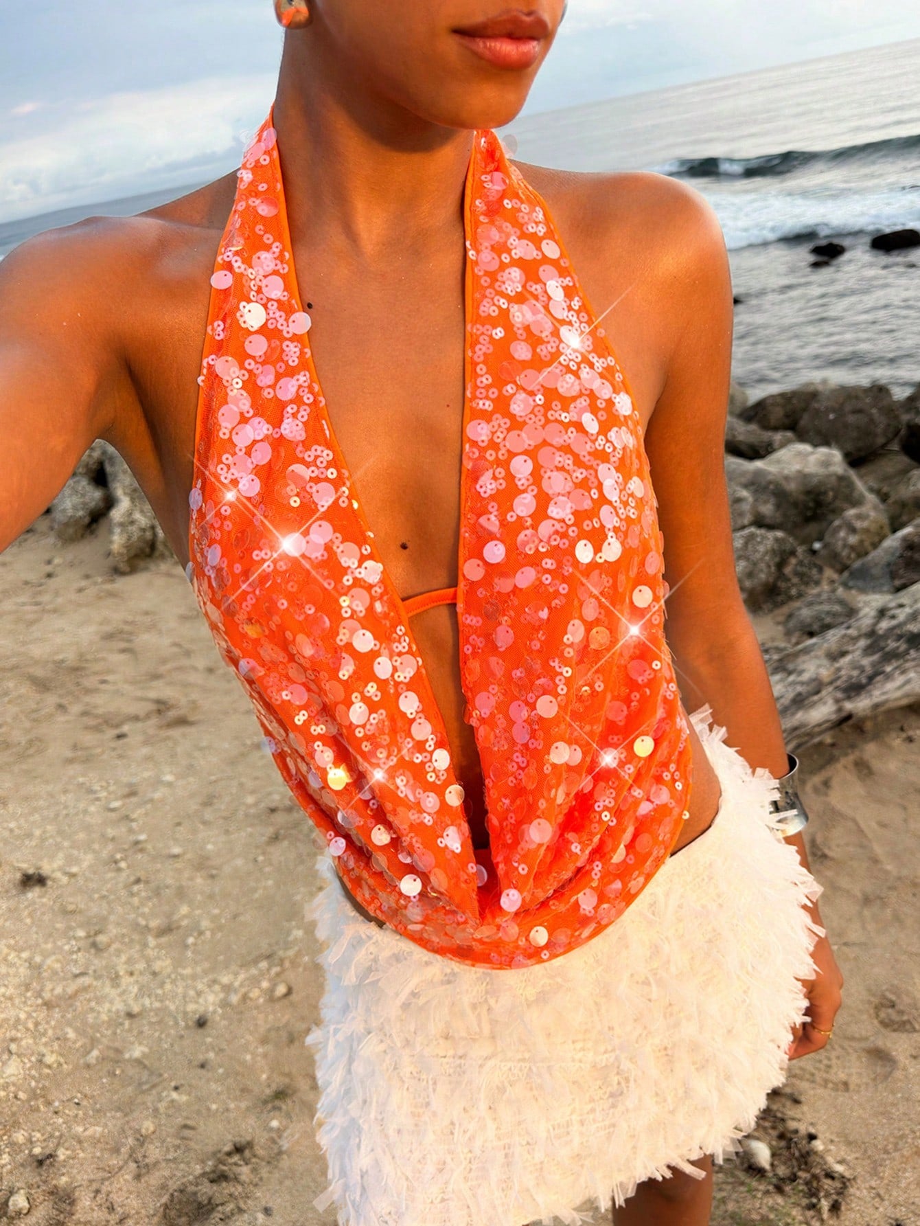 Opulessa Beach Vacation Holiday Party Outfits Graduation Party Sequin Solid Color Beaded Draped Neck Ladies Blouse