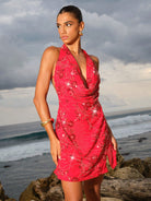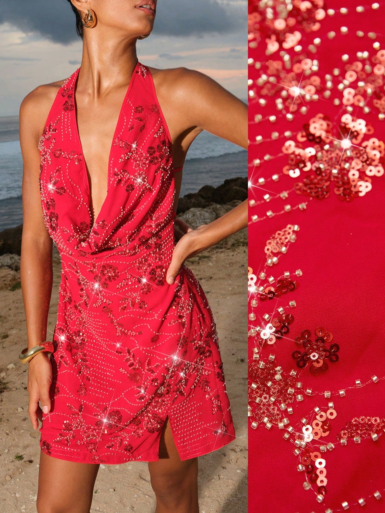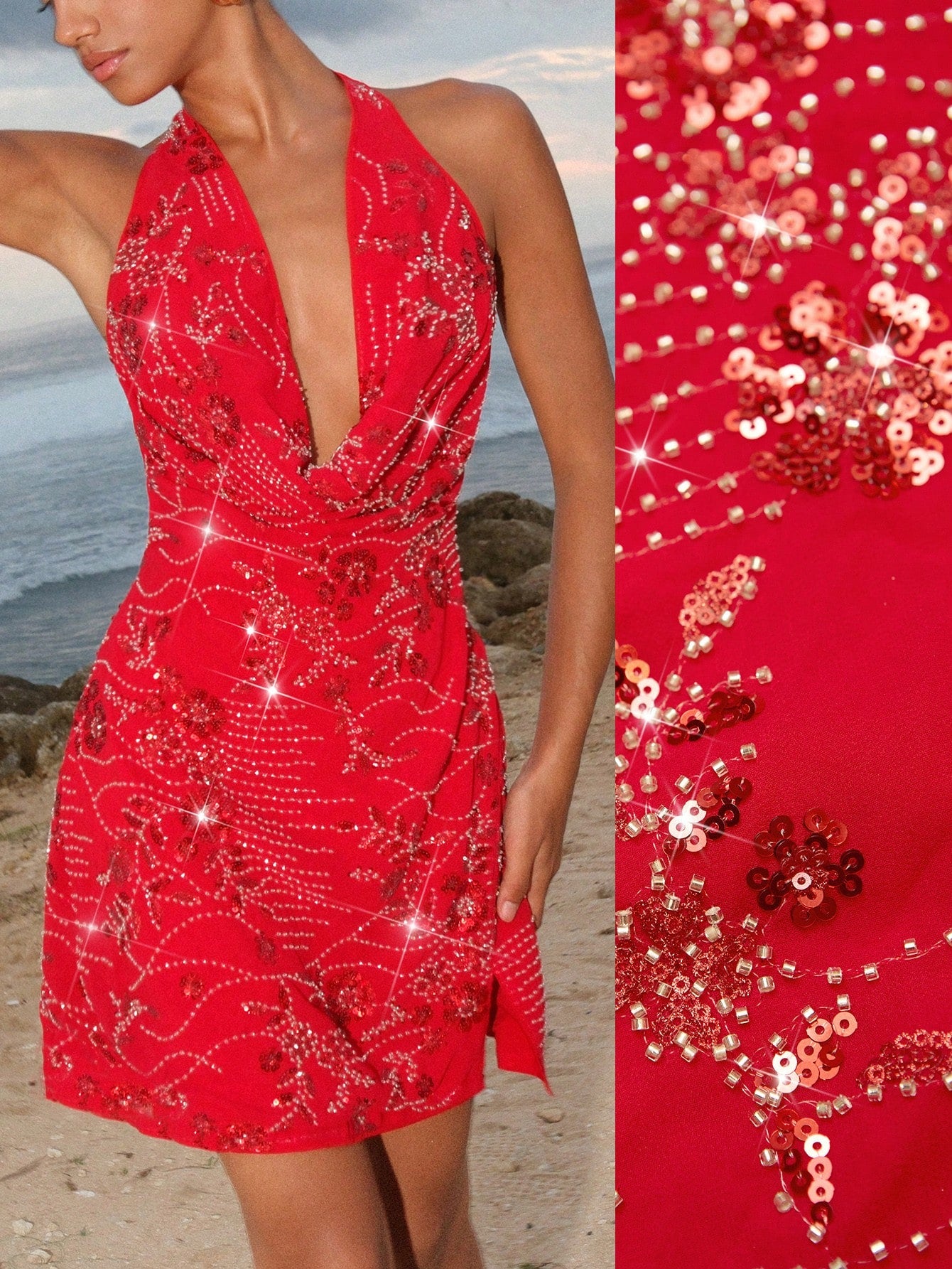 Opulessa Summer Beach Outfits Birthday Party Solid Color Flower Sequin Beaded Embroidered Fabric Halter Open Back Mini Dress For Women