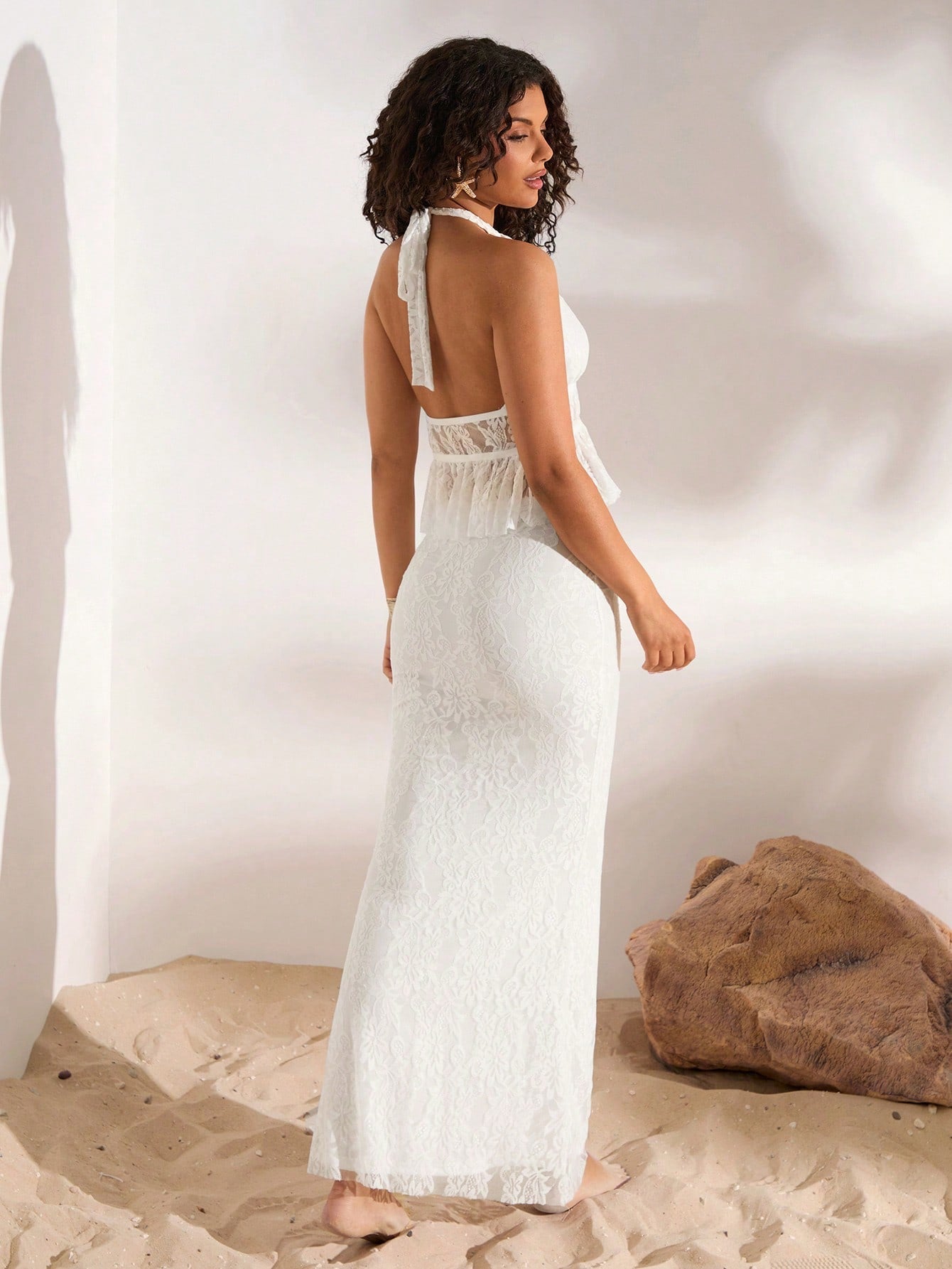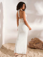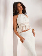Opulessa Summer Outdoor Holiday Date Set - Plain Knitted Lace Necktie Top With A Full Back And Ruffled Hem Floor-Length Skirt For Ladies. Summer Beach Set For Vacation