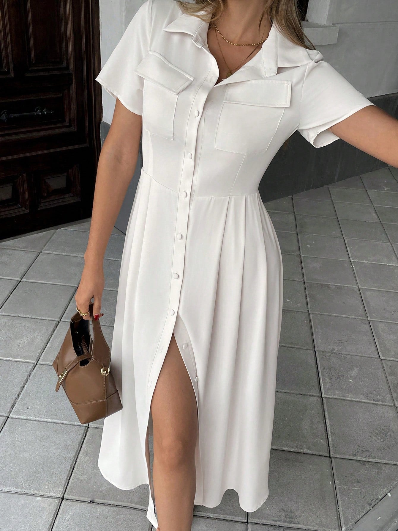 Pariaura Apricot Ruffle Hem Pocket Shirt Dress, Casual Elegant Commuter Long Dress For Women