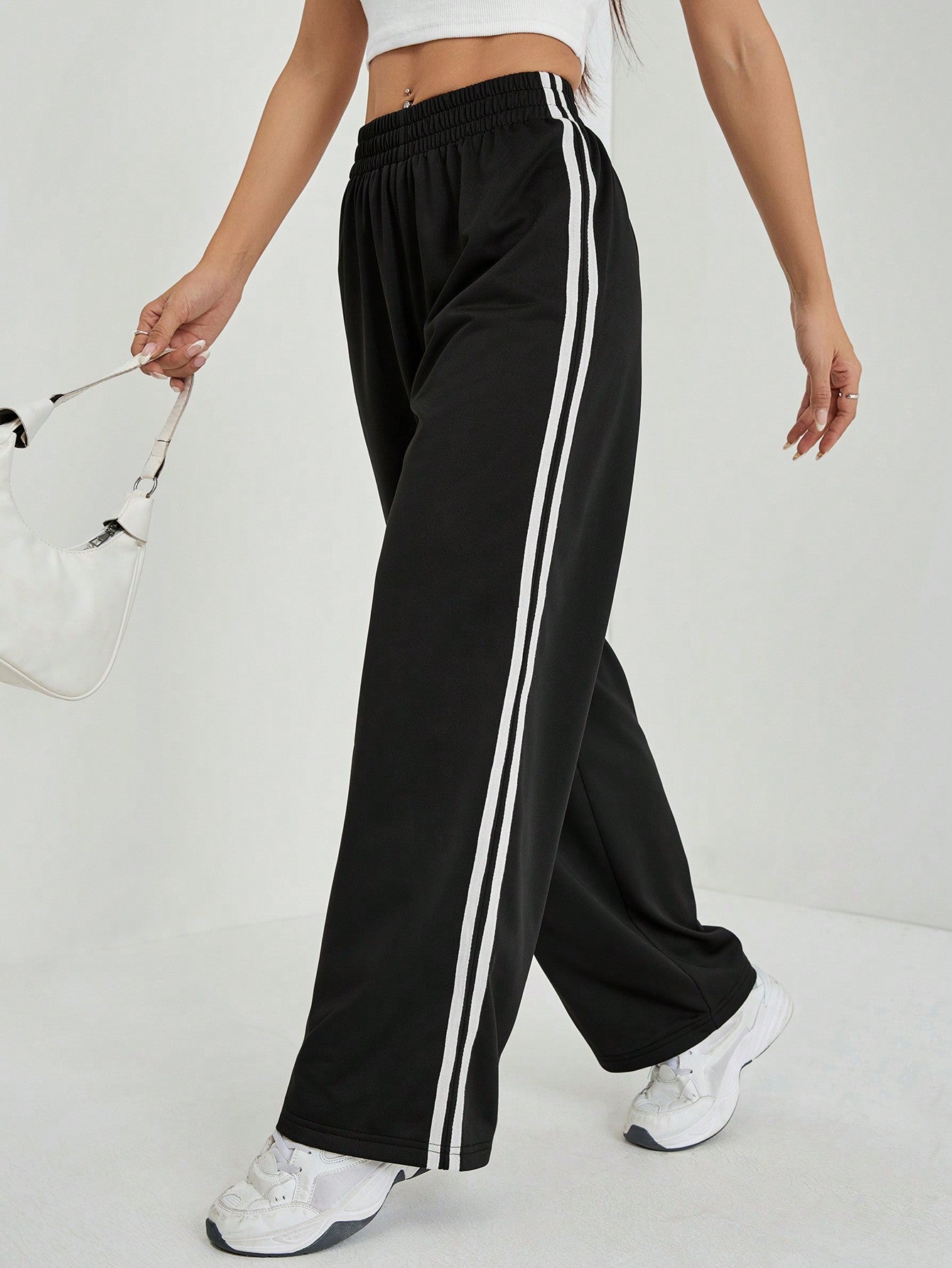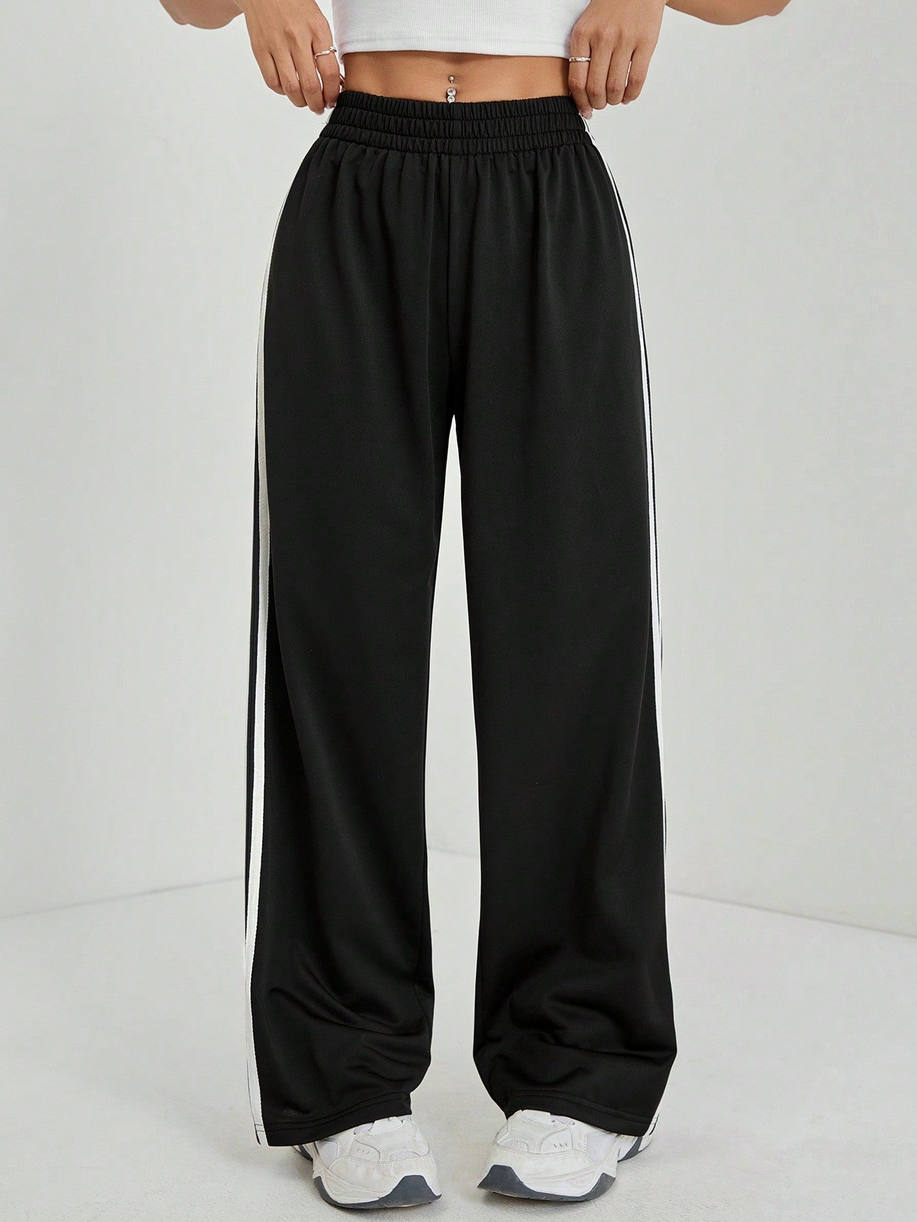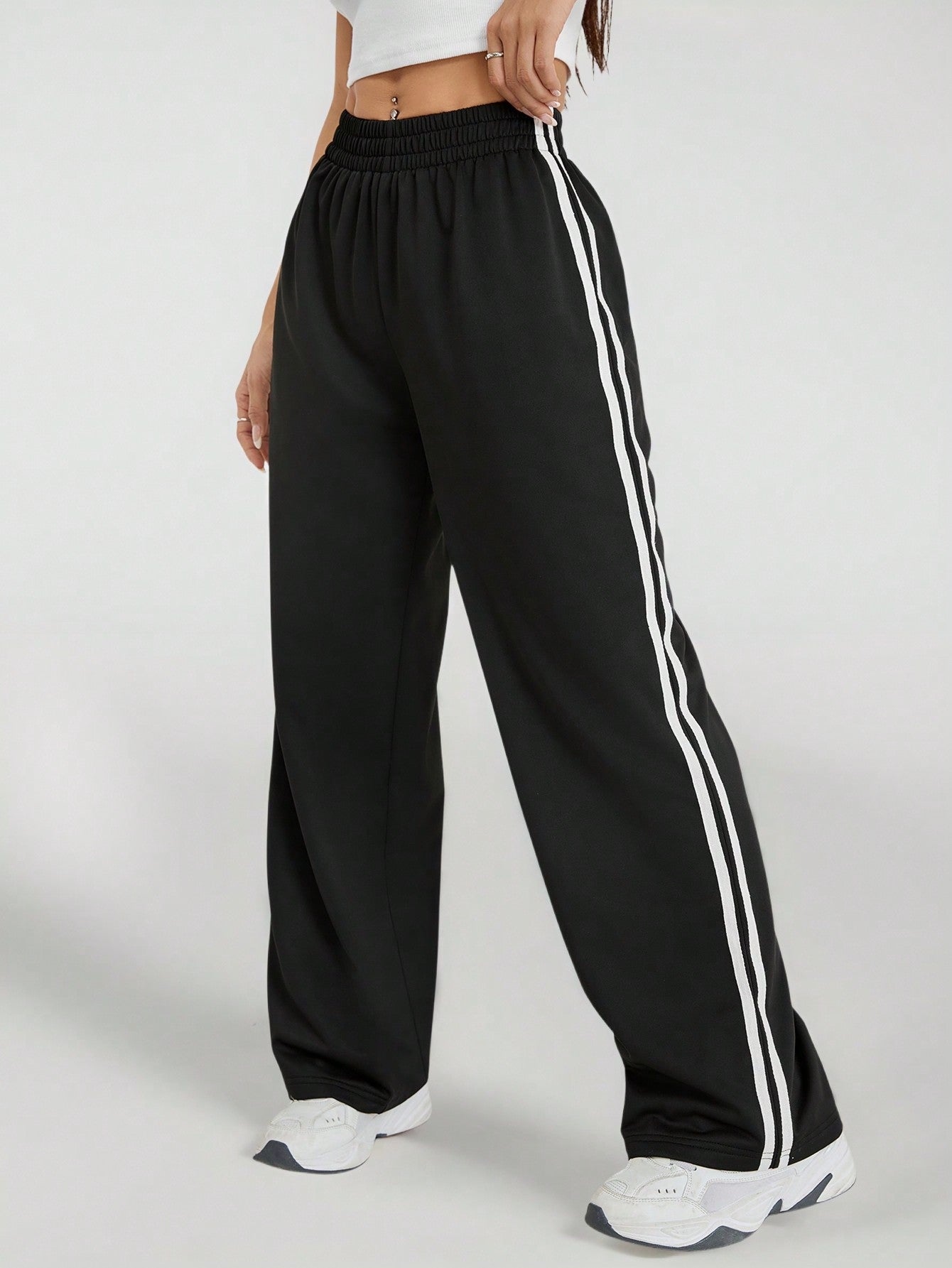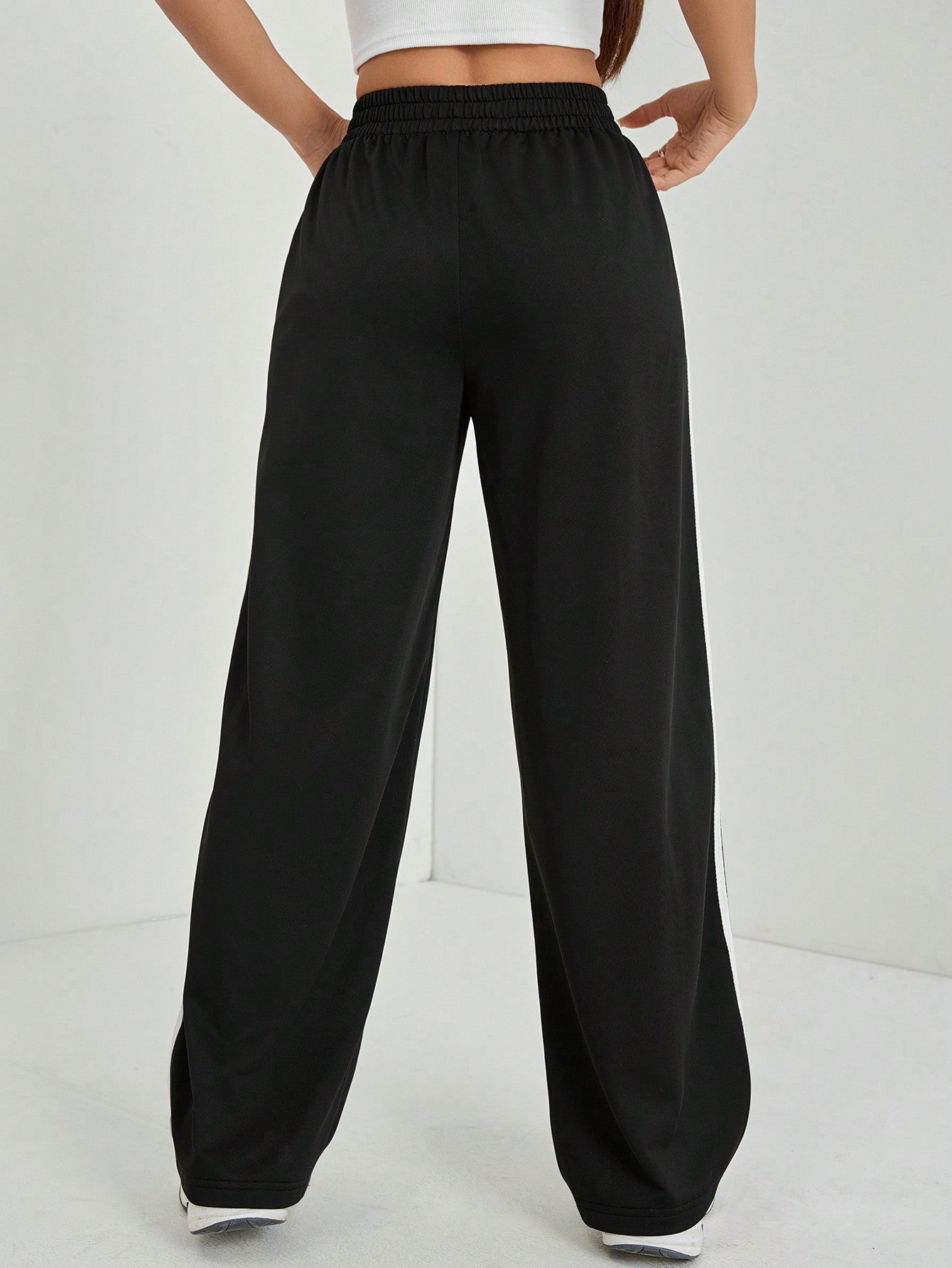 PETITE Casual Black Side Striped Trousers Solid Color Fashionable Graduation