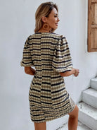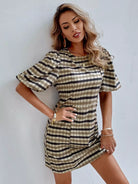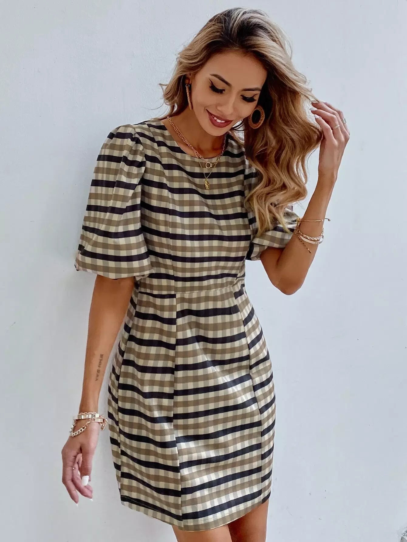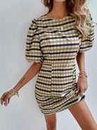 Plaid Bishop Sleeve Fitted Dress Without Belt