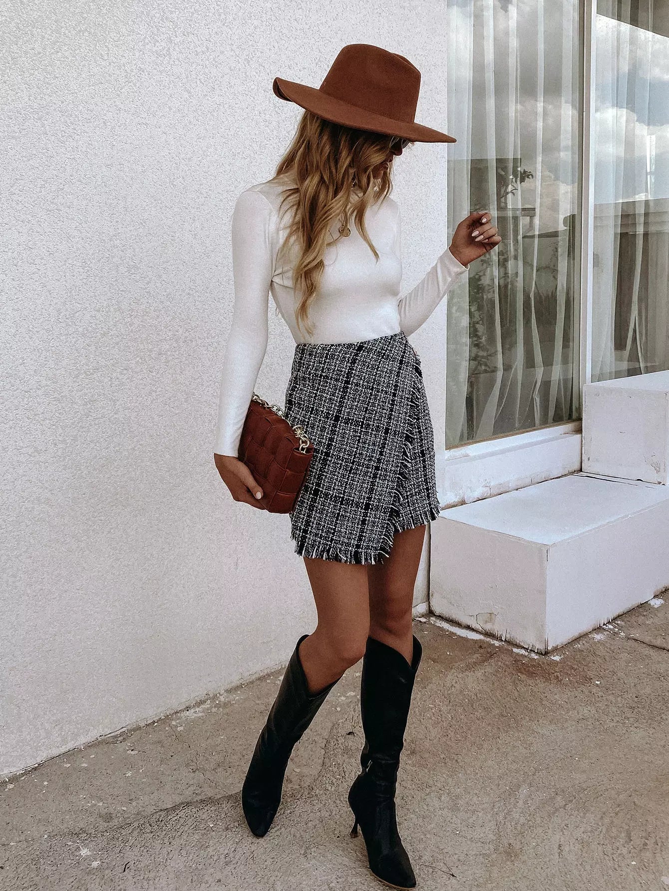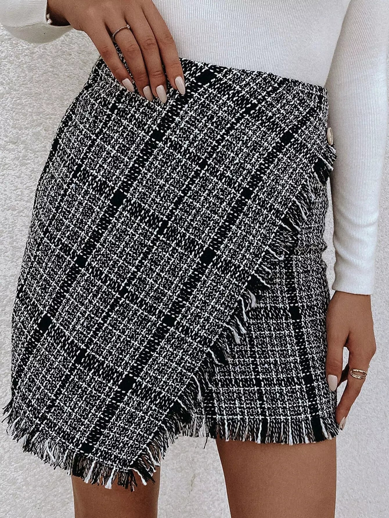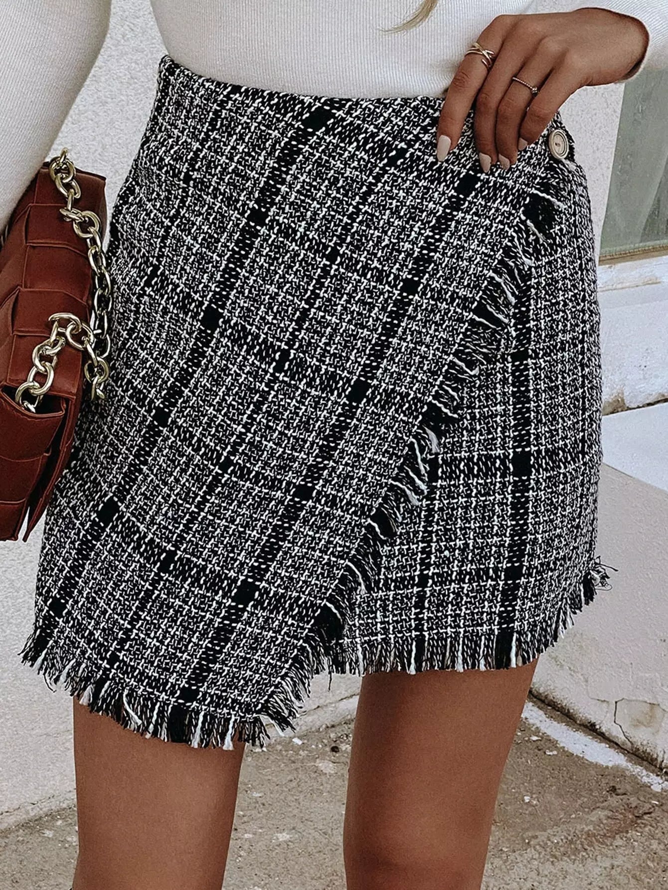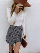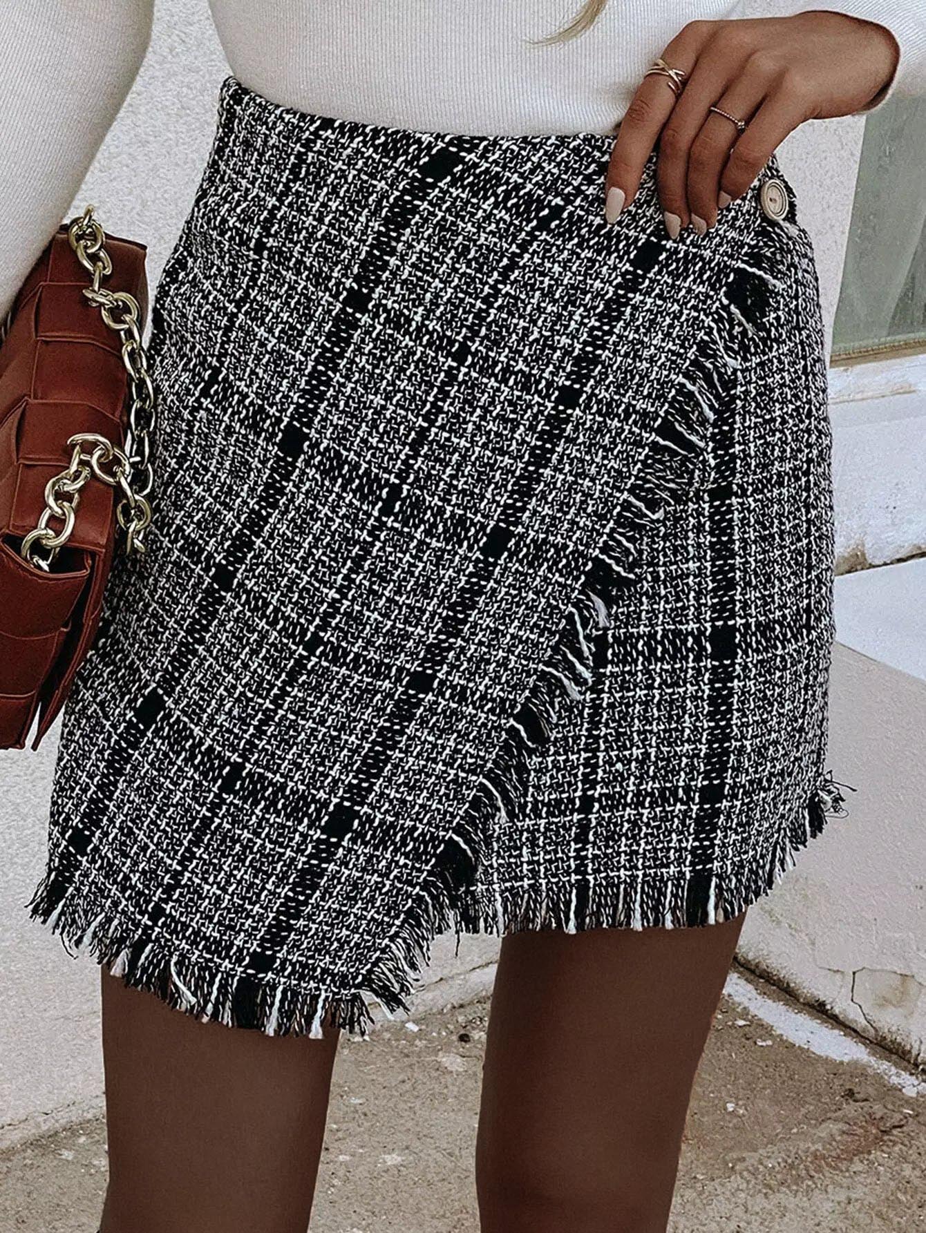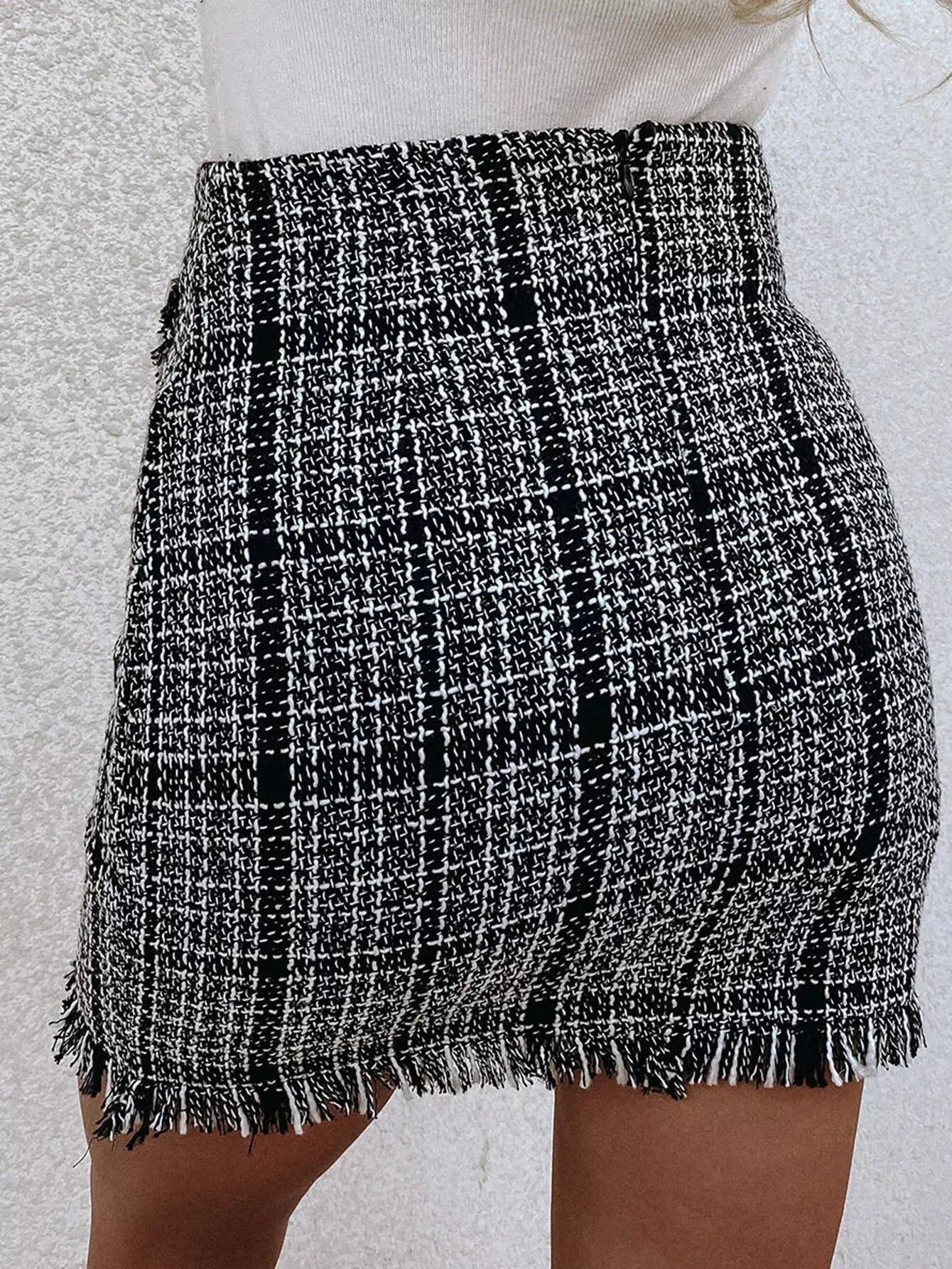Plaid Fringe Trim Tweed Skirt