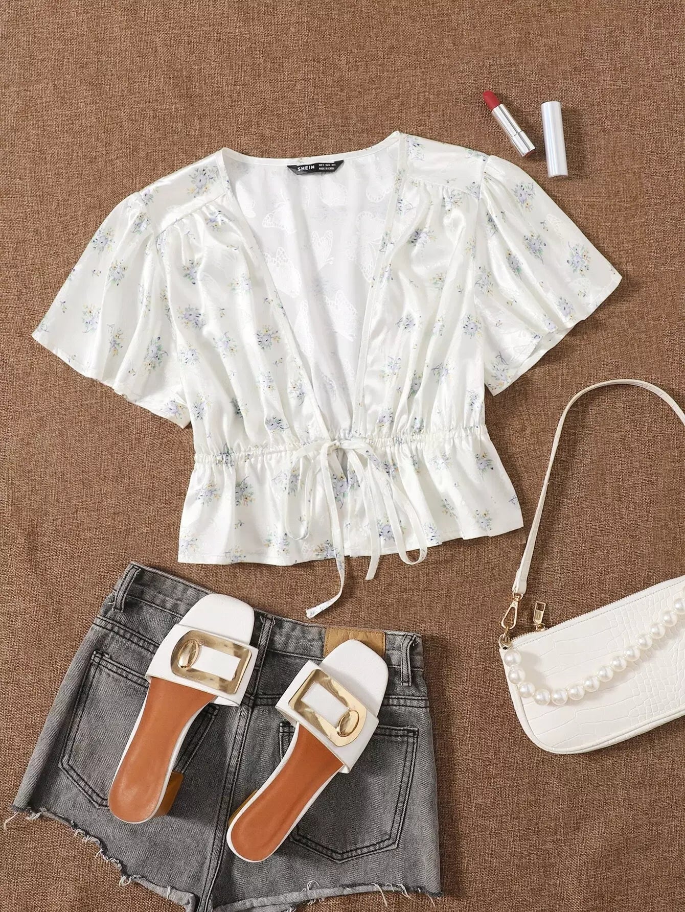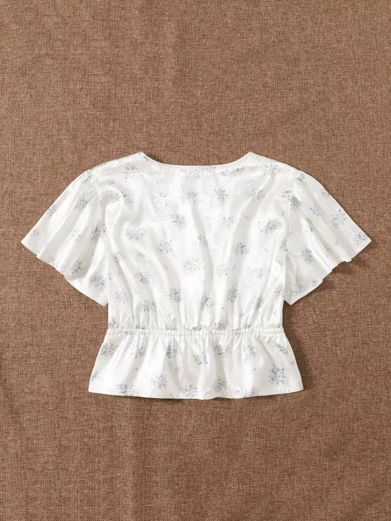 Plunging Neck Tie Front Floral and Butterfly Print Top