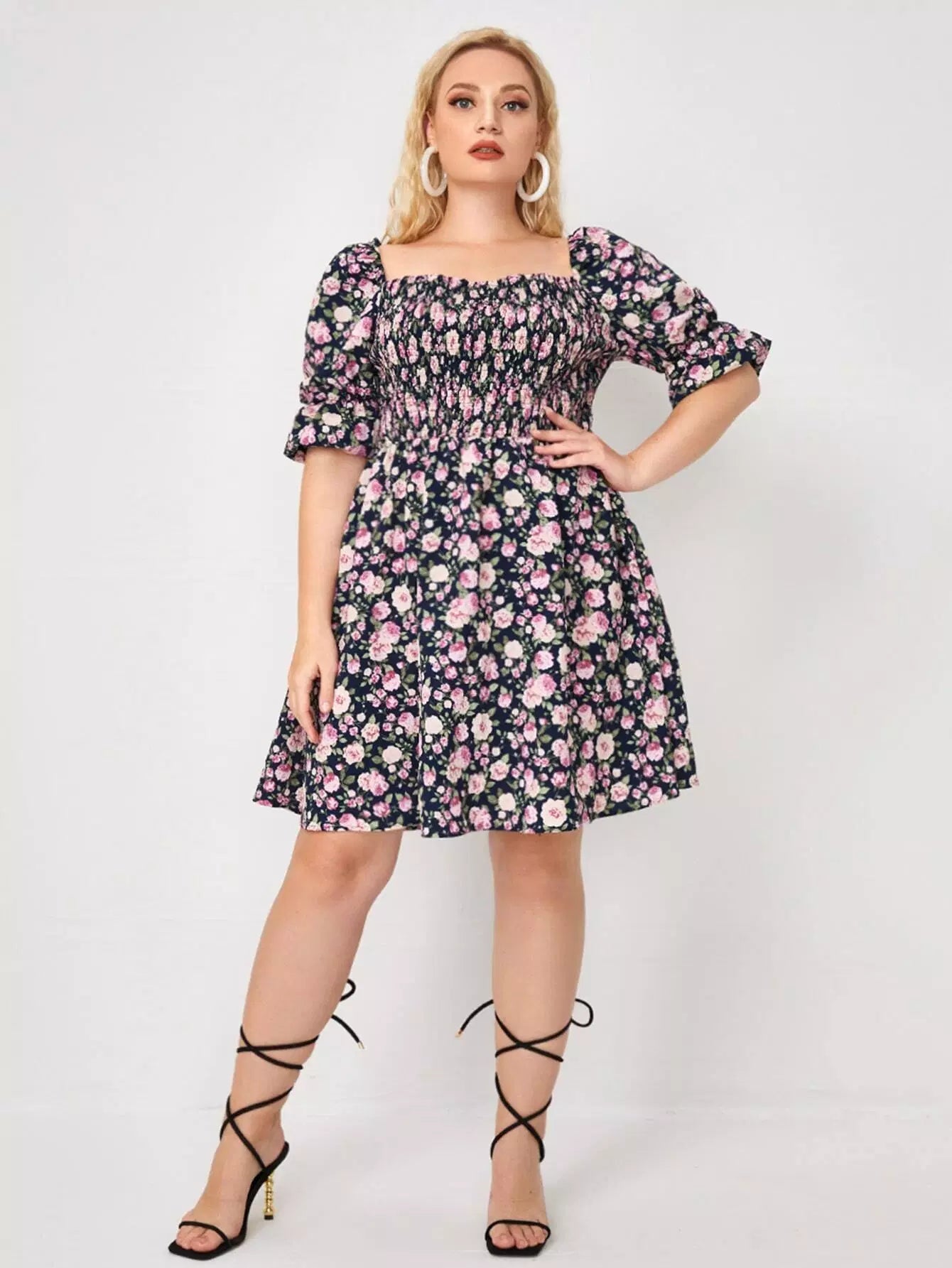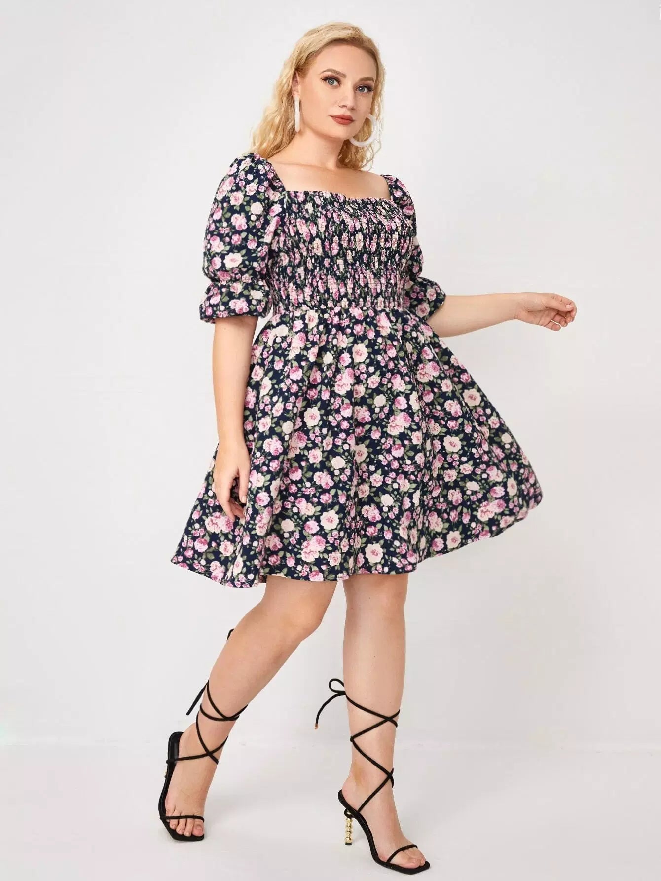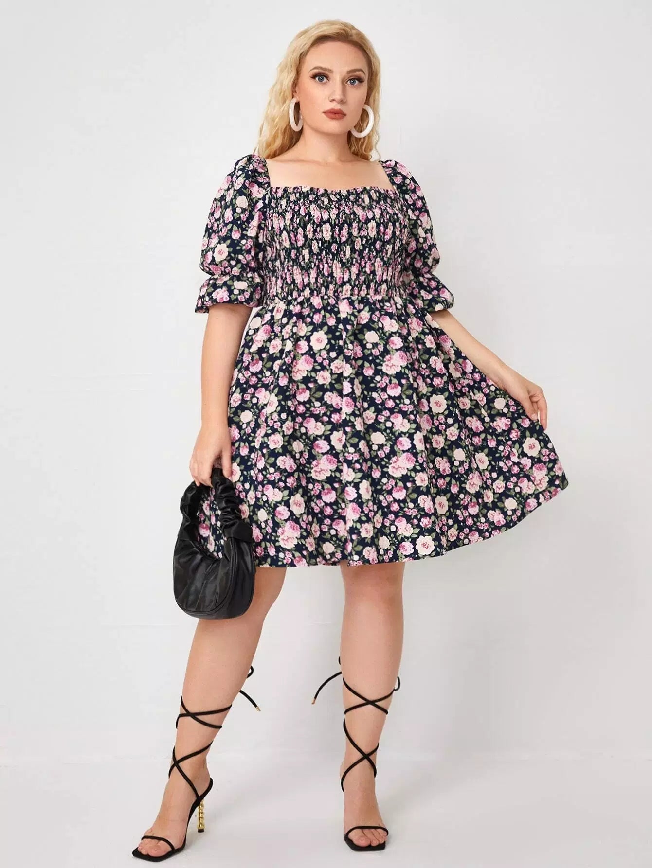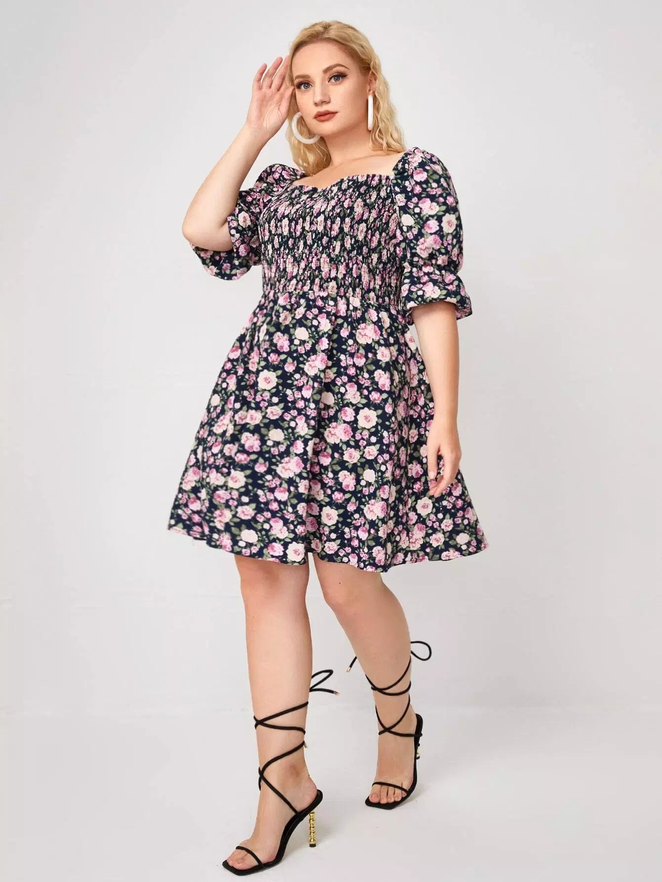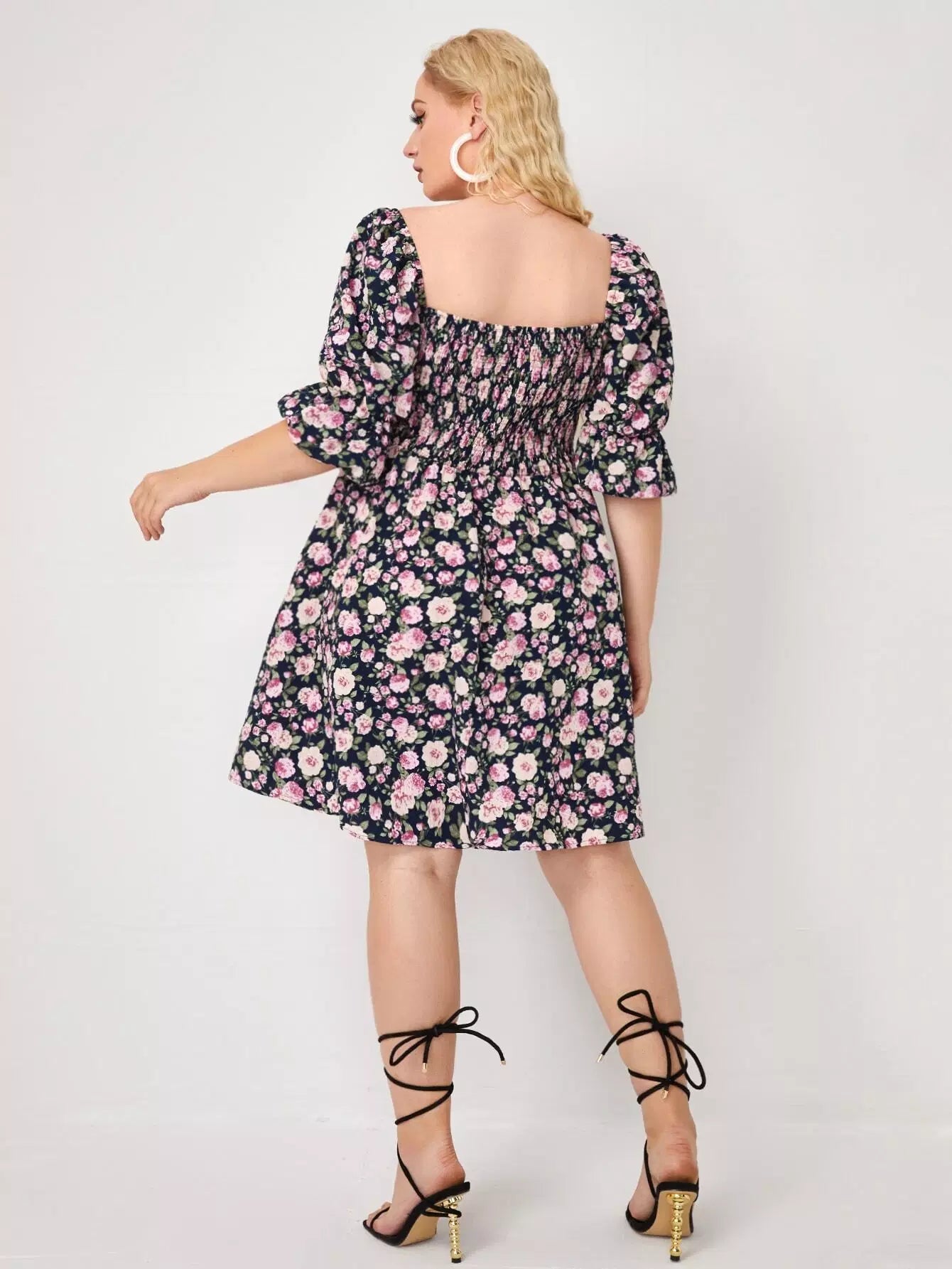 Plus Allover Floral Print Shirred Panel Milkmaid Dress