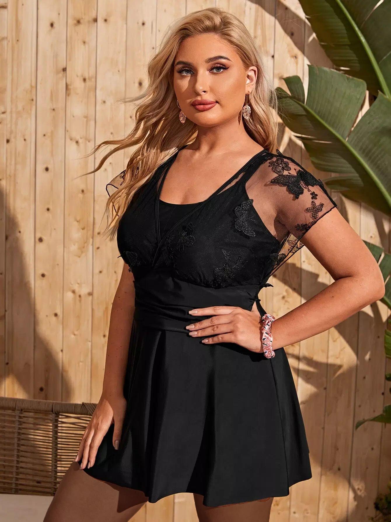 Plus Appliques Contrast Mesh Bikini Swimsuit