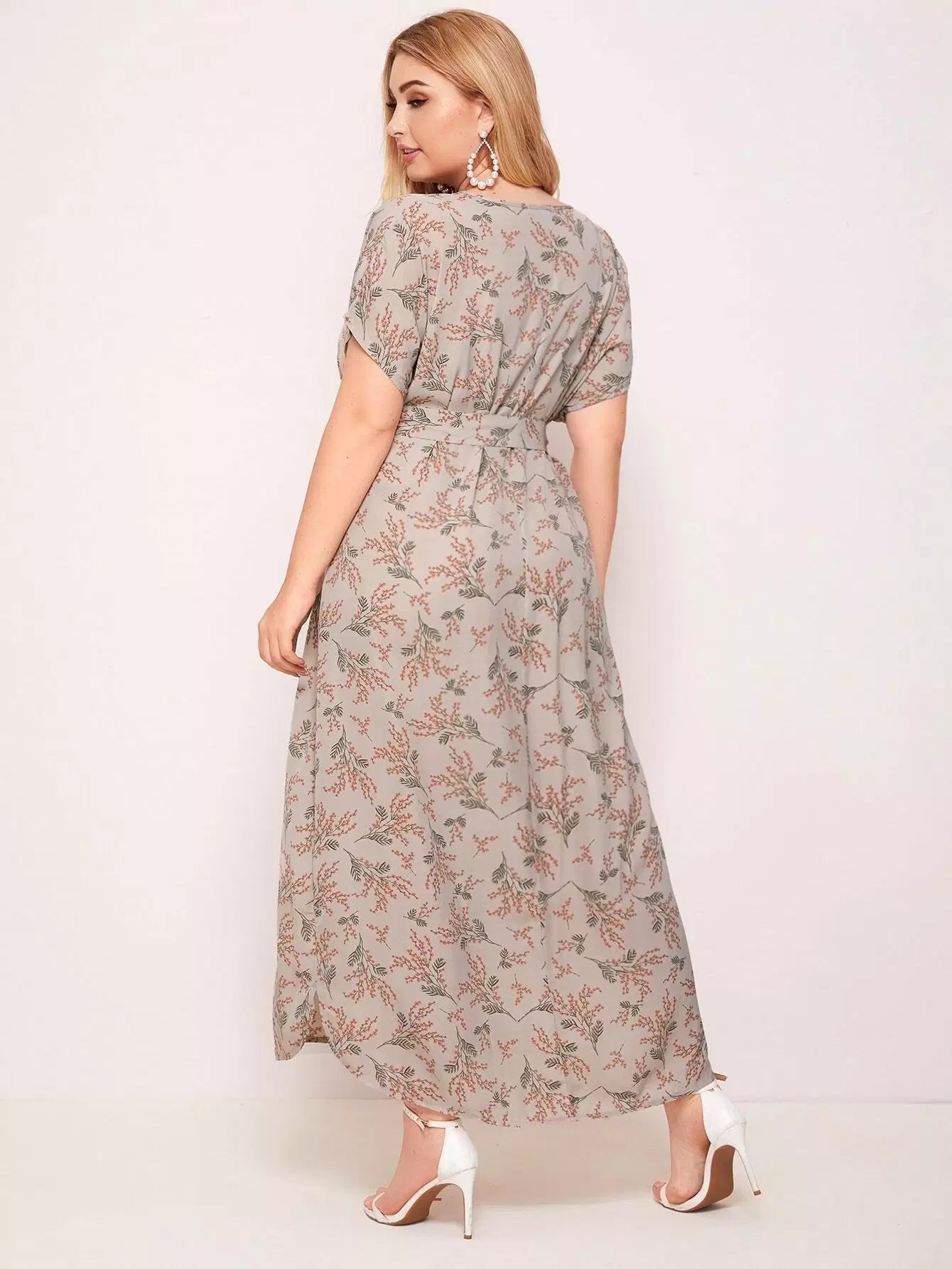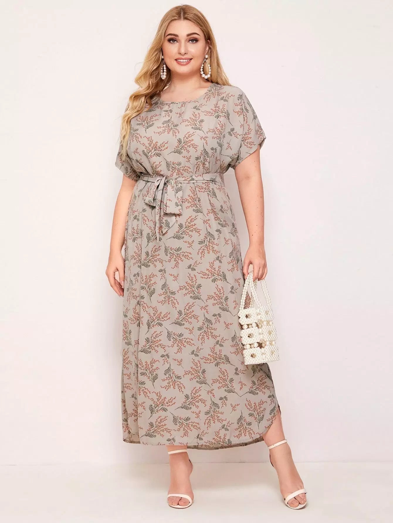 Plus Batwing Sleeve Curved Hem Floral Dress Without Belt