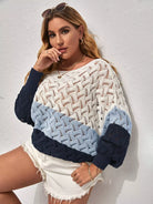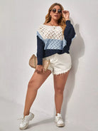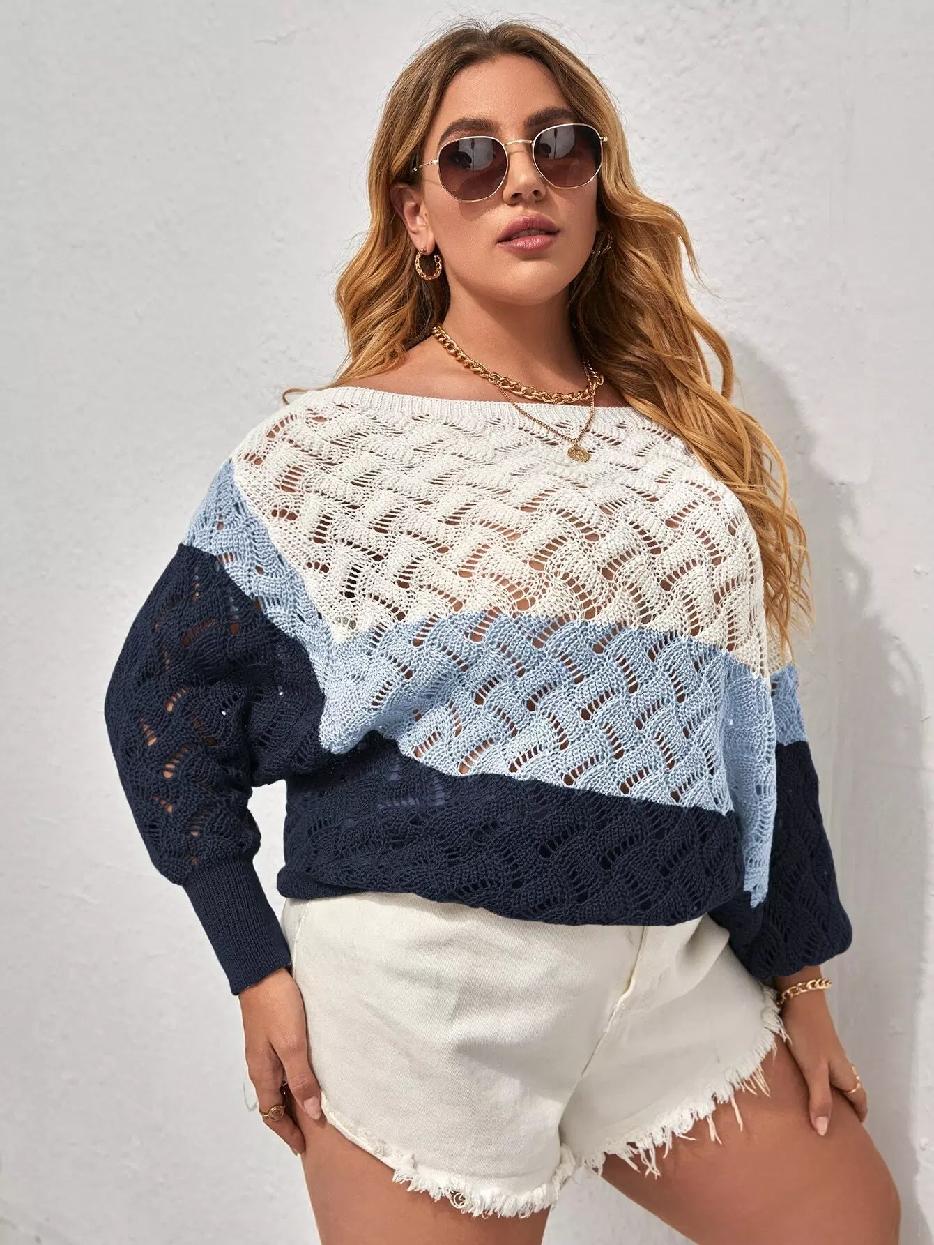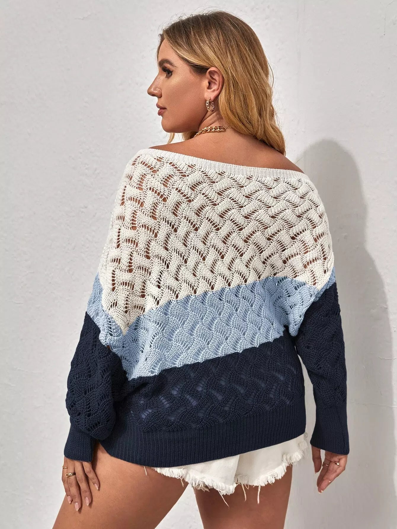 Plus Boat Neck Pointelle Knit Color Block Dolman Sleeve Sweater