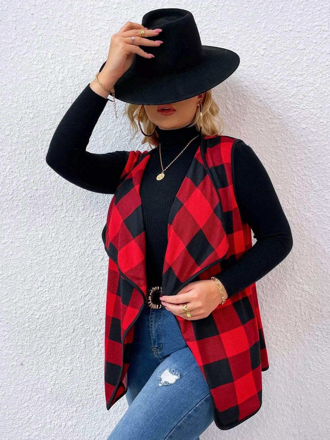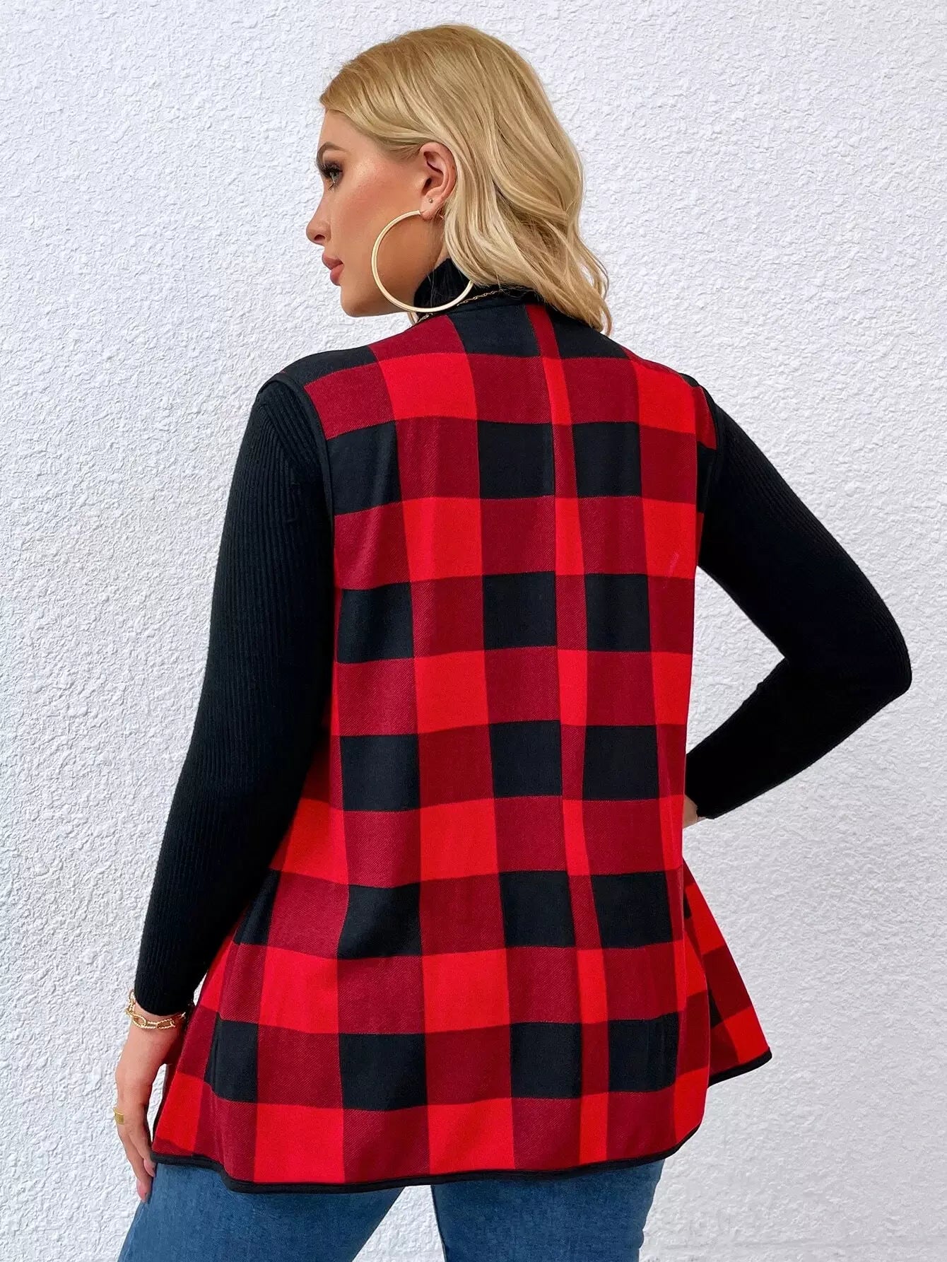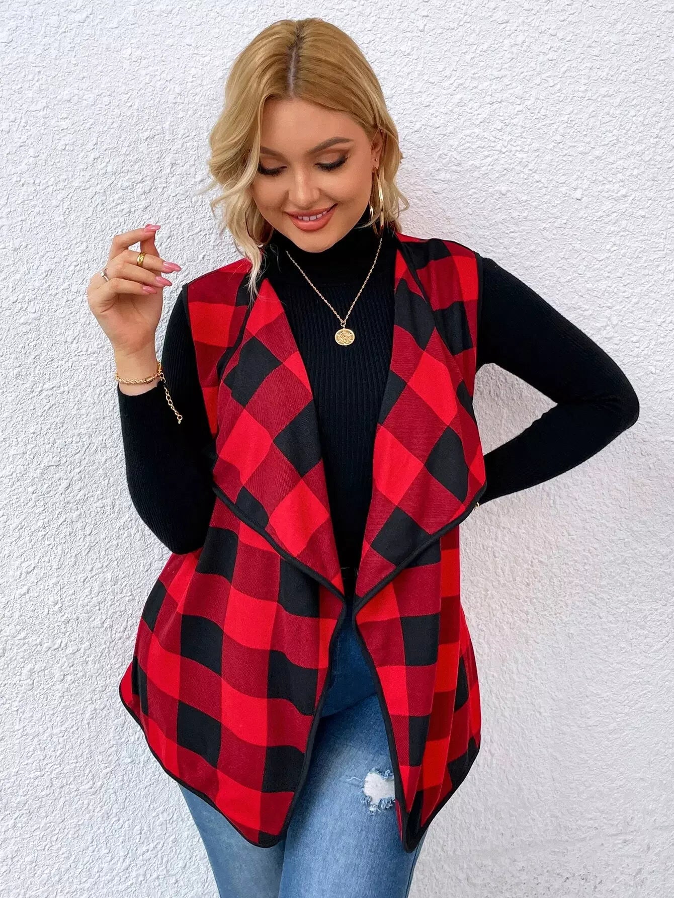 Plus Buffalo Plaid Print Open Front Vest Coat