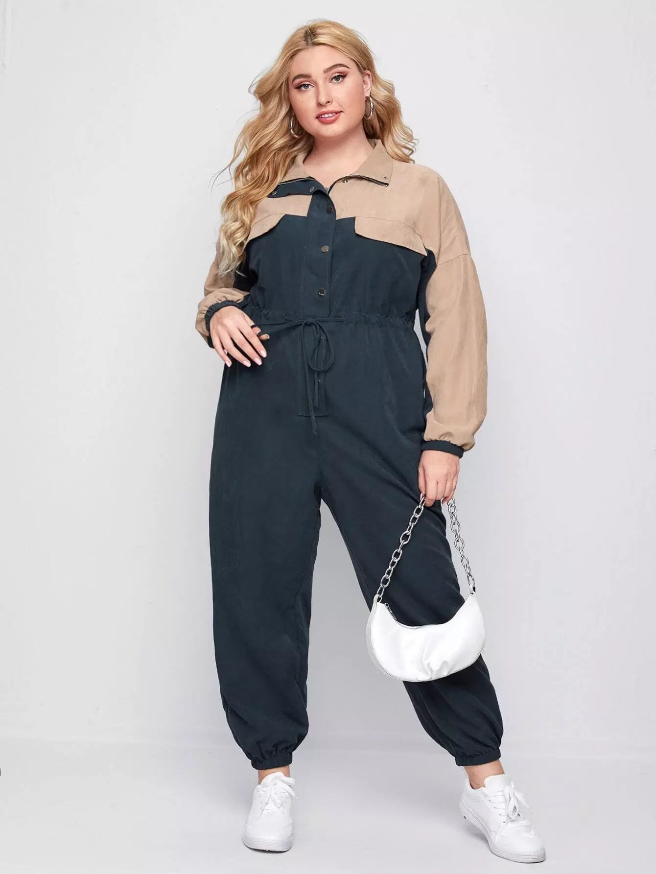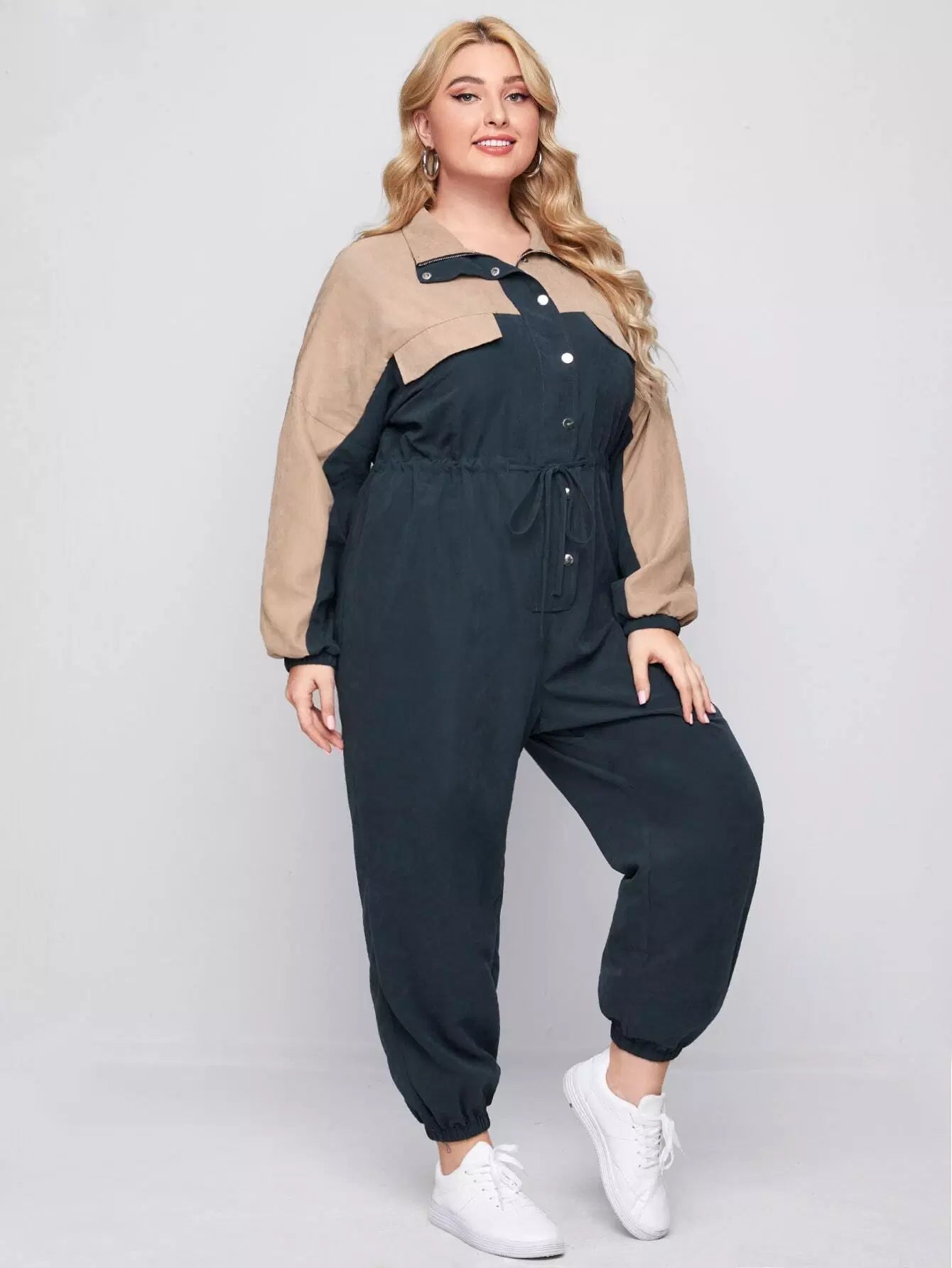 Plus Button Front Drawstring Waist Colorblock Jumpsuit